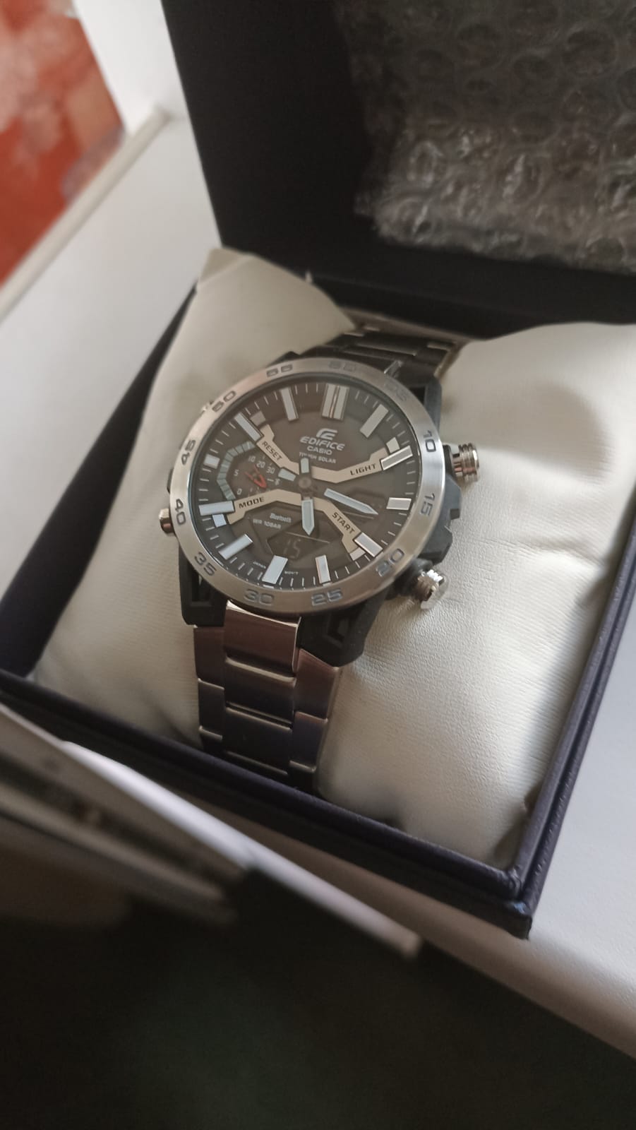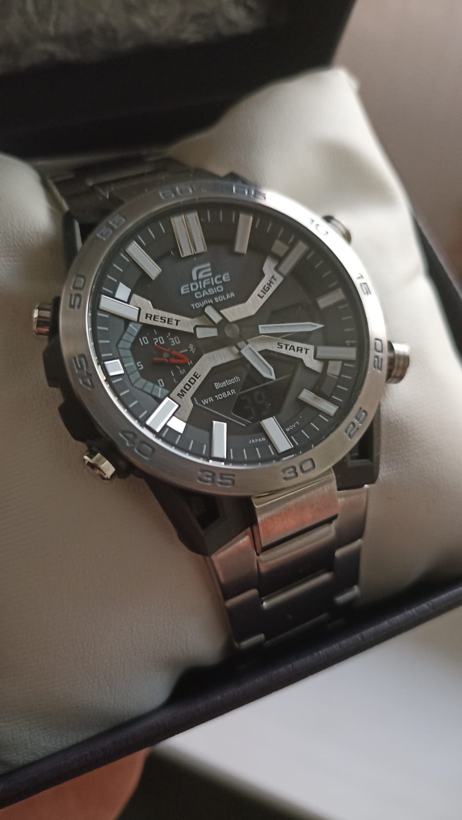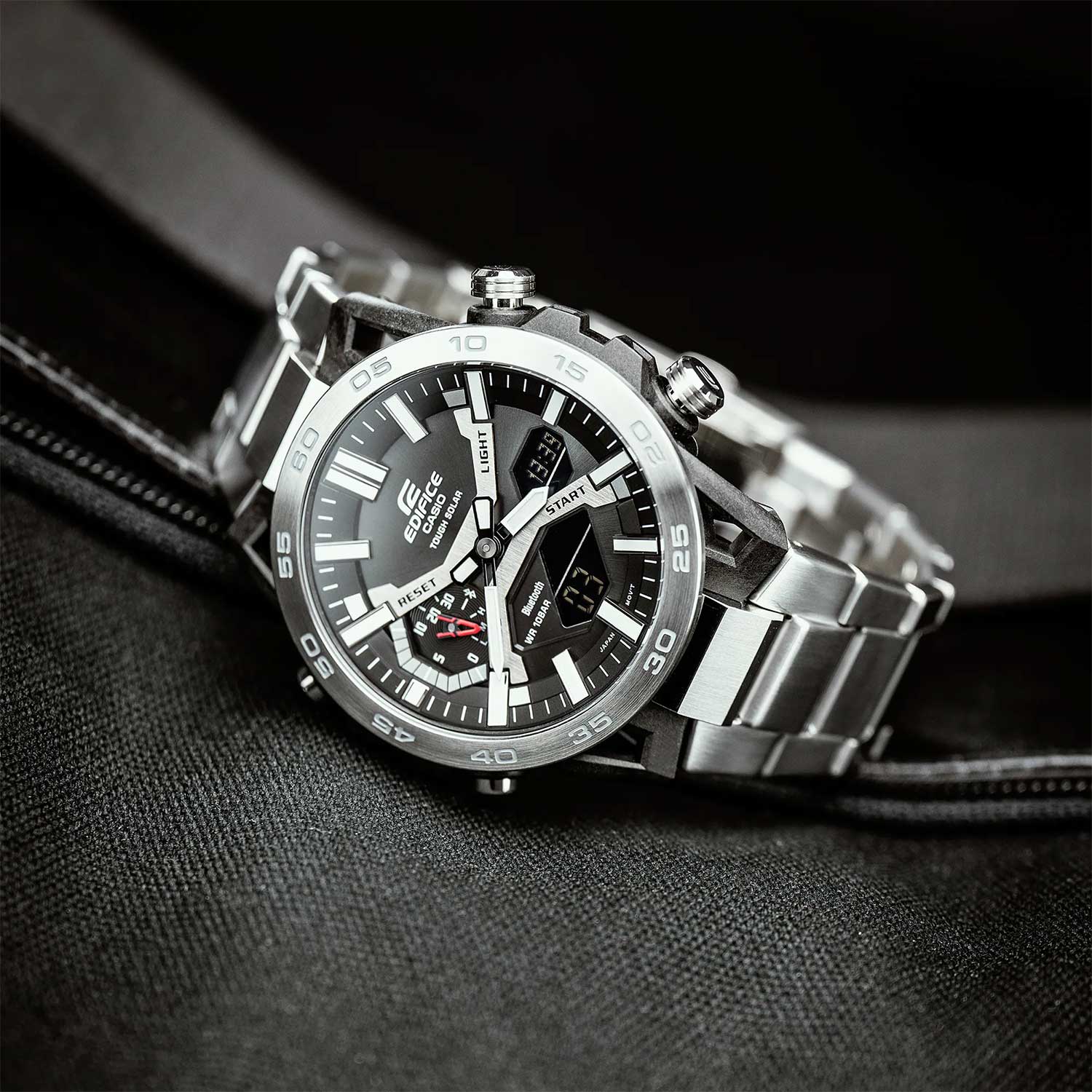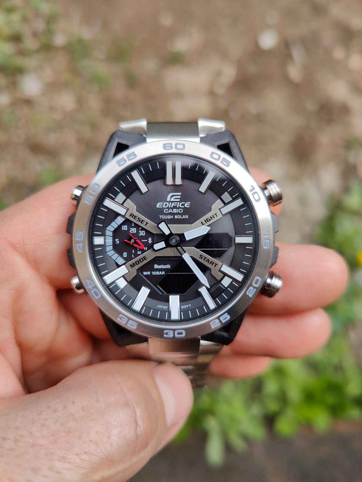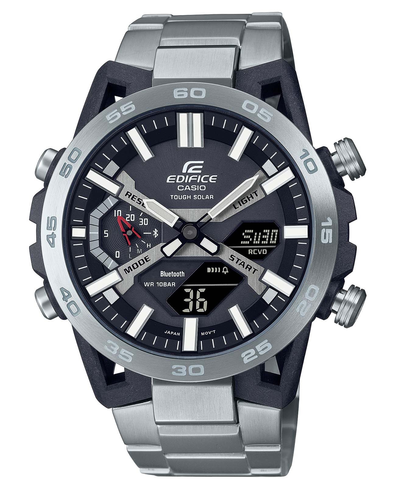 Многофункциональные японские мужские часы Casio Edifice ECB-2000D-1A.Супер стильный релиз в коллекции Edifice из топовой аналого-цифровой серии ECB-2000. Среди функций питание от солнечной энергии Tough Solar, автоматическое сохранение энергии .Время работы аккумулятора без подзарядки приблизительно 7 месяцев, при включенной функции сохранения энергии приблизительно 18 месяцев.. Двойная светодиодная подсветка Super Illuminator с функцией Afterglow. Цвет подсветки: белый. 12-ти и 24-х часовой формат времени. Секундомер с двумя точностями показаний: 1/100с (до 1ч) и 1с (после 1ч) и временем измерения 24ч. SPLIT-хронограф. Таймер обратного отсчета от 1с до 24ч. Мировое время – 38 часовых поясов, всемирное координированное время (UTC). Автоматический переход на зимнее и летнее время. Переключение между домашним и мировым временем. Беспроводная технология Bluetooth® со сверхнизким потреблением энергии для синхронизации со смартфоном. Функции перемещения стрелок, поиска телефона и включения/отключения звука. Водонепроницаемость 10 Бар в соответствии с ISO 2281. Браслет с раскладывающейся тройной застежкой, расстегиваемой одним касанием. Необритовое светонакопительное покрытие. Габариты: 47,8x51х10,8мм.