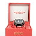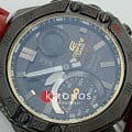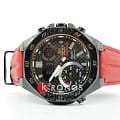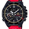 Casio Edifice ECB-10HR-1A – лимитированная модель, созданная в сотрудничестве с Honda Racing в честь 20-летия серии EDIFICE. Корпус размером 51×48,5 мм и толщиной 12,5 мм выполнен из нержавеющей стали с IP-покрытиемIP-покрытиеМетод ионного напыления. Демонстрирует повышенную устойчивость к истиранию, окислению и химическим веществам. Под воздействием высокого давления и температуры около 1500°C молекулы металла надёжно соединяются с частицами корпуса часов. чёрного цвета, обеспечивающим прочность и устойчивость к коррозии. Чёрный циферблат с карбоновыми вставками и аналогово-цифровым отображением времени защищён сапфировым стекломСапфировое стеклоПрочный и надёжный материал из кристалла сапфира синтетического происхождения, характеризующийся особой твёрдостью и устойчивостью к царапинам и повреждениям. с антибликовым покрытиемАнтибликовое покрытиеСлой оксида металла в 0,13-0,3 микрон, благодаря которому стекло часов не бликует и не отражает свет. Антибликовое покрытие уменьшает отражение света в 10 раз, обеспечивая отличную читаемость показателей циферблата., устойчивым к царапинам. Часы оснащены точным кварцевым механизмом с калибром 5618, обеспечивающим стабильное отображение времени. Функциональность модели включает BluetoothBluetoothСовременная технология, позволяющая синхронизировать часы с телефоном и переносить данные. Часы с Bluetooth расширяют возможности вашего смартфона и делают его использование ещё более удобным. для синхронизации со смартфоном, мировое времяМировое время Полезное часовое усложнение, отображающее время в основных городах и известных областях по всему миру, оно связано с часовыми поясами, удобно для путешественников и бизнесменов. , хронографХронографФункция позволяет измерять отрезки времени с особой точностью: часы, минуты, секунды. Верным признаком хронографа является наличие на циферблате 3 дополнительных окошек-счётчиков., таймерТаймерОтсчитывает секунды в обратном направлении в заданном интервале времени., будильникБудильникБуди́льник — часы, в заданный момент времени подающие звуковой, световой и/или в редких случаях другой сигнал. и автоматический календарь. Ремешок из красной натуральной кожи оснащён стандартной классической застёжкой, обеспечивающей комфортное ношение и надёжную фиксацию на запястье. Водозащита до 100 метров (10 бар) позволяет использовать часы при плавании и других водных видах спорта. Дизайн модели вдохновлён чёрно-красной цветовой гаммой униформы команды Honda F1, что подчёркивает её связь с миром автоспорта.