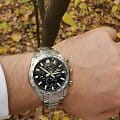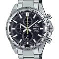 Мужские японские часы-хронограф Casio Edifice EFR-574D-1AEF. Корпус и браслет выполнены из нержавеющей стали. Минеральное стеклоМинеральное стеклоМинеральное стекло представляет собой искусственно выращенный минерал кварца. Такое стекло отличается особой устойчивостью к повреждениям и царапинам. Уступает по некоторым качествам сапфировому стеклу. устойчивое к мелким механическим повреждениям. Окошко даты и дня недели находится в положении 3 часа. Часы оснащены тахиметромТахиметрРазмеченная шкала, располагается на ободке или безеле часов. Тахиметр позволяет рассчитать скорость на определённом участке пути, расстояние измеряется в километрах или милях. и с секундомеромСекундомерСекундоме́р — прибор, способный измерять интервалы времени с точностью до долей секунды.. Стрелки и метки с люминесцентным покрытиемЛюминесцентное покрытиеПозволяет считывать показания времени в темноте. Производители наносят на стрелки, часовые индексы, безель или поверхность циферблата светонакопительный состав, дающий холодное свечение..