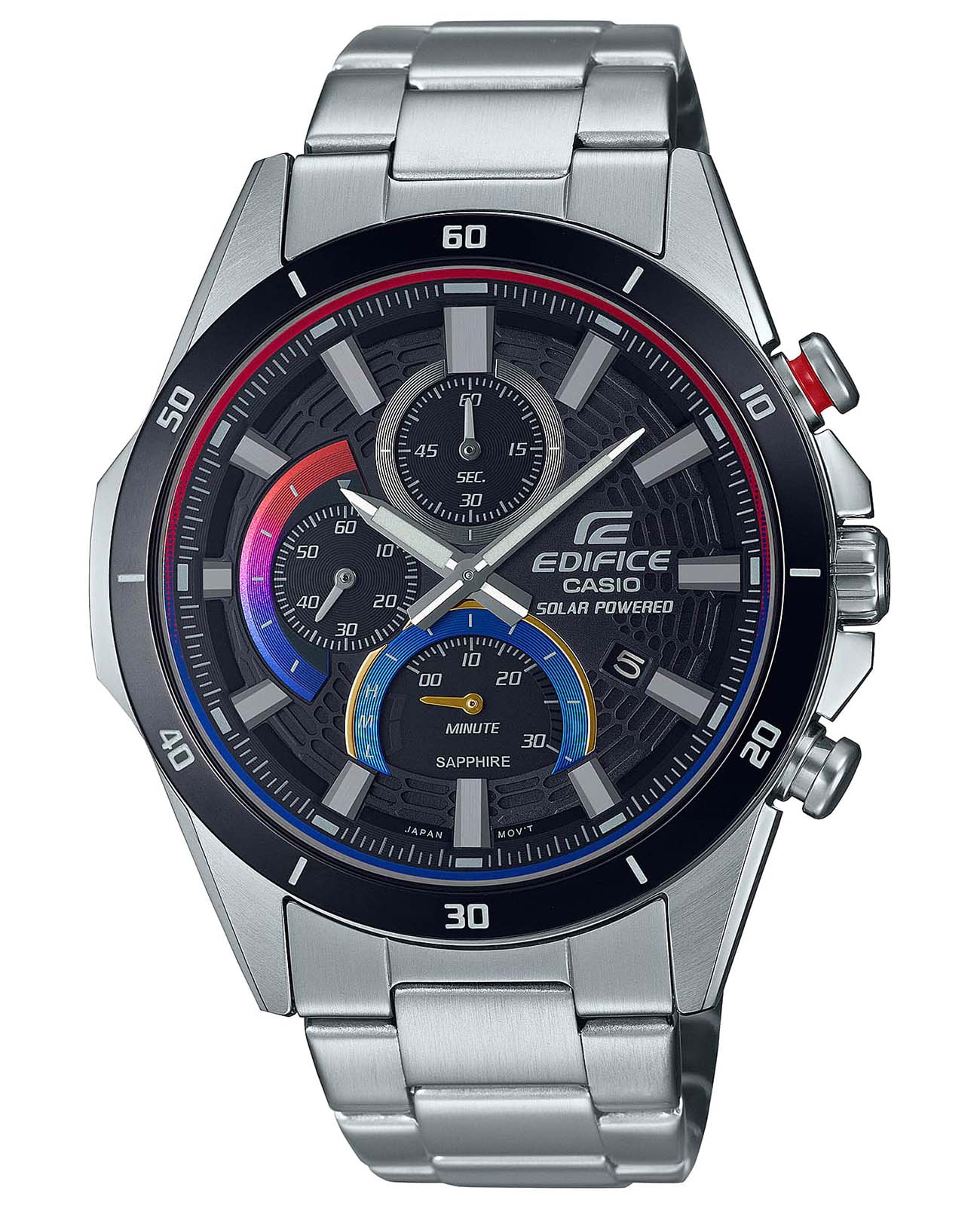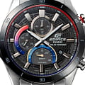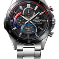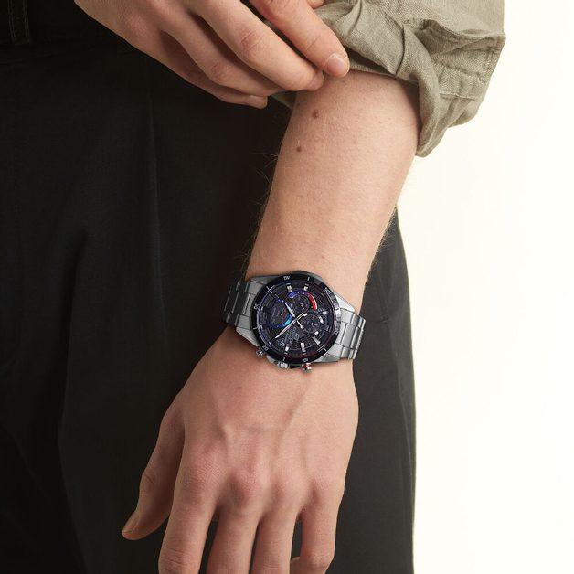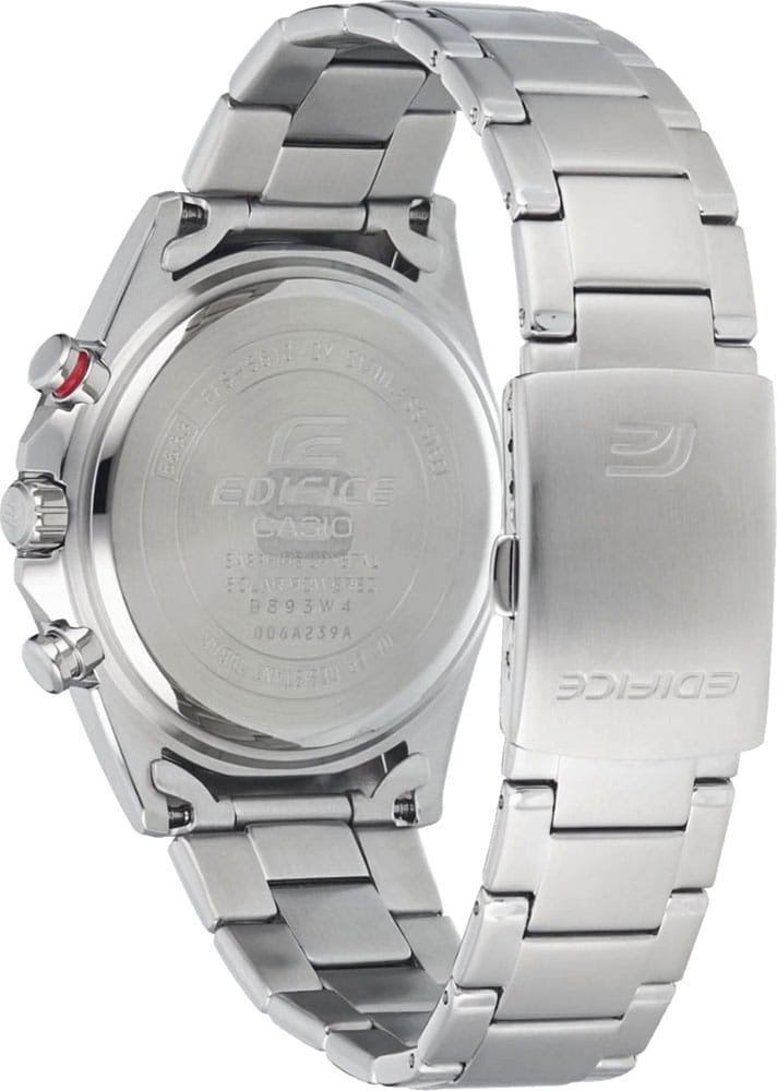 Мужские часы-хронографХронографФункция позволяет измерять отрезки времени с особой точностью: часы, минуты, секунды. Верным признаком хронографа является наличие на циферблате 3 дополнительных окошек-счётчиков. Casio Edifice EFR-571DB-1A1, кварцевый механизм с высокой точностью. Тонкий корпус толщиной менее 10 мм обеспечивает комфортную носку в любимом вами спортивном дизайне хронографа с дополнительными циферблатами. Металлический сетчатый циферблат напоминает решетку радиатора спортивного автомобиля, создавая впечатление чистой спортивной скорости, а устойчивое к царапинам сапфировое стеклоСапфировое стеклоПрочный и надёжный материал из кристалла сапфира синтетического происхождения, характеризующийся особой твёрдостью и устойчивостью к царапинам и повреждениям. обеспечивает высокую прозрачность и легкость считывания показаний. На циферблате имеется индикатор запас хода. Светонакопительное покрытие позволяет видеть время в темноте даже после непродолжительного нахождения часов на свету. Подойдут как для повседневной, так и для активной деятельности. Питание от солнечной энергии, индикатор заряда батареи. Приблизительное время автономной работы без подзарядки на свету около 6 месяцев. Долговечный стальной корпус, закрытый сапфировым стеклом с антибликовым покрытием. БезельБезельВнешний ободок, закрепляющий стекло. В спортивных часах так называется поворотное кольцо с делениями на циферблате, выполняет роль таймера – замеряет отрезки времени на шкале. Неподвижный безель – элемент декора. Однонаправленно вращающийся безель на дайверских часах позволяет фиксировать моменты погружения и выныривания на поверхность. с IP-покрытиемIP-покрытиеМетод ионного напыления. Демонстрирует повышенную устойчивость к истиранию, окислению и химическим веществам. Под воздействием высокого давления и температуры около 1500°C молекулы металла надёжно соединяются с частицами корпуса часов.. Светонакопительное покрытие NeobriteПодсветка NeobriteИспользование светонакопительных составов на основе сульфида цинка или алюмината стронция, яркий свет можно наблюдать на протяжении 6-10 часов после «зарядки» часов около источника света. продолжает светиться в темноте даже после непродолжительного пребывания на свету.СекундомерСекундомерСекундоме́р — прибор, способный измерять интервалы времени с точностью до долей секунды. с точностью показаний 1/10с и временем измерения 1ч. Корпус изготовлен из нержавеющей стали. На циферблате находится три дополнительных индикатора. Окошко даты находится в положении 4 часов. Класс водозащиты: 100 метров, позволит плавать, нырять и заниматься другими водными видами спорта. Заводная головка с защитой. Стальной браслет на раскладной застёжкеРаскладная застёжкаТакой тип застёжки используется только на браслетах из металла. Она никогда не раскрывается полностью, происходит разделение на 2 и более частей. Раскладывающая застёжка снизит вероятность потери часов к минимуму..