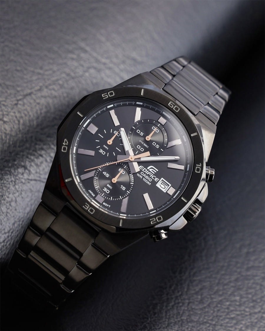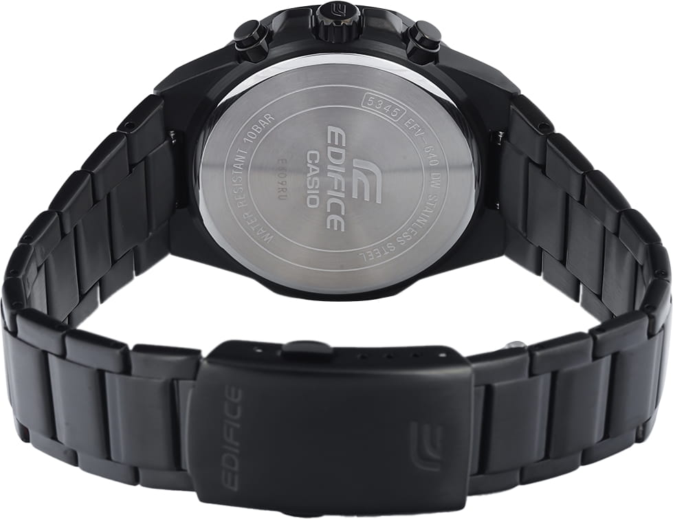 Мужские часы-хронографХронографФункция позволяет измерять отрезки времени с особой точностью: часы, минуты, секунды. Верным признаком хронографа является наличие на циферблате 3 дополнительных окошек-счётчиков. Casio Edifice EFV-640DC-1A, кварцевый механизм с высокой точностью. Минеральное стеклоМинеральное стеклоМинеральное стекло представляет собой искусственно выращенный минерал кварца. Такое стекло отличается особой устойчивостью к повреждениям и царапинам. Уступает по некоторым качествам сапфировому стеклу. устойчивое к появлению царапин, обладающее высокой прозрачностью. СекундомерСекундомерСекундоме́р — прибор, способный измерять интервалы времени с точностью до долей секунды. с точностью показаний 1/10с и временем измерения 1ч. Корпус и браслет изготовлены из нержавеющей стали с IP-покрытиемIP-покрытиеМетод ионного напыления. Демонстрирует повышенную устойчивость к истиранию, окислению и химическим веществам. Под воздействием высокого давления и температуры около 1500°C молекулы металла надёжно соединяются с частицами корпуса часов.. Циферблат выполнен по технологии Sunray (солнечные лучи). Метки в виде штрихов. На циферблате три дополнительных индикатора, окошко даты в положении 3 часов. Стрелки с люминесцентным покрытиемЛюминесцентное покрытиеПозволяет считывать показания времени в темноте. Производители наносят на стрелки, часовые индексы, безель или поверхность циферблата светонакопительный состав, дающий холодное свечение.. Класс водозащиты: 100 метров, позволит плавать, нырять и заниматься другими водными видами спорта. Заводная головка с защитой. Батарея рассчитана на 2 года. Стальной браслет на раскладной застёжкеРаскладная застёжкаТакой тип застёжки используется только на браслетах из металла. Она никогда не раскрывается полностью, происходит разделение на 2 и более частей. Раскладывающая застёжка снизит вероятность потери часов к минимуму..