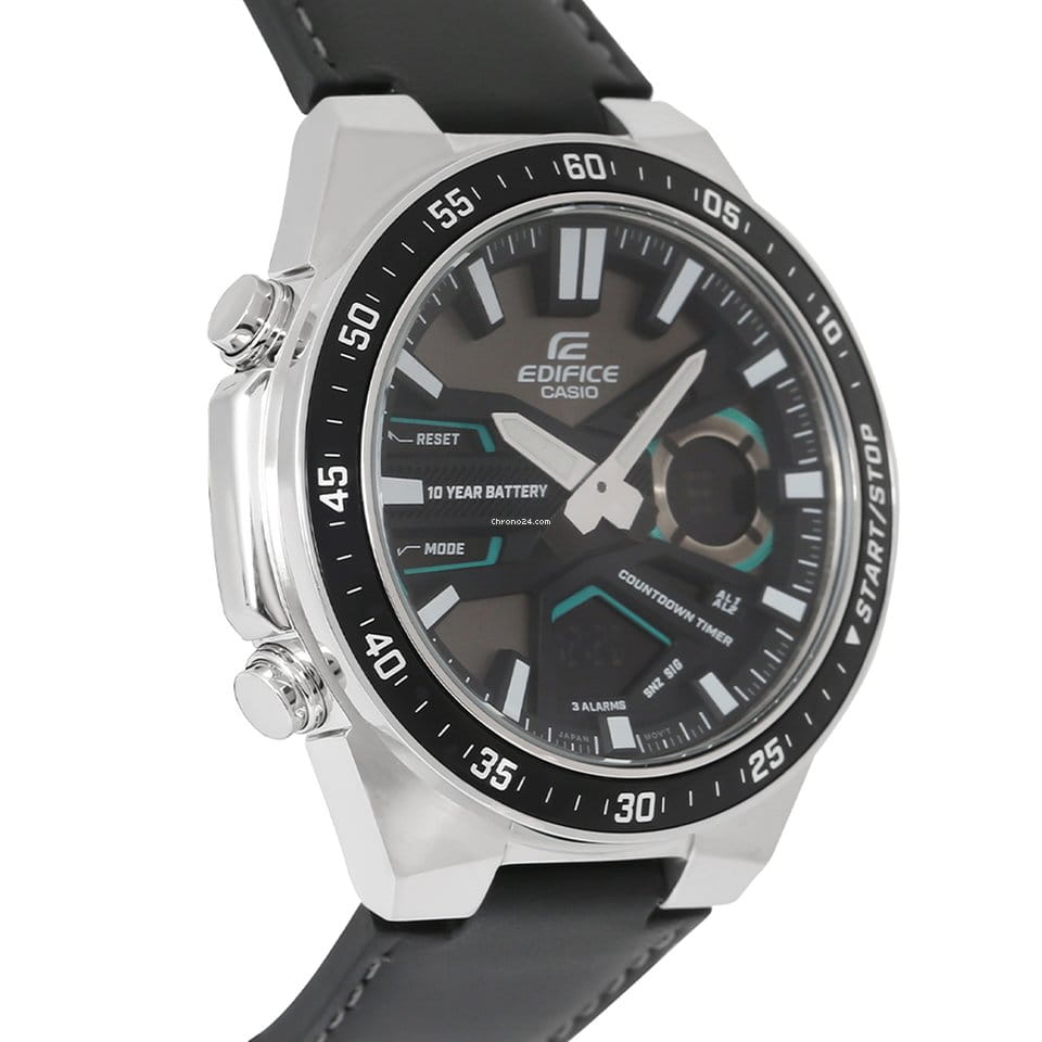 Японские мужские часы-хронографХронографФункция позволяет измерять отрезки времени с особой точностью: часы, минуты, секунды. Верным признаком хронографа является наличие на циферблате 3 дополнительных окошек-счётчиков. Casio Edifice EFV-C110L-1A. Минеральное стеклоМинеральное стеклоМинеральное стекло представляет собой искусственно выращенный минерал кварца. Такое стекло отличается особой устойчивостью к повреждениям и царапинам. Уступает по некоторым качествам сапфировому стеклу. устойчивое к появлению царапин, обладающее высокой прозрачностью. Корпус часов изготовлен из нержавеющей стали. БезельБезельВнешний ободок, закрепляющий стекло. В спортивных часах так называется поворотное кольцо с делениями на циферблате, выполняет роль таймера – замеряет отрезки времени на шкале. Неподвижный безель – элемент декора. Однонаправленно вращающийся безель на дайверских часах позволяет фиксировать моменты погружения и выныривания на поверхность. из стали с IP-покрытиемIP-покрытиеМетод ионного напыления. Демонстрирует повышенную устойчивость к истиранию, окислению и химическим веществам. Под воздействием высокого давления и температуры около 1500°C молекулы металла надёжно соединяются с частицами корпуса часов.. Светодиодная автоподсветка NeobriteПодсветка NeobriteИспользование светонакопительных составов на основе сульфида цинка или алюмината стронция, яркий свет можно наблюдать на протяжении 6-10 часов после «зарядки» часов около источника света. - при повороте часов в сторону лица подсветка дисплея осуществляется автоматически. Настраиваемое послесвечение 1,5 или 3сек. СекундомерСекундомерСекундоме́р — прибор, способный измерять интервалы времени с точностью до долей секунды. с точностью измерения 1/100 секунды и измерением до 23 часов 59 минут 59,99 cек. ТаймерТаймерОтсчитывает секунды в обратном направлении в заданном интервале времени. обратного отсчета (диапазон времени 24 часа), автоматический календарь, 12/24 отображение времени. Мировое времяМировое время Полезное часовое усложнение, отображающее время в основных городах и известных областях по всему миру, оно связано с часовыми поясами, удобно для путешественников и бизнесменов. – 30 городов (29 часовых поясов). 3 будильникаБудильникБуди́льник — часы, в заданный момент времени подающие звуковой, световой и/или в редких случаях другой сигнал., один с функцией Snooze, ежечасный сигнал. Записная книжка на 30 ячеек памяти для записи имен и телефонных номеров, каждая запись может включать в себя текст из 8 букв и 16 цифр. Класс водозащиты: 100 метров, позволит плавать, нырять и заниматься другими водными видами спорта. Кожаный ремешок на стандартной застежке.