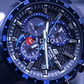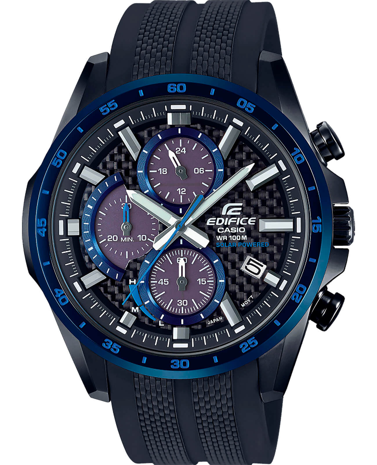 Модель как воплощение спортивной динамики имеет характерные дизайнерские элементы оформления: карбоновый циферблат с текстурной поверхностью, крупные счётчики, надёжный каучуковый ремешок, синие цветовые акценты. Наручные часы работают за счёт технологии , получая энергию от солнечного света. Индикатор уровня заряда элемента питания позволяет следить за необходимостью подзарядить аккумулятор. Ударопрочный корпусУдаропрочный корпусМеханизм заключён в корпус, выполненный из современных материалов, устойчивых к ударам, механическим повреждениям и падению с высоты: инновационный пластик, карбон, нержавеющая сталь, титан. из нержавеющей стали 316L с ионным IP-покрытиемIP-покрытиеМетод ионного напыления. Демонстрирует повышенную устойчивость к истиранию, окислению и химическим веществам. Под воздействием высокого давления и температуры около 1500°C молекулы металла надёжно соединяются с частицами корпуса часов.. Минеральное стекло. Люминесцентная подсветкаЛюминесцентное покрытиеПозволяет считывать показания времени в темноте. Производители наносят на стрелки, часовые индексы, безель или поверхность циферблата светонакопительный состав, дающий холодное свечение.. Закручивающаяся задняя крышка. Водонепроницаемость 10 бар. Отображение даты, секундомер. Габариты: 51,5 x 47,6 x 12 мм.