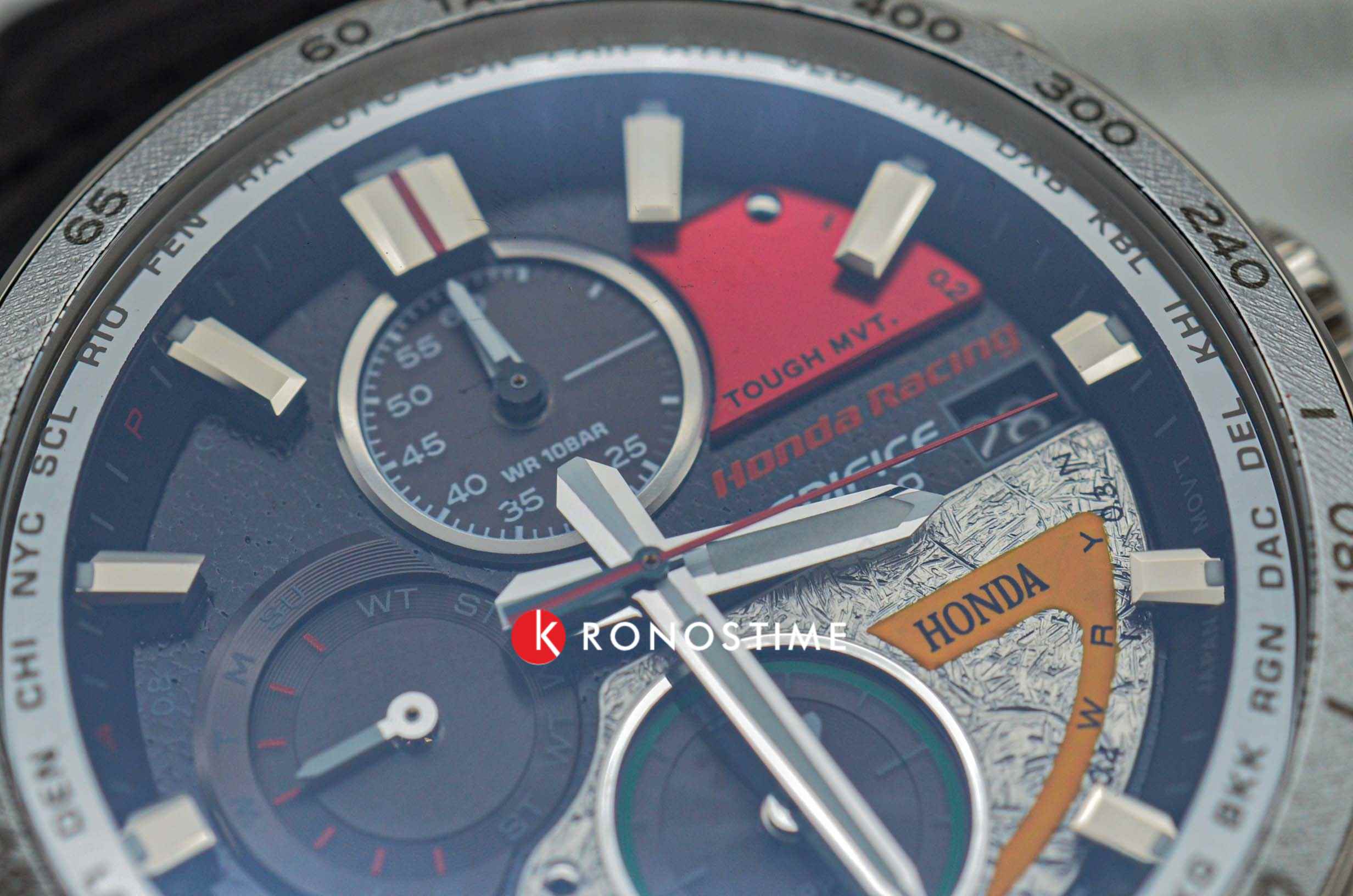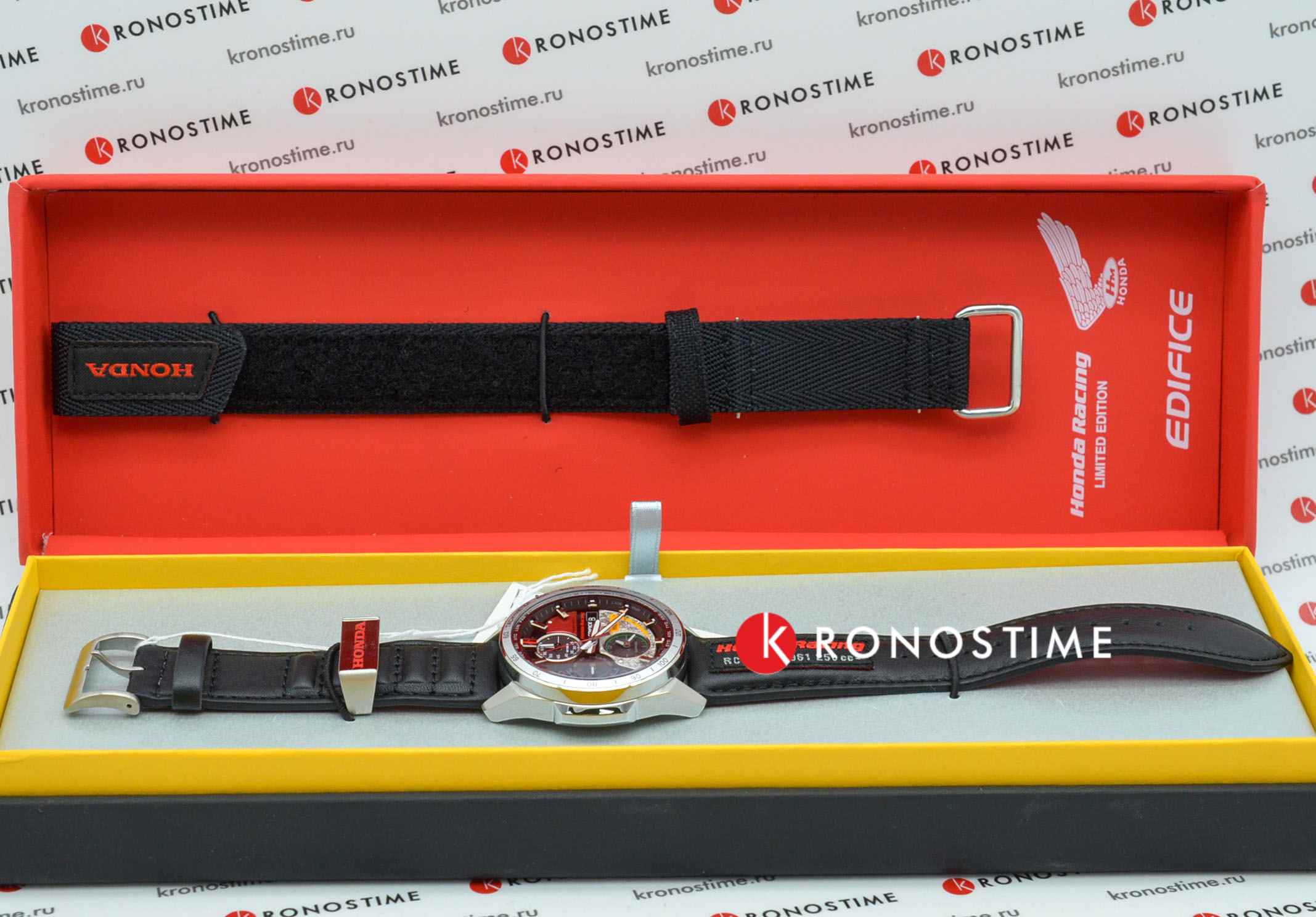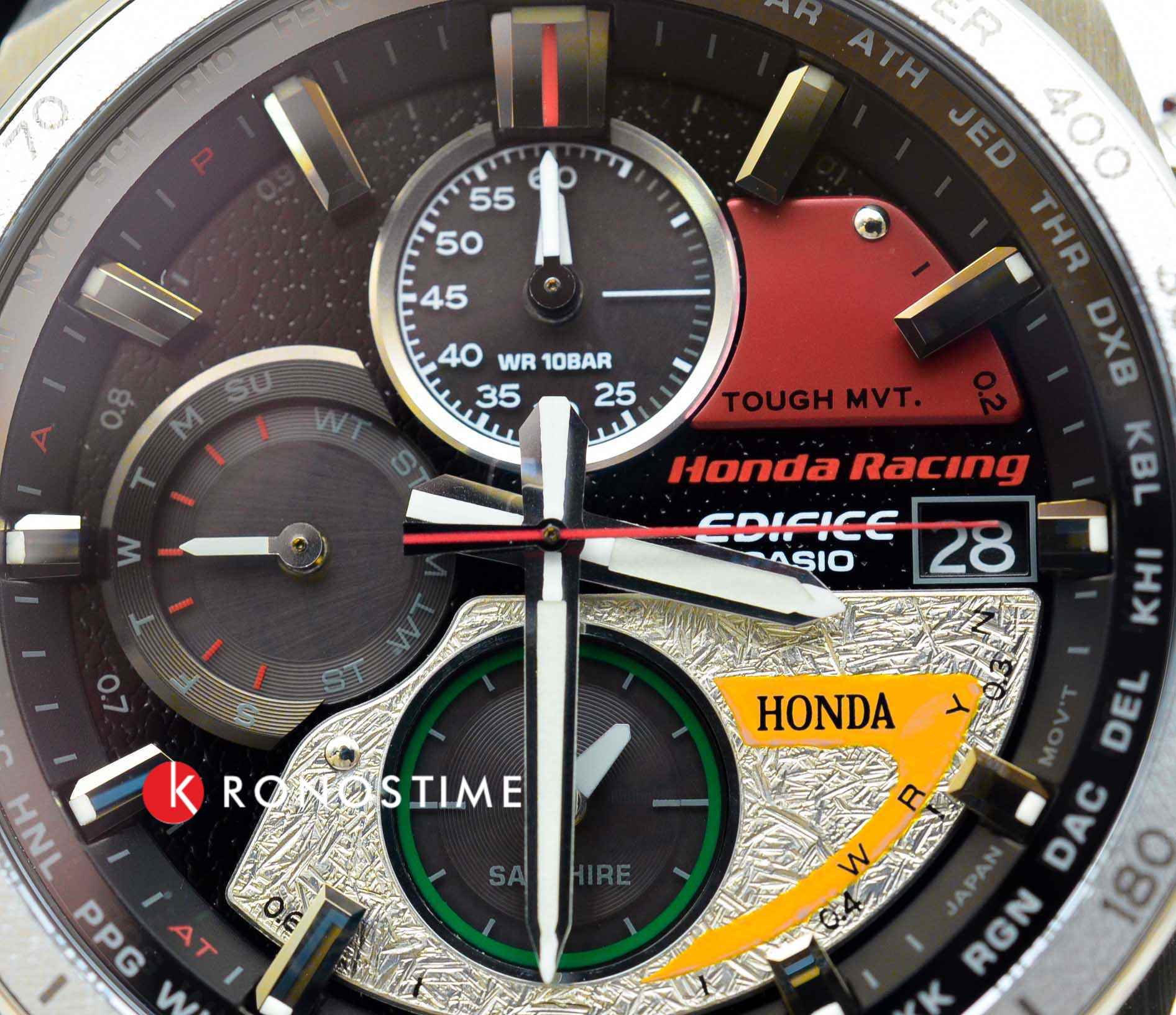 Стильный динамичный дизайн этих часов оценит по достоинству любой поклонник спортивного стиля. Edifice Honda Racing Limited Edition. Лимитированная серия. Часы созданы при сотрудничестве с компанией Honda Racing и посвящены 60-летию победы японского гонщика Kunimitsu Takahashi (Кунимицу Такахаси) в Гран-при Германии. Кунимицу стал первым японцем-победителем мотоциклетного Гран-при. Аббревиатура RC162 на ремешке означает модель байка, на котором гонщик выиграл 10 гонок Гран-при в течении года. Цветовая гамма часов выполнена в стиле байка Honda RC162. Питание от солнечной энергии Tough Solar - солнечные батарейки большой мощности, индикатор заряда батареи.