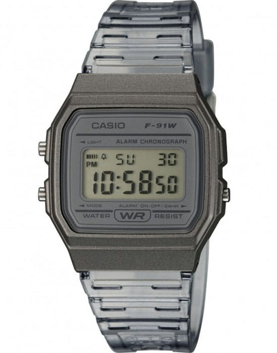 Аксессуар наделён узнаваемым квадратным корпусом, прототипом для которого стали первые модели от Casio. Винтажное исполнение не лишено современности, наручные часы предстают перед нами в полупрозрачном чёрном формате. Корпус выполнен из полимера, он обезопасит японский кварцевый калибр от случайных ударов и повреждений. Идентичный материал был выбран и для ремешка, комфортно сидящего на запястье. Часы оснащены светодиодной микроподсветкойСветодиодная подсветкаСветодиодная или LED-подсветка обеспечивает появление яркого холодного свечения за счёт LED-элементов - маленьких лампочек. Они потребляют минимальное количество энергии, чаще всего можно встретить 1 светодиод, в нижней части циферблата., освещающей циферблат сбоку. 1 батарейка будет обеспечивать питание механизма на протяжении 7 лет. Отображение времени можно выбрать в формате 12-ти или 24-х часов. Функции: будильник, секундомер, автоматический календарь. Габариты: 38,2 x 33,2 x 8,5 мм.