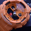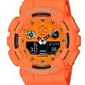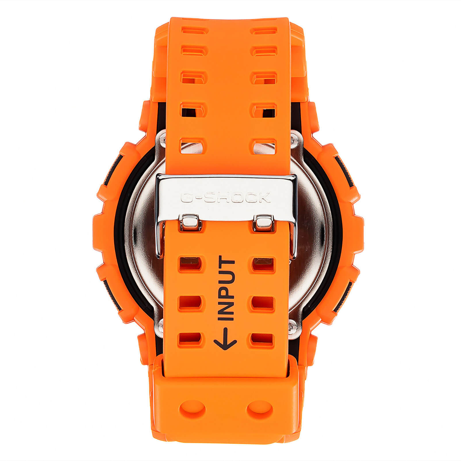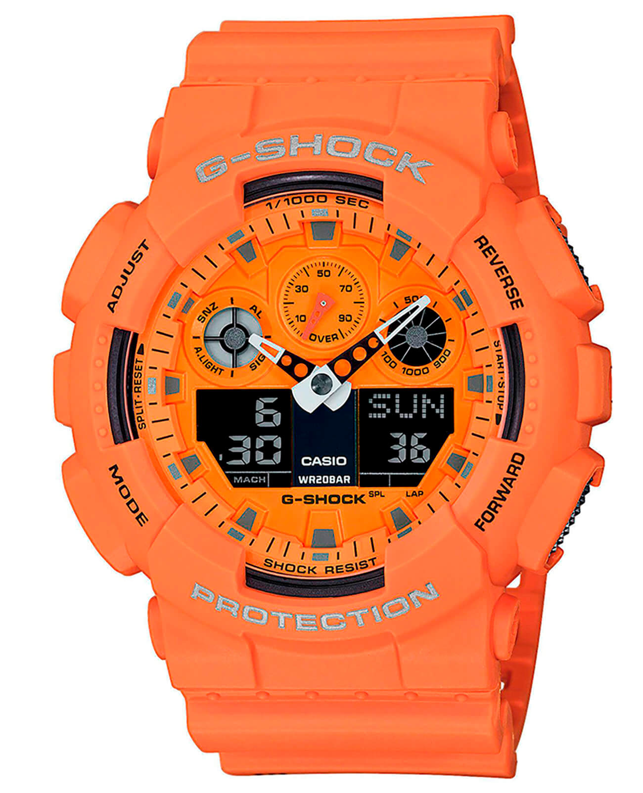 Наручные часы с оранжевым матовым корпусом выполнены в спортивном стиле, внимание привлекает циферблат "Three-eye" и перфорированные контрастные стрелки. Аксессуар серии G-Shock GA-100 выдерживает удары, падение с высоты, механические повреждения благодаря применению полимерного пластика. Кварцевый калибр японского производства получает питание от батарейки, срок службы которой - 2 года. Защита от воздействия магнитных полей. Надёжное минеральное стекло. Светодиодная подсветкаСветодиодная подсветкаСветодиодная или LED-подсветка обеспечивает появление яркого холодного свечения за счёт LED-элементов - маленьких лампочек. Они потребляют минимальное количество энергии, чаще всего можно встретить 1 светодиод, в нижней части циферблата. оранжевого цвета. Водостойкость до 20 бар. Мягкий и лёгкий полимерный ремешок. Таймер с автоповтором, мировое времяМировое время Полезное часовое усложнение, отображающее время в основных городах и известных областях по всему миру, оно связано с часовыми поясами, удобно для путешественников и бизнесменов. , секундомер, будильник, расчёт средней скорости по указанной дистанции, UTCUTCВсемирное кординационное время, не имеющее привязки к географическому положению Гринвича, основывается на атомном отсчёте времени. Регулировка времени осуществляется более точно, чем устаревшее GMT.