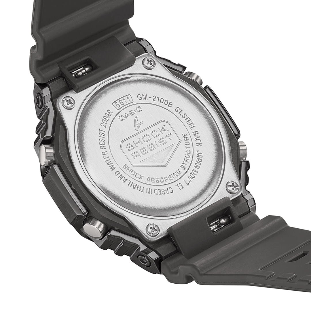 Японские мужские часы-хронографХронографФункция позволяет измерять отрезки времени с особой точностью: часы, минуты, секунды. Верным признаком хронографа является наличие на циферблате 3 дополнительных окошек-счётчиков. Casio G-Shock GM-2100B-4A из коллекции G-Shock. Минеральное стеклоМинеральное стеклоМинеральное стекло представляет собой искусственно выращенный минерал кварца. Такое стекло отличается особой устойчивостью к повреждениям и царапинам. Уступает по некоторым качествам сапфировому стеклу. устойчивое к появлению царапин, обладающее высокой прозрачностью. Ударопрочный корпусУдаропрочный корпусМеханизм заключён в корпус, выполненный из современных материалов, устойчивых к ударам, механическим повреждениям и падению с высоты: инновационный пластик, карбон, нержавеющая сталь, титан. из стали с IP-покрытиемIP-покрытиеМетод ионного напыления. Демонстрирует повышенную устойчивость к истиранию, окислению и химическим веществам. Под воздействием высокого давления и температуры около 1500°C молекулы металла надёжно соединяются с частицами корпуса часов. защищает механизм от ударов и вибрации. Светодиодная подсветкаСветодиодная подсветкаСветодиодная или LED-подсветка обеспечивает появление яркого холодного свечения за счёт LED-элементов - маленьких лампочек. Они потребляют минимальное количество энергии, чаще всего можно встретить 1 светодиод, в нижней части циферблата. освещает весь циферблат. Мировое времяМировое время Полезное часовое усложнение, отображающее время в основных городах и известных областях по всему миру, оно связано с часовыми поясами, удобно для путешественников и бизнесменов. – 48 городов (29 часовых поясов). СекундомерСекундомерСекундоме́р — прибор, способный измерять интервалы времени с точностью до долей секунды. с точностью измерения 1/100 секунды и измерением до 23 часов 59 минут 59,99 cек. ТаймерТаймерОтсчитывает секунды в обратном направлении в заданном интервале времени. обратного отсчета (диапазон времени 24 часа), автоматический календарь, 12/24 отображение времени. 5 будильниковБудильникБуди́льник — часы, в заданный момент времени подающие звуковой, световой и/или в редких случаях другой сигнал., один с функцией Snooze, ежечасный сигнал.  Класс водозащиты: 200 метров, позволит плавать, нырять и заниматься другими водными видами спорта. Ремешок из полимерного материала на стандартной застежке.
