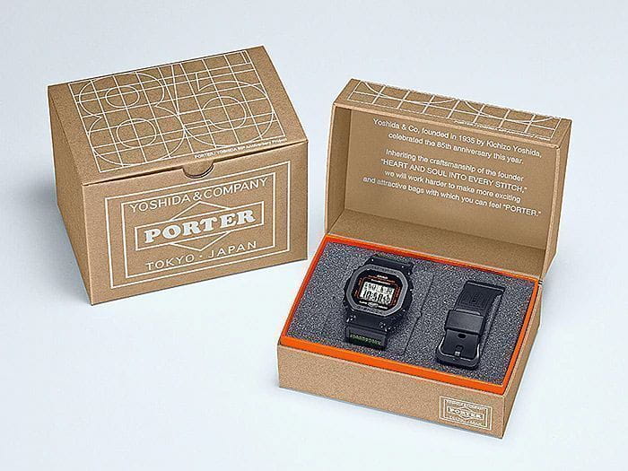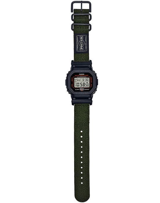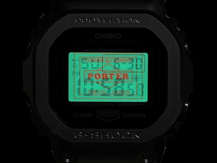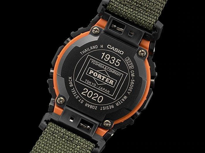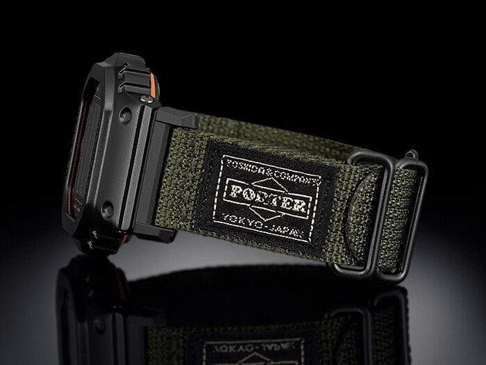 Японские мужские часы лимитированной серии Casio G-Shock GM-5600EY-1DR. Часы созданы в коллаборации с японским брендом PORTER, производителем сумок и одежды премиум-класса. В комплект поставки часов входит три ремешка: зеленый тканевый, черный полимерный и прочный ремешок-манжета от PORTER. Класс водозащиты: 200 метров, позволит плавать, нырять и заниматься другими водными видами спорта. Корпус часов изготовлен из стали, с PVD покрытием черного цвета.