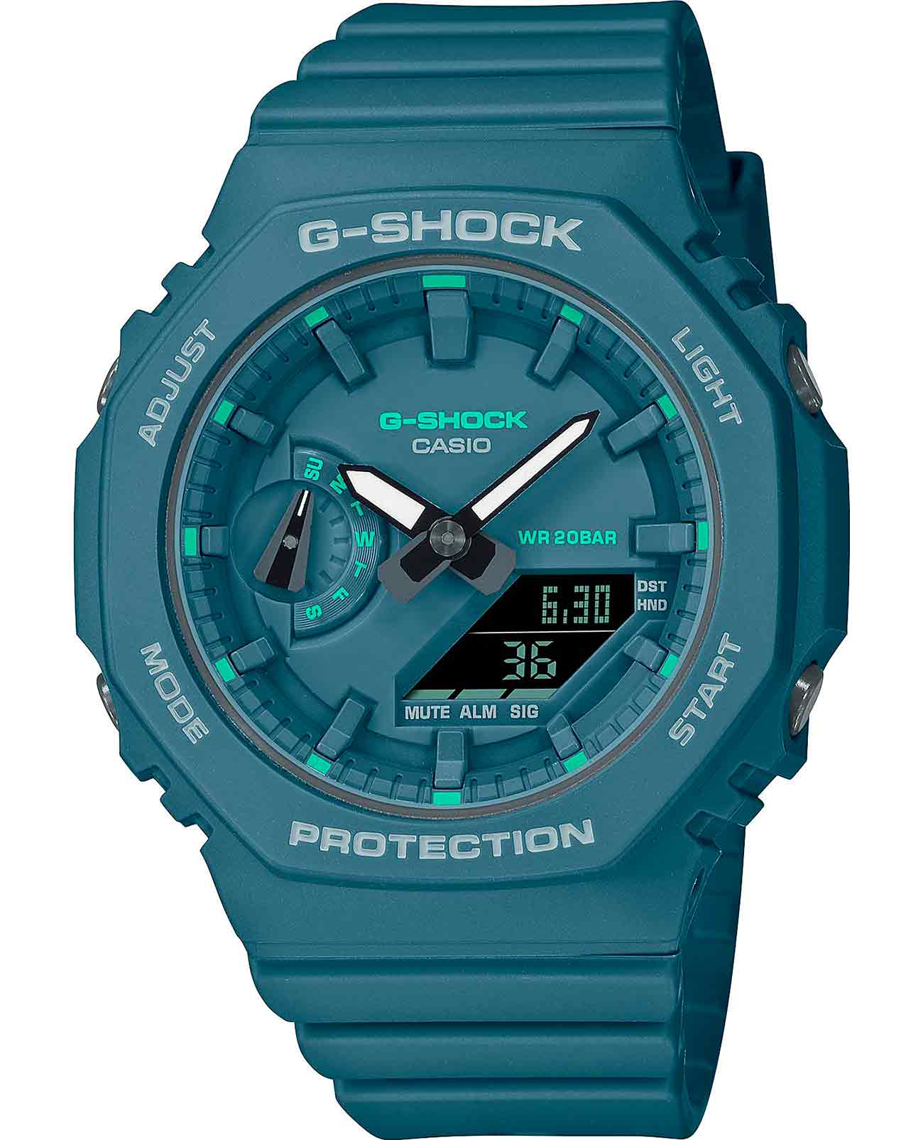 Японские женские часы-хронографХронографФункция позволяет измерять отрезки времени с особой точностью: часы, минуты, секунды. Верным признаком хронографа является наличие на циферблате 3 дополнительных окошек-счётчиков. Casio G-Shock GMA-S2100GA-3AER из коллекции G-Shock. Минеральное стеклоМинеральное стеклоМинеральное стекло представляет собой искусственно выращенный минерал кварца. Такое стекло отличается особой устойчивостью к повреждениям и царапинам. Уступает по некоторым качествам сапфировому стеклу. устойчивое к появлению царапин, обладающее высокой прозрачностью. Ударопрочный корпусУдаропрочный корпусМеханизм заключён в корпус, выполненный из современных материалов, устойчивых к ударам, механическим повреждениям и падению с высоты: инновационный пластик, карбон, нержавеющая сталь, титан. защищает механизм от ударов и вибрации. Светодиодная автоподсветка NeobriteПодсветка NeobriteИспользование светонакопительных составов на основе сульфида цинка или алюмината стронция, яркий свет можно наблюдать на протяжении 6-10 часов после «зарядки» часов около источника света. - при повороте часов в сторону лица подсветка дисплея осуществляется автоматически. Настраиваемое послесвечение 1,5 или 3сек. Мировое времяМировое время Полезное часовое усложнение, отображающее время в основных городах и известных областях по всему миру, оно связано с часовыми поясами, удобно для путешественников и бизнесменов. – 48 городов (29 часовых поясов). СекундомерСекундомерСекундоме́р — прибор, способный измерять интервалы времени с точностью до долей секунды. с точностью измерения 1/100 секунды и измерением до 23 часов 59 минут 59,99 cек. ТаймерТаймерОтсчитывает секунды в обратном направлении в заданном интервале времени. обратного отсчета (диапазон времени 24 часа), автоматический календарь, 12/24 отображение времени. 5 будильниковБудильникБуди́льник — часы, в заданный момент времени подающие звуковой, световой и/или в редких случаях другой сигнал., ежечасный сигнал. Переключение между домашним и мировым временем. Класс водозащиты: 200 метров, позволит плавать, нырять и заниматься другими водными видами спорта. Ремешок из полимерного материала на стандартной застежке.