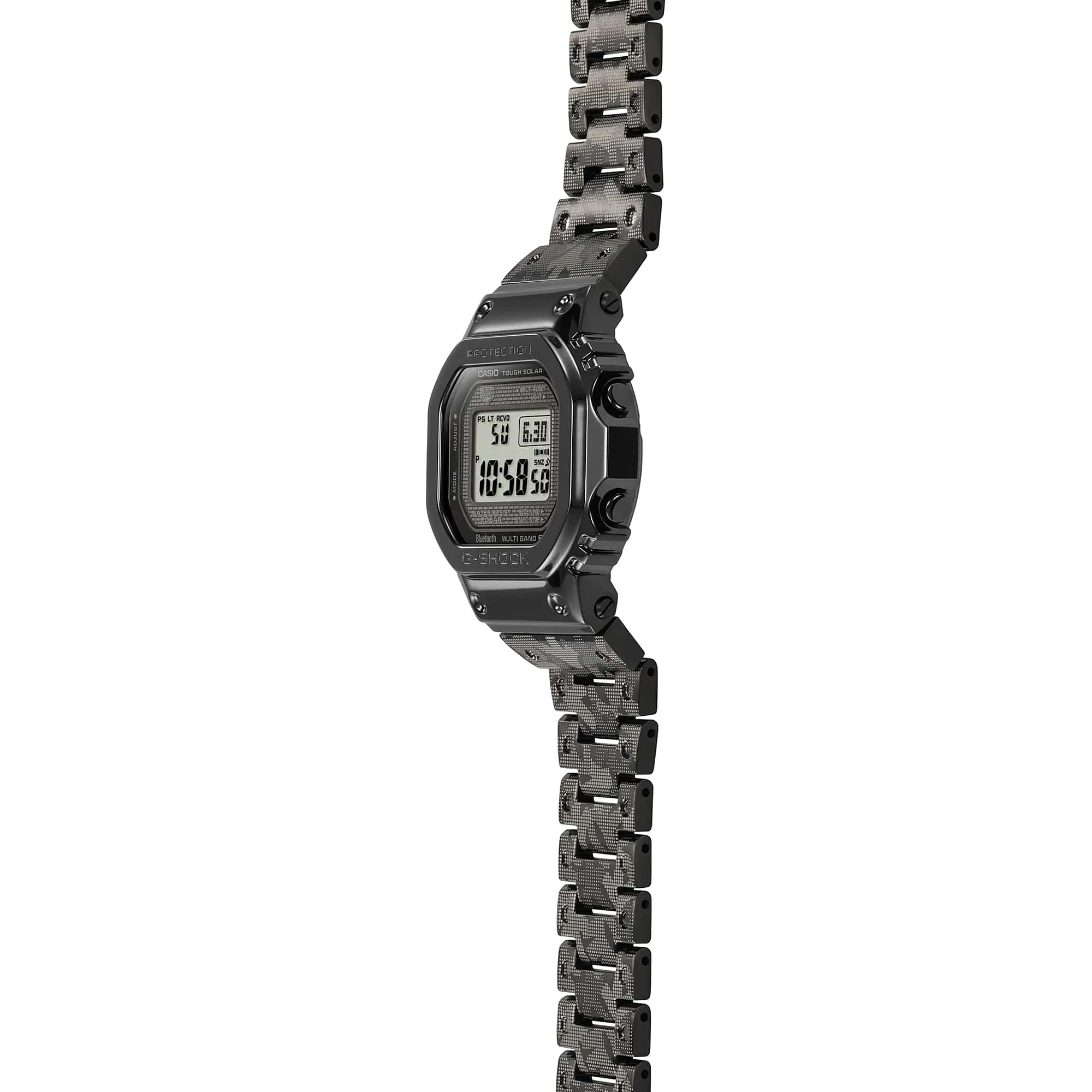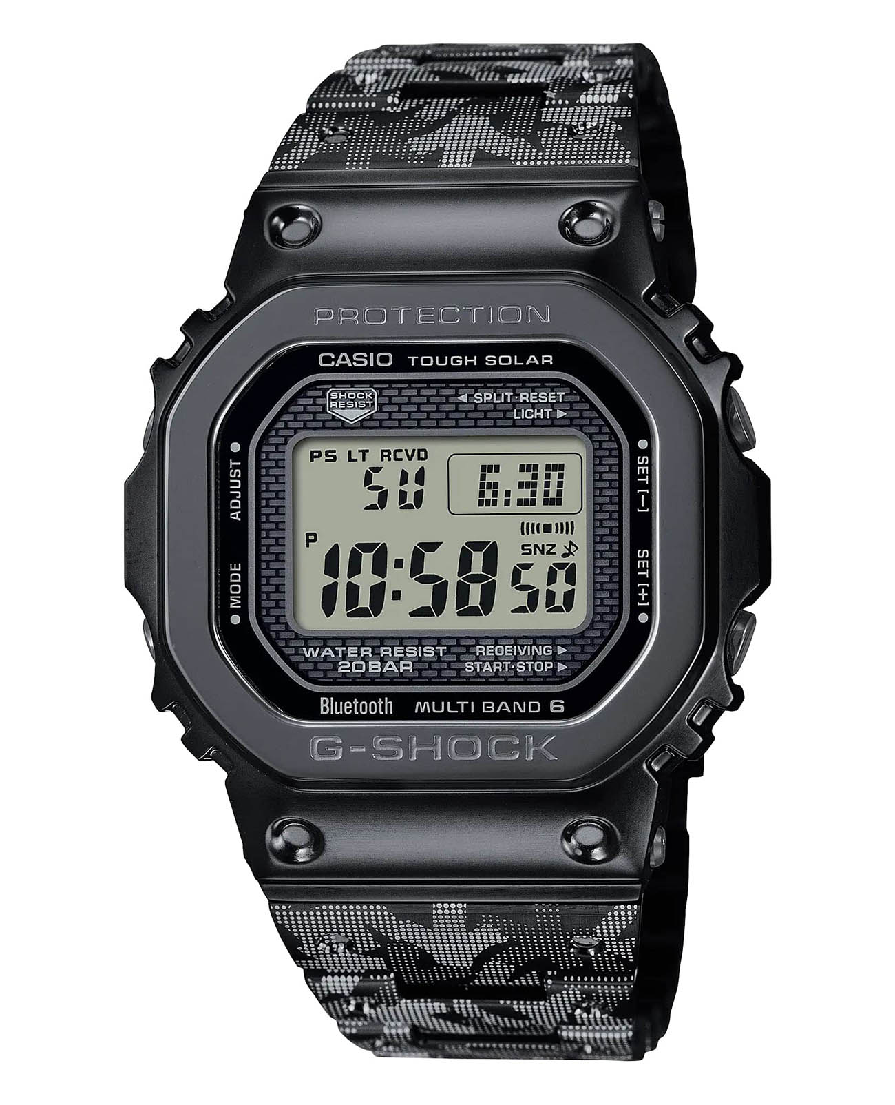 Внешний вид отличается оригинальностью, Полоса из нержавеющей стали покрыта IP-покрытиемIP-покрытиеМетод ионного напыления. Демонстрирует повышенную устойчивость к истиранию, окислению и химическим веществам. Под воздействием высокого давления и температуры около 1500°C молекулы металла надёжно соединяются с частицами корпуса часов. черного цвета с оригинальной графикой Haze. Стиль ретро незримо присутствует благодаря 8-угольному ударопрочному корпусуУдаропрочный корпусМеханизм заключён в корпус, выполненный из современных материалов, устойчивых к ударам, механическим повреждениям и падению с высоты: инновационный пластик, карбон, нержавеющая сталь, титан., напоминающему первые модели от Casio. Его конструкция подразумевает наличие металлической капсулы с кварцевым механизмом. Наручные часы заряжаются от солнечной батареи – технология , специальный индикатор показывает состояние батареи. LED-подсветкаСветодиодная подсветкаСветодиодная или LED-подсветка обеспечивает появление яркого холодного свечения за счёт LED-элементов - маленьких лампочек. Они потребляют минимальное количество энергии, чаще всего можно встретить 1 светодиод, в нижней части циферблата. экрана. Водостойкость 20 бар. Надёжное минеральное стекло. Дополнительные возможности: Bluetooth-синхронизацияBluetoothСовременная технология, позволяющая синхронизировать часы с телефоном и переносить данные. Часы с Bluetooth расширяют возможности вашего смартфона и делают его использование ещё более удобным., приём радиосигнала, мировое времяМировое время Полезное часовое усложнение, отображающее время в основных городах и известных областях по всему миру, оно связано с часовыми поясами, удобно для путешественников и бизнесменов. , будильник, таймер, секундомер, автоматический календарь. Габариты: 43,2 x 49,3 x 13 мм.