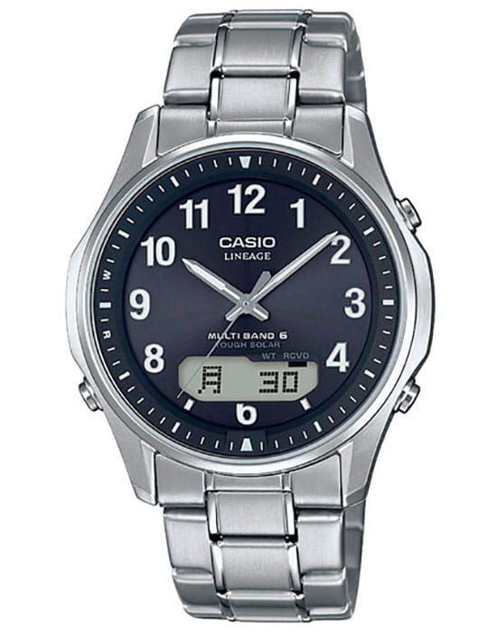 Высокотехнологичные японские наручные мужские часы. Круглый корпус и браслет часов выполнены из титана. Водонепроницаемость 50 ATM. Круглый циферблат черного цвета. Часы оснащены такими функциями как секундомер, таймер обратного отсчета, будильник, мировое время, второй часовой пояс, прием радиосигнала. Сапфировое стекло не царапается.