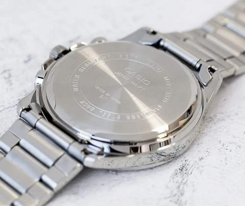 Японские мужские наручные часы с минеральным стекломМинеральное стеклоМинеральное стекло представляет собой искусственно выращенный минерал кварца. Такое стекло отличается особой устойчивостью к повреждениям и царапинам. Уступает по некоторым качествам сапфировому стеклу. Casio Collection MTP-1375D-3A, кварцевый механизм с высокой точностью. Корпус часов изготовлен из стали. Стрелки с люминесцентным покрытиемЛюминесцентное покрытиеПозволяет считывать показания времени в темноте. Производители наносят на стрелки, часовые индексы, безель или поверхность циферблата светонакопительный состав, дающий холодное свечение.. 12-ти и 24-х часовой формат времени. Класс водозащиты: 50 метров, позволит защитить корпус от случайных брызг или капель дождя. Стальной браслет на раскладной застёжкеРаскладная застёжкаТакой тип застёжки используется только на браслетах из металла. Она никогда не раскрывается полностью, происходит разделение на 2 и более частей. Раскладывающая застёжка снизит вероятность потери часов к минимуму..