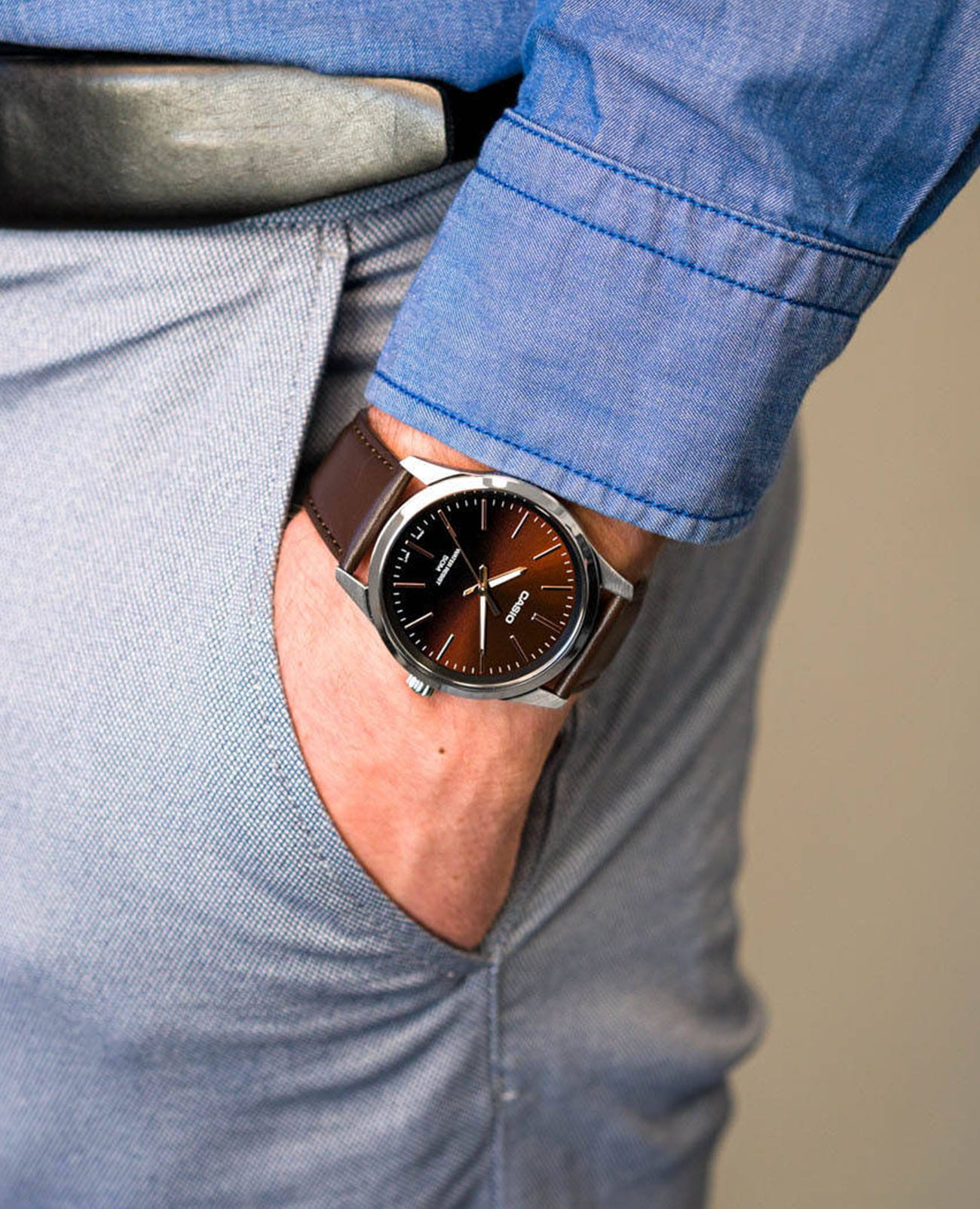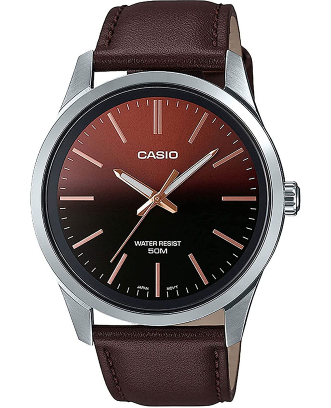 Японские мужские наручные часы с минеральным стекломМинеральное стеклоМинеральное стекло представляет собой искусственно выращенный минерал кварца. Такое стекло отличается особой устойчивостью к повреждениям и царапинам. Уступает по некоторым качествам сапфировому стеклу. Casio Collection MTP-E180L-5AVEF, кварцевый механизм с высокой точностью. Окошко даты с увеличительным стеклом. Класс водозащиты: 50 метров, позволит защитить корпус от случайных брызг или капель дождя. Корпус часов изготовлен из стали. Стрелки с люминесцентным покрытиемЛюминесцентное покрытиеПозволяет считывать показания времени в темноте. Производители наносят на стрелки, часовые индексы, безель или поверхность циферблата светонакопительный состав, дающий холодное свечение.. Кожаный ремешок на стандартной застёжке.