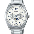 Японские мужские кварцевые часы с минеральным стекломМинеральное стеклоМинеральное стекло представляет собой искусственно выращенный минерал кварца. Такое стекло отличается особой устойчивостью к повреждениям и царапинам. Уступает по некоторым качествам сапфировому стеклу. Casio Collection MTP-M300D-7A, кварцевый механизм с высокой точностью. Корпус часов изготовлен из нержавеющей стали. Циферблат с метками в виде штрихов. Стрелки с люминесцентным покрытиемЛюминесцентное покрытиеПозволяет считывать показания времени в темноте. Производители наносят на стрелки, часовые индексы, безель или поверхность циферблата светонакопительный состав, дающий холодное свечение.. Особенностью модели является наличие индикатора фазы луны над шестью часами по циферблату. Индикатор имеет 4 положения и отображается новолуние и полнолуние, а также растущую и убывающую Луну. Батарейка рассчитана на 3 года. Класс водозащиты: 50 метров, позволит защитить корпус от случайных брызг или капель дождя. Стальной браслет на раскладной застёжкеРаскладная застёжкаТакой тип застёжки используется только на браслетах из металла. Она никогда не раскрывается полностью, происходит разделение на 2 и более частей. Раскладывающая застёжка снизит вероятность потери часов к минимуму..