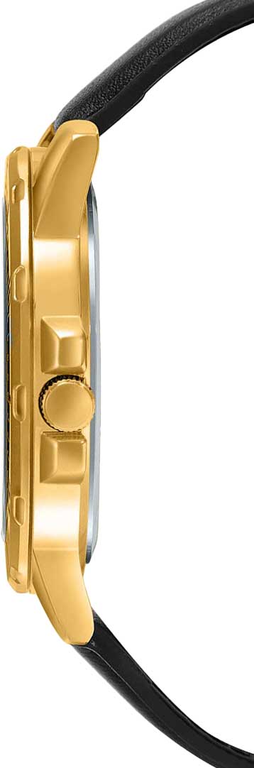 Кварцевый механизм с высокой точностью. Минеральное стеклоМинеральное стеклоМинеральное стекло представляет собой искусственно выращенный минерал кварца. Такое стекло отличается особой устойчивостью к повреждениям и царапинам. Уступает по некоторым качествам сапфировому стеклу. устойчивое к появлению царапин, обладающее высокой прозрачностью. Стрелки с люминесцентным покрытиемЛюминесцентное покрытиеПозволяет считывать показания времени в темноте. Производители наносят на стрелки, часовые индексы, безель или поверхность циферблата светонакопительный состав, дающий холодное свечение.. Класс водозащиты: 20 метров, позволит защитить корпус от случайных брызг или капель дождя. Корпус часов изготовлен из нержавеющей стали с PVD-покрытиемPVDУльтратонкое покрытие наносится в технике вакуумного напыления, сочетает в себе нитрид титана особой прочности со слоем золота или оксида хрома. Несёт в себе декоративную или защитную функцию.. Кожаный ремешок с классической застежкой.