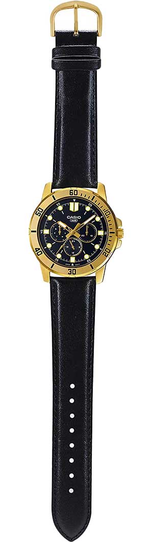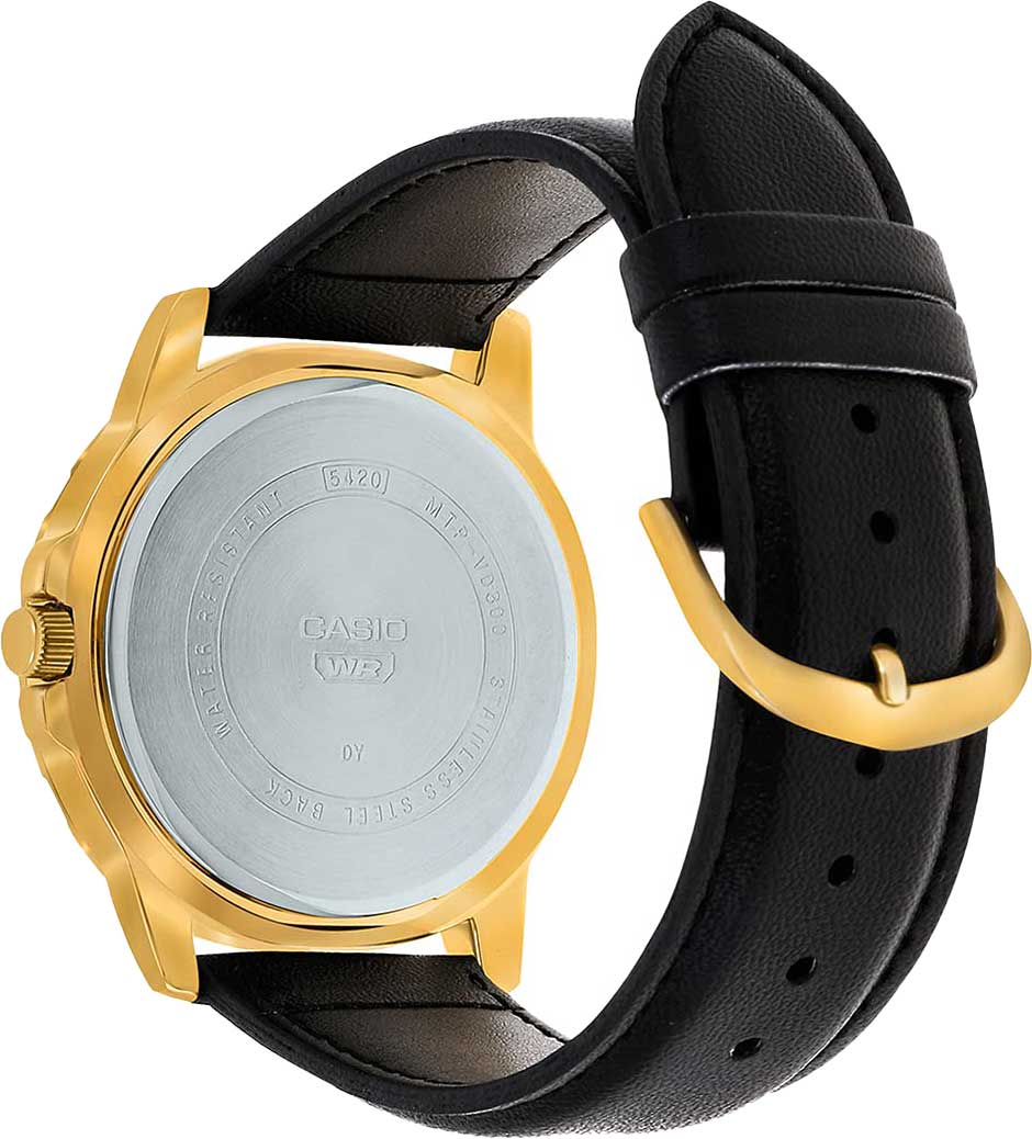 Японские мужские часы с минеральным стекломМинеральное стеклоМинеральное стекло представляет собой искусственно выращенный минерал кварца. Такое стекло отличается особой устойчивостью к повреждениям и царапинам. Уступает по некоторым качествам сапфировому стеклу. Casio Collection MTP-VD300GL-1E, кварцевый механизм с высокой точностью. Корпус часов изготовлен из стали с IP-покрытиемIP-покрытиеМетод ионного напыления. Демонстрирует повышенную устойчивость к истиранию, окислению и химическим веществам. Под воздействием высокого давления и температуры около 1500°C молекулы металла надёжно соединяются с частицами корпуса часов.. Люминесцентная подсветкаЛюминесцентное покрытиеПозволяет считывать показания времени в темноте. Производители наносят на стрелки, часовые индексы, безель или поверхность циферблата светонакопительный состав, дающий холодное свечение..
