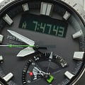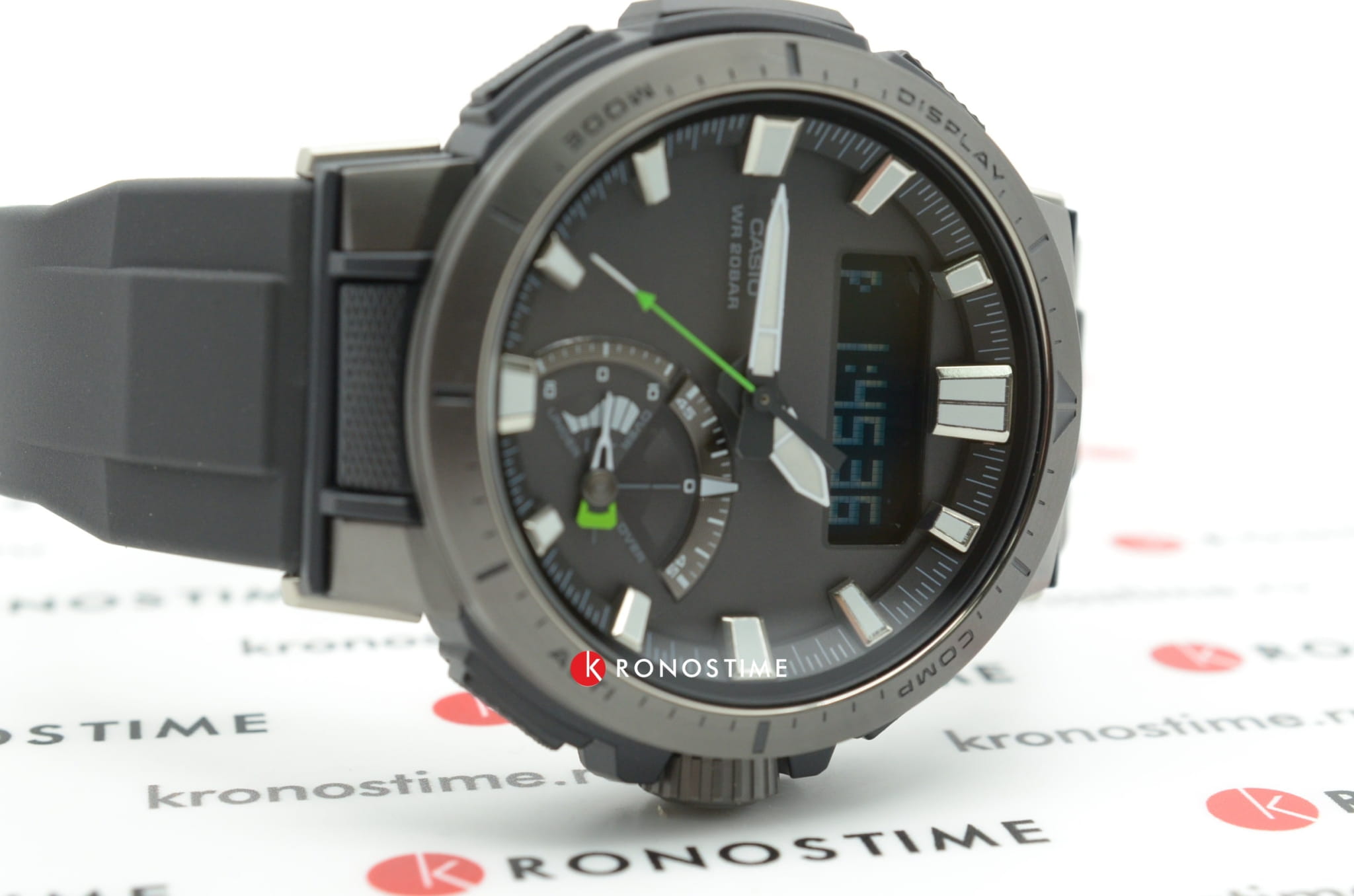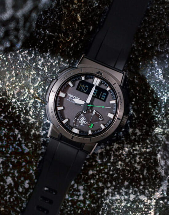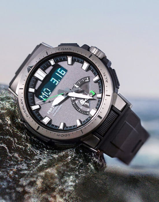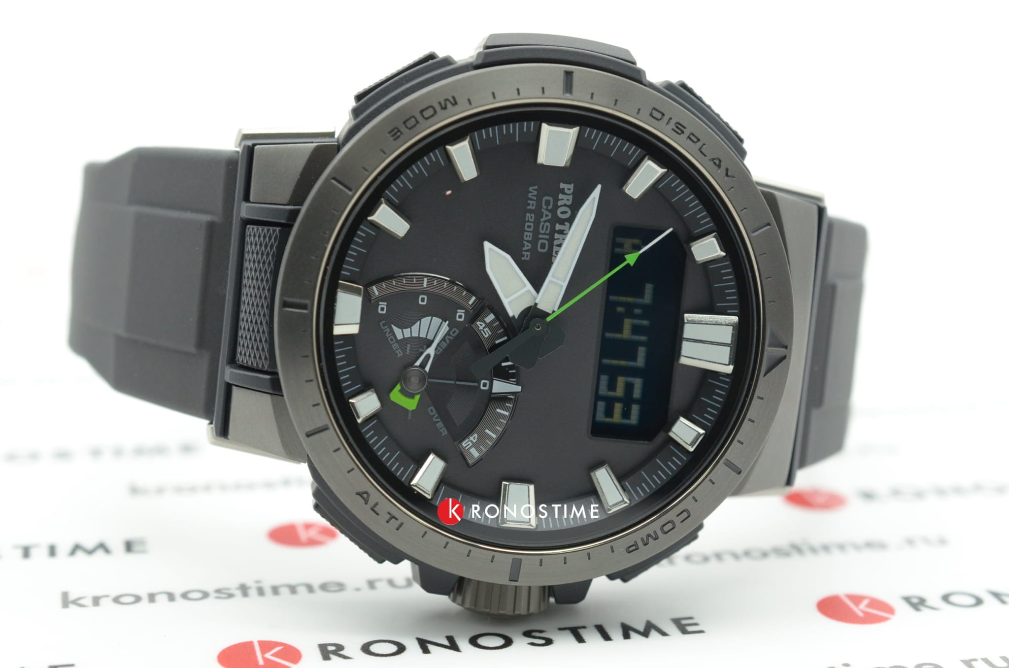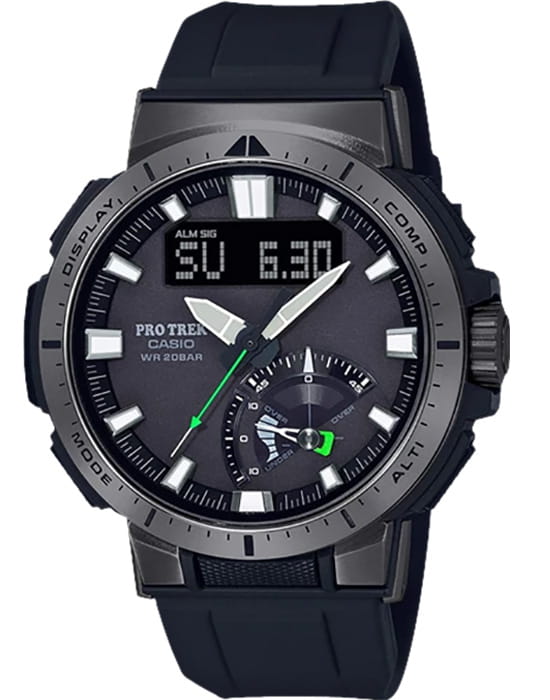 Модель с зелёными деталями отражает спортивный стиль и выигрышно смотрится на запястье. Ударопрочный корпусУдаропрочный корпусМеханизм заключён в корпус, выполненный из современных материалов, устойчивых к ударам, механическим повреждениям и падению с высоты: инновационный пластик, карбон, нержавеющая сталь, титан. выполнен из пластика и стали 316L с IP-покрытиемIP-покрытиеМетод ионного напыления. Демонстрирует повышенную устойчивость к истиранию, окислению и химическим веществам. Под воздействием высокого давления и температуры около 1500°C молекулы металла надёжно соединяются с частицами корпуса часов., что делает его устойчивым к различным видам повреждений. Наручные часы с японским кварцевым механизмом работают от солнечной батареи , функция сохранения энергии увеличивает срок работы часов без подзарядки до 21 месяца. Сапфировое стекло с покрытием «антиблик». Двойная светодиодная подсветкаСветодиодная подсветкаСветодиодная или LED-подсветка обеспечивает появление яркого холодного свечения за счёт LED-элементов - маленьких лампочек. Они потребляют минимальное количество энергии, чаще всего можно встретить 1 светодиод, в нижней части циферблата.. Водостойкость 20 бар. Устойчивость к температуре ниже -10°C. Коррекция времени радиосигналом, барометр, лунный календарь, высотомер, таймер, график восхода и заката солнца, датчик приливов и отливов, мировое времяМировое время Полезное часовое усложнение, отображающее время в основных городах и известных областях по всему миру, оно связано с часовыми поясами, удобно для путешественников и бизнесменов. – 31 часовой пояс, календарь, хронографХронографФункция позволяет измерять отрезки времени с особой точностью: часы, минуты, секунды. Верным признаком хронографа является наличие на циферблате 3 дополнительных окошек-счётчиков.. Таймер рыбалки подсказывает, какое время оптимально подходит для ловли рыбы. Габариты: 51 x 50 x 15 мм.