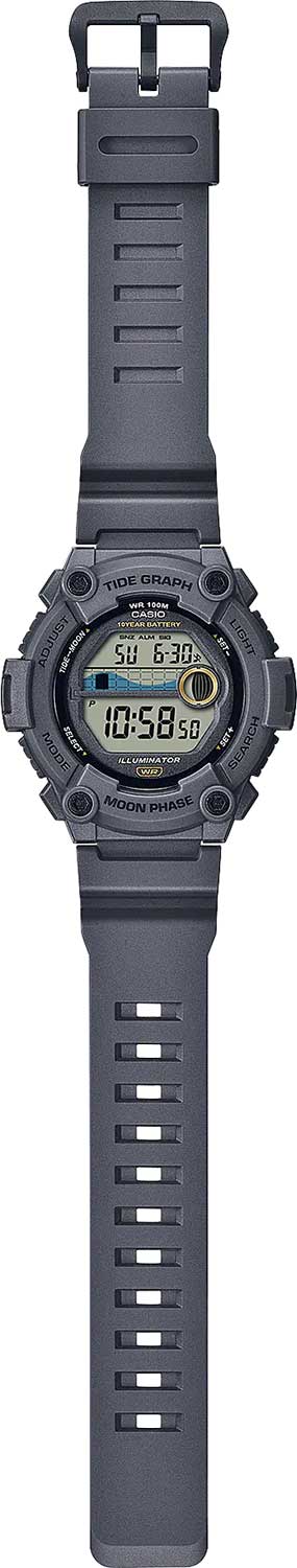 Спортивные японские мужские часы-хронографХронографФункция позволяет измерять отрезки времени с особой точностью: часы, минуты, секунды. Верным признаком хронографа является наличие на циферблате 3 дополнительных окошек-счётчиков. Casio Collection WS-1300H-8A, кварцевый механизм с высокой точностью, органическое стекло. Корпус часов изготовлен из плачтика. Светодиодная подсветкаСветодиодная подсветкаСветодиодная или LED-подсветка обеспечивает появление яркого холодного свечения за счёт LED-элементов - маленьких лампочек. Они потребляют минимальное количество энергии, чаще всего можно встретить 1 светодиод, в нижней части циферблата. освещает весь циферблат. Цвет подсветки: оранжевый. Отображение возраста Луны на конкретную дату и графика фаз Луны. 12-ти и 24-х часовой формат времени. СекундомерСекундомерСекундоме́р — прибор, способный измерять интервалы времени с точностью до долей секунды. с точностью показаний 1/100с и временем измерения 1ч. Сплит-хронографСплит-хронографИспользуется для измерения продолжительности нескольких временных отрезков, начинающихся одновременно, а заканчивающихся в разное время.. Батарейка рассчитана на 10 лет. ТаймерТаймерОтсчитывает секунды в обратном направлении в заданном интервале времени. обратного отсчета от 1мин до 24ч с автоповтором. График приливов и отливов. Функция включения/отключения звука. Типы сигналов: ежедневный, ежемесячный, каждый день определенного месяца, на определенную дату. Класс водозащиты: 100 метров, позволит плавать, нырять и заниматься другими водными видами спорта. Ремешок из полимерного материала на стандартной застежке.