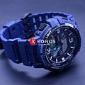 Аксессуар представлен в спортивном стиле. Синий полимерный ремешок имеет протекторную поверхность, боковые кнопки рифленые. В верхней части циферблата расположился индикатор рыбалки. Устройство поможет чётко рассчитать благоприятное время для рыбной ловли, в этот момент на экране появятся символы в виде рыбок. Корпус выполнен из полимерного пластика, материал устойчив к ударам, повреждениям. Японский кварцевый механизм. Батарейка рассчитана на 3 года работы. Акриловое стекло не повреждается при падении. Циферблат с оранжевой светодиодной подсветкойСветодиодная подсветкаСветодиодная или LED-подсветка обеспечивает появление яркого холодного свечения за счёт LED-элементов - маленьких лампочек. Они потребляют минимальное количество энергии, чаще всего можно встретить 1 светодиод, в нижней части циферблата.. Класс водостойкости WR 100. Отображение мирового времениМировое время Полезное часовое усложнение, отображающее время в основных городах и известных областях по всему миру, оно связано с часовыми поясами, удобно для путешественников и бизнесменов. . Будильник с функцией повтора, отображение лунных фаз, хронографХронографФункция позволяет измерять отрезки времени с особой точностью: часы, минуты, секунды. Верным признаком хронографа является наличие на циферблате 3 дополнительных окошек-счётчиков., таймер, вечный календарьВечный календарьКлассическое часовое усложнение, представляющее собой календарь, рассчитанный на несколько лет вперёд (стандартно – до 2099 года). Определяет текущую дату, день недели, месяц.. Габариты: 47,9 x 48,6 x 14 мм.