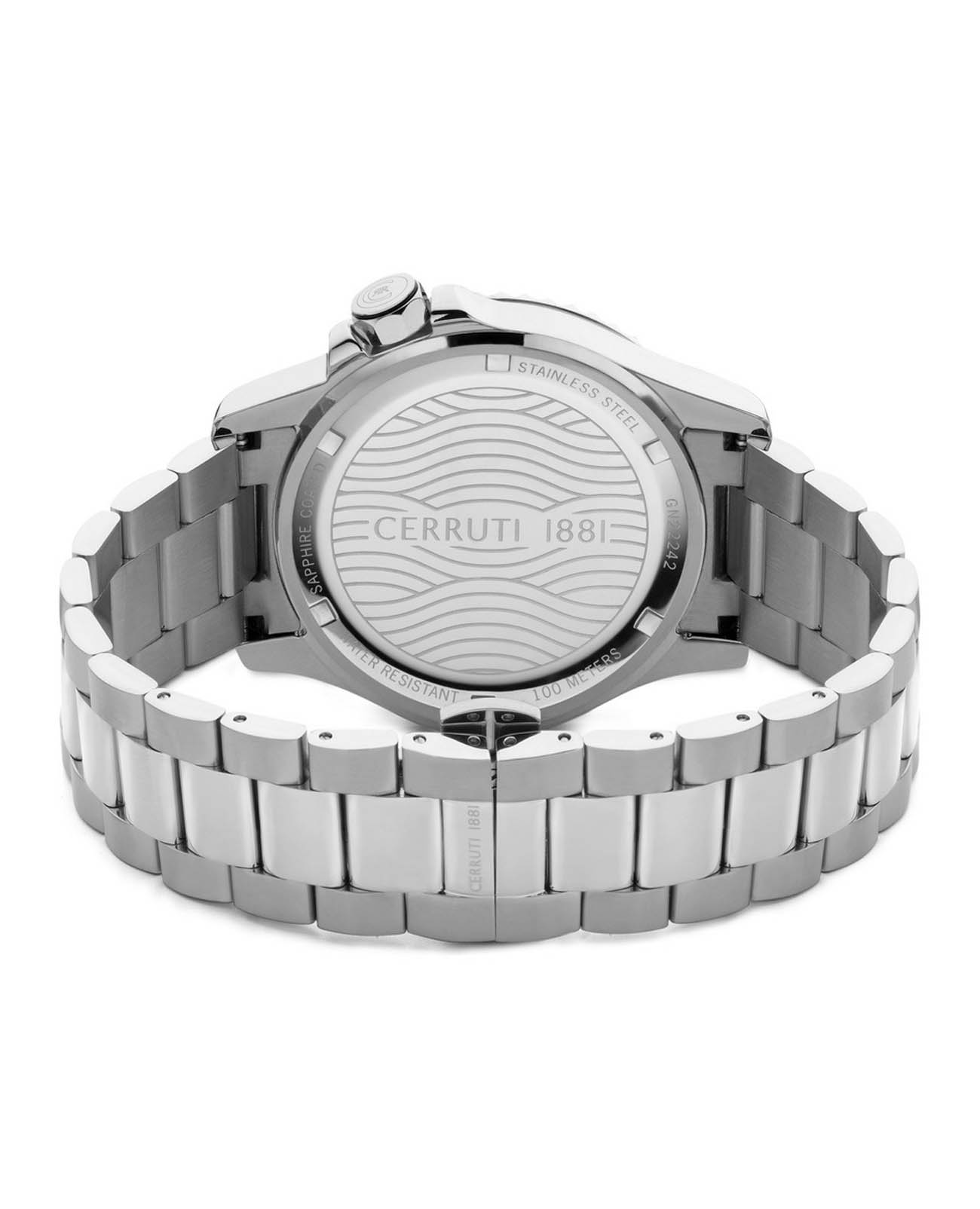 Французские мужские часы Cerruti 1881 Pesaro CIWGH2224207, кварцевый механизм с высокой точностью. Минеральное стеклоМинеральное стеклоМинеральное стекло представляет собой искусственно выращенный минерал кварца. Такое стекло отличается особой устойчивостью к повреждениям и царапинам. Уступает по некоторым качествам сапфировому стеклу. устойчивое к мелким механическим повреждениям. Корпус часов изготовлен из стали. БезельБезельВнешний ободок, закрепляющий стекло. В спортивных часах так называется поворотное кольцо с делениями на циферблате, выполняет роль таймера – замеряет отрезки времени на шкале. Неподвижный безель – элемент декора. Однонаправленно вращающийся безель на дайверских часах позволяет фиксировать моменты погружения и выныривания на поверхность. с IP-покрытиемIP-покрытиеМетод ионного напыления. Демонстрирует повышенную устойчивость к истиранию, окислению и химическим веществам. Под воздействием высокого давления и температуры около 1500°C молекулы металла надёжно соединяются с частицами корпуса часов.. Циферблат выполнен с метками в виде штрихов и точек. Окошко даты находится в положении 3 часа. Стрелки и метки с люминесцентным покрытиемЛюминесцентное покрытиеПозволяет считывать показания времени в темноте. Производители наносят на стрелки, часовые индексы, безель или поверхность циферблата светонакопительный состав, дающий холодное свечение.. Класс водозащиты: 100 метров, позволит плавать, нырять и заниматься другими водными видами спорта. Стальной браслет на застёжке-бабочке с кнопкамиЗастёжка "бабочка"Такой вид застёжки дополняется предохранителями, помогающими избежать случайного раскрытия браслета. Обладают изящным исполнением. .