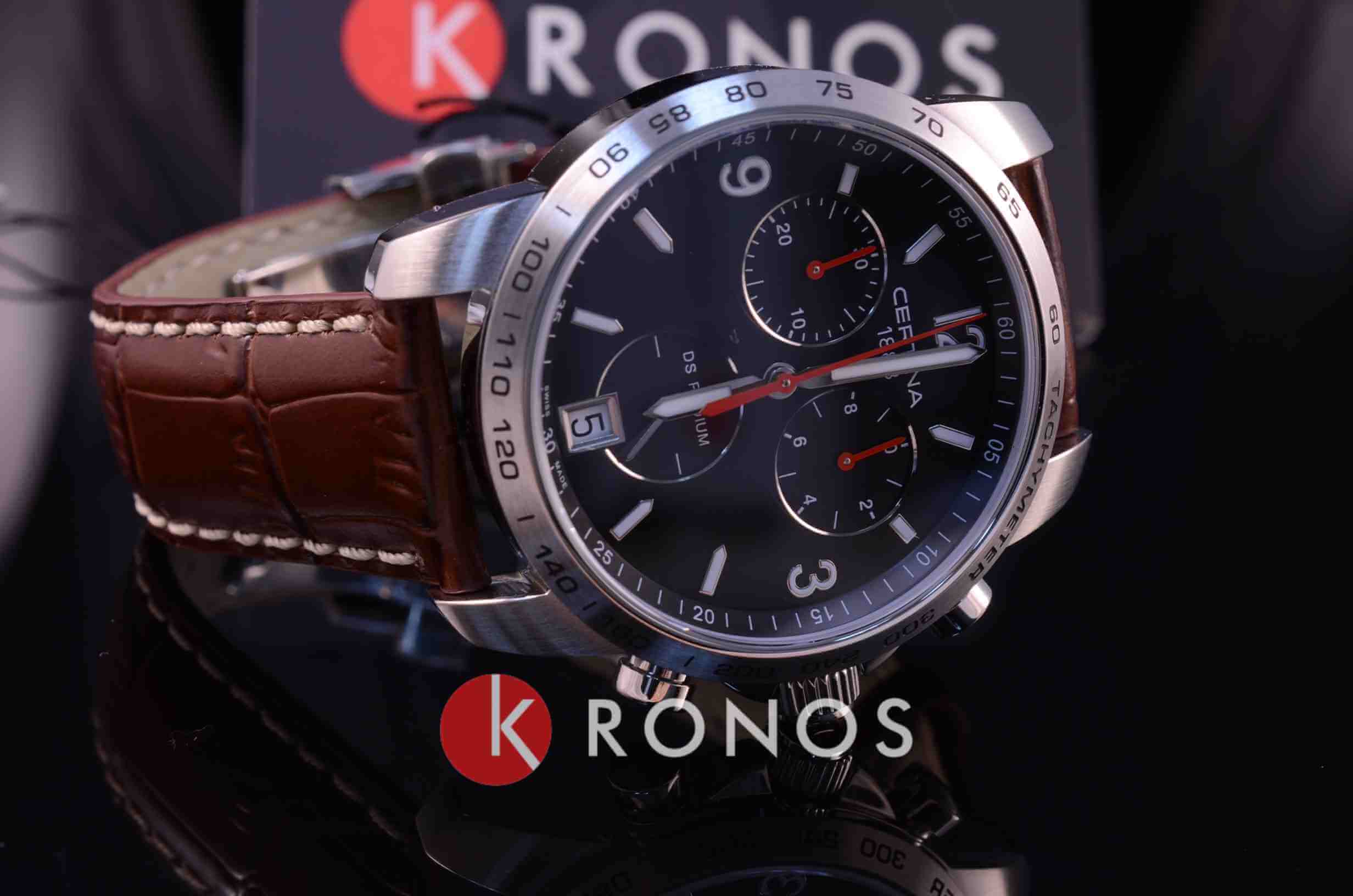 Элегантный хронографХронографФункция позволяет измерять отрезки времени с особой точностью: часы, минуты, секунды. Верным признаком хронографа является наличие на циферблате 3 дополнительных окошек-счётчиков. с коричневым ремешком из натуральной кожи идеально завершит образ делового мужчины. Швейцарский кварцевый калибр ETA G10.211 измеряет время с высокой точностью хода. Стрелки имеют люминесцентное покрытиеЛюминесцентное покрытиеПозволяет считывать показания времени в темноте. Производители наносят на стрелки, часовые индексы, безель или поверхность циферблата светонакопительный состав, дающий холодное свечение.. Функции: секундомер, EOLEOLПредставляет собой систему, уведомляющую владельца часов о необходимости замены элемента питания. За 2 недели до полного разряда батарейки секундная стрелка перестаёт ходить чётко и начинает перепрыгивать на 3-4 деления., дата, тахиметрТахиметрРазмеченная шкала, располагается на ободке или безеле часов. Тахиметр позволяет рассчитать скорость на определённом участке пути, расстояние измеряется в километрах или милях..