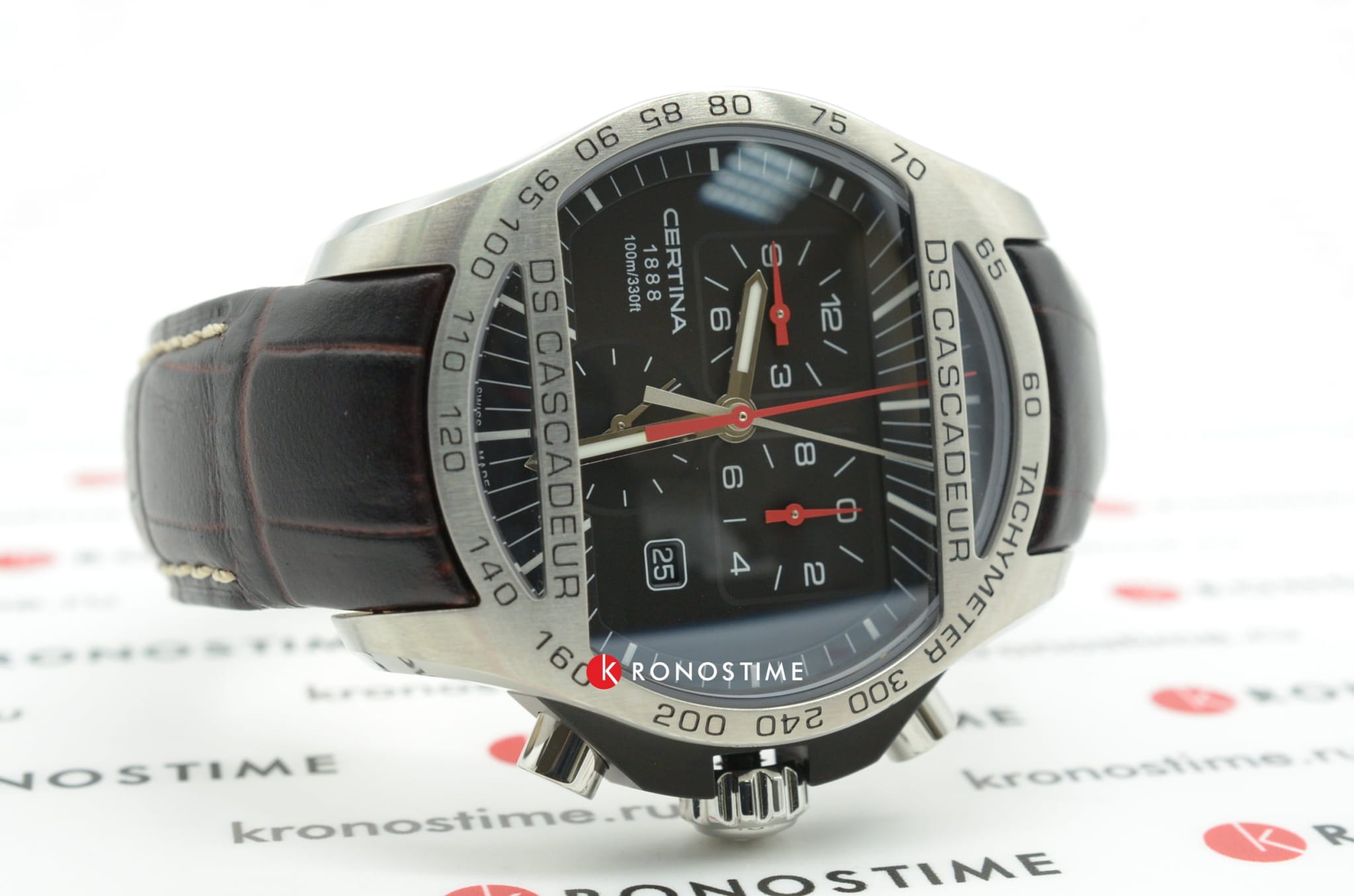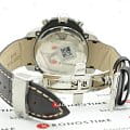 ХронографХронографФункция позволяет измерять отрезки времени с особой точностью: часы, минуты, секунды. Верным признаком хронографа является наличие на циферблате 3 дополнительных окошек-счётчиков. в спортивном стиле имеет циферблат с красными акцентами. Аксессуар оснащён функцией секундомера, тахиметраТахиметрРазмеченная шкала, располагается на ободке или безеле часов. Тахиметр позволяет рассчитать скорость на определённом участке пути, расстояние измеряется в километрах или милях., отображает текущую дату. Швейцарский кварцевый механизм ETA 251.262 отличается высокой точностью хода. Ремешок выполнен из натуральной телячьей кожи.