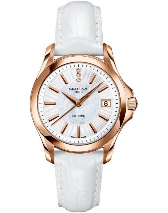 Вместо метки 12 часов использованы бриллианты оттенка Top Wesselton. Стальной корпус с PVD-покрытиемPVDУльтратонкое покрытие наносится в технике вакуумного напыления, сочетает в себе нитрид титана особой прочности со слоем золота или оксида хрома. Несёт в себе декоративную или защитную функцию. основан на концепции Двойной надёжности DS ConceptDS ConceptDouble Security Concept, обозначает двойную надёжность и безупречную точность часов Certina. Двойная система защиты подразумевает обеспечение максимальной устойчивости к ударам и высоких показателей водонепроницаемости.. Часы оснащены кварцевым швейцарским калибром ETA F05.111. Белый ремешок выполнен из натуральной кожи.