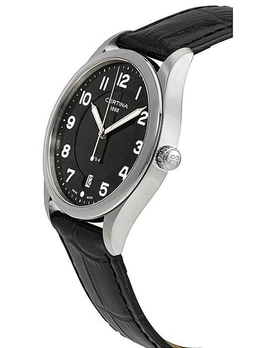 Классический циферблат чёрного цвета дополнен серебристыми стрелками, метками и арабскими цифрами, ярко выделяющимися на тёмном фоне. Ремешок из натуральной кожи с тиснением, имитирующим кожу крокодила, позволит привнести в образ нотки элегантности. Кварцевый калибр ETA E64.111. Антибликовое покрытие сапфирового стекла. Надёжный корпус из нержавеющей стали 316L. Яркая люминесцентная подсветкаЛюминесцентное покрытиеПозволяет считывать показания времени в темноте. Производители наносят на стрелки, часовые индексы, безель или поверхность циферблата светонакопительный состав, дающий холодное свечение.. Концепция ударопрочности DS Concept DS ConceptDouble Security Concept, обозначает двойную надёжность и безупречную точность часов Certina. Двойная система защиты подразумевает обеспечение максимальной устойчивости к ударам и высоких показателей водонепроницаемости.. Водостойкость 100 метров. Апертура даты, индикатор EOLEOLПредставляет собой систему, уведомляющую владельца часов о необходимости замены элемента питания. За 2 недели до полного разряда батарейки секундная стрелка перестаёт ходить чётко и начинает перепрыгивать на 3-4 деления.. Диаметр корпуса: 37 мм.