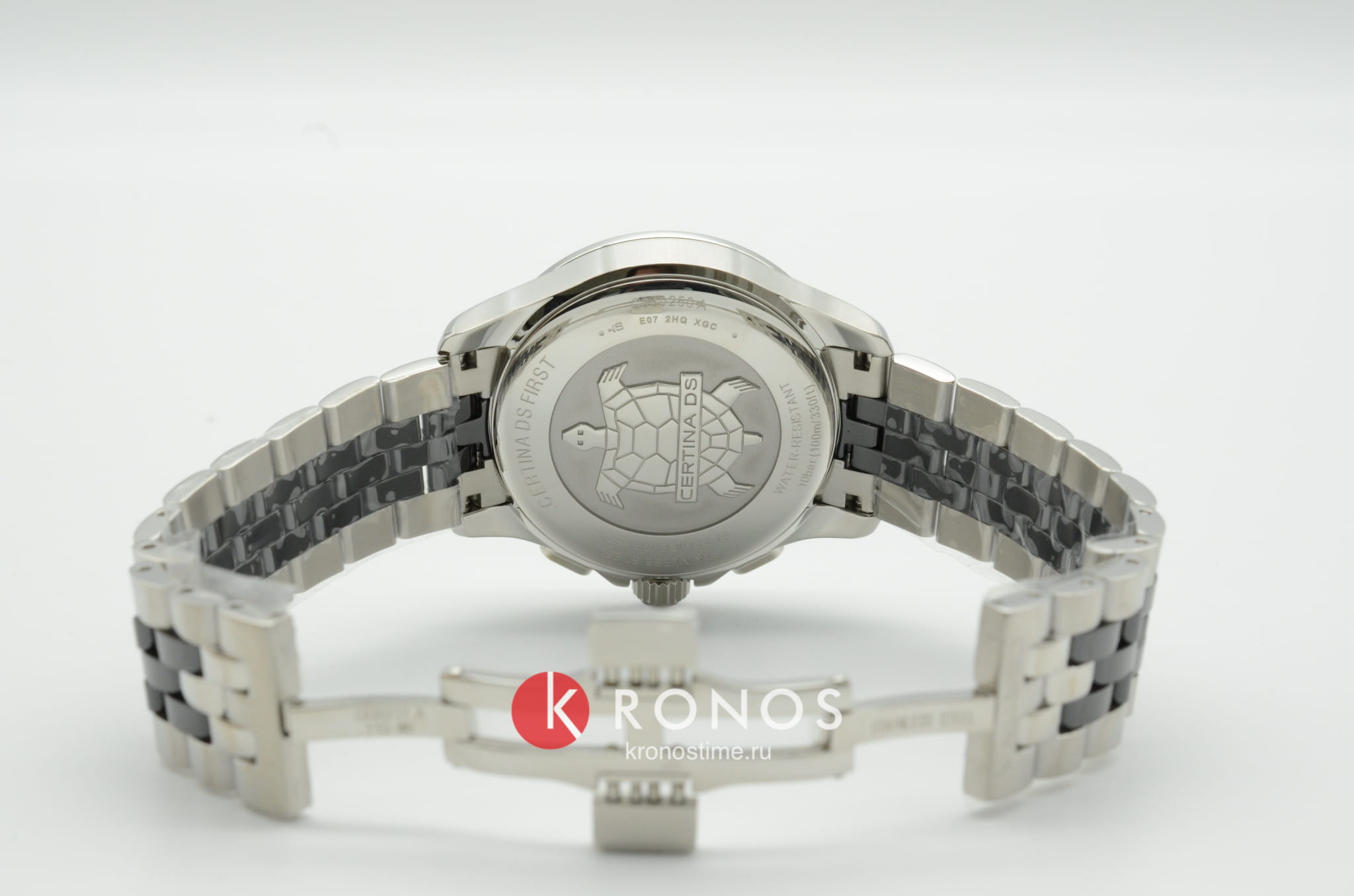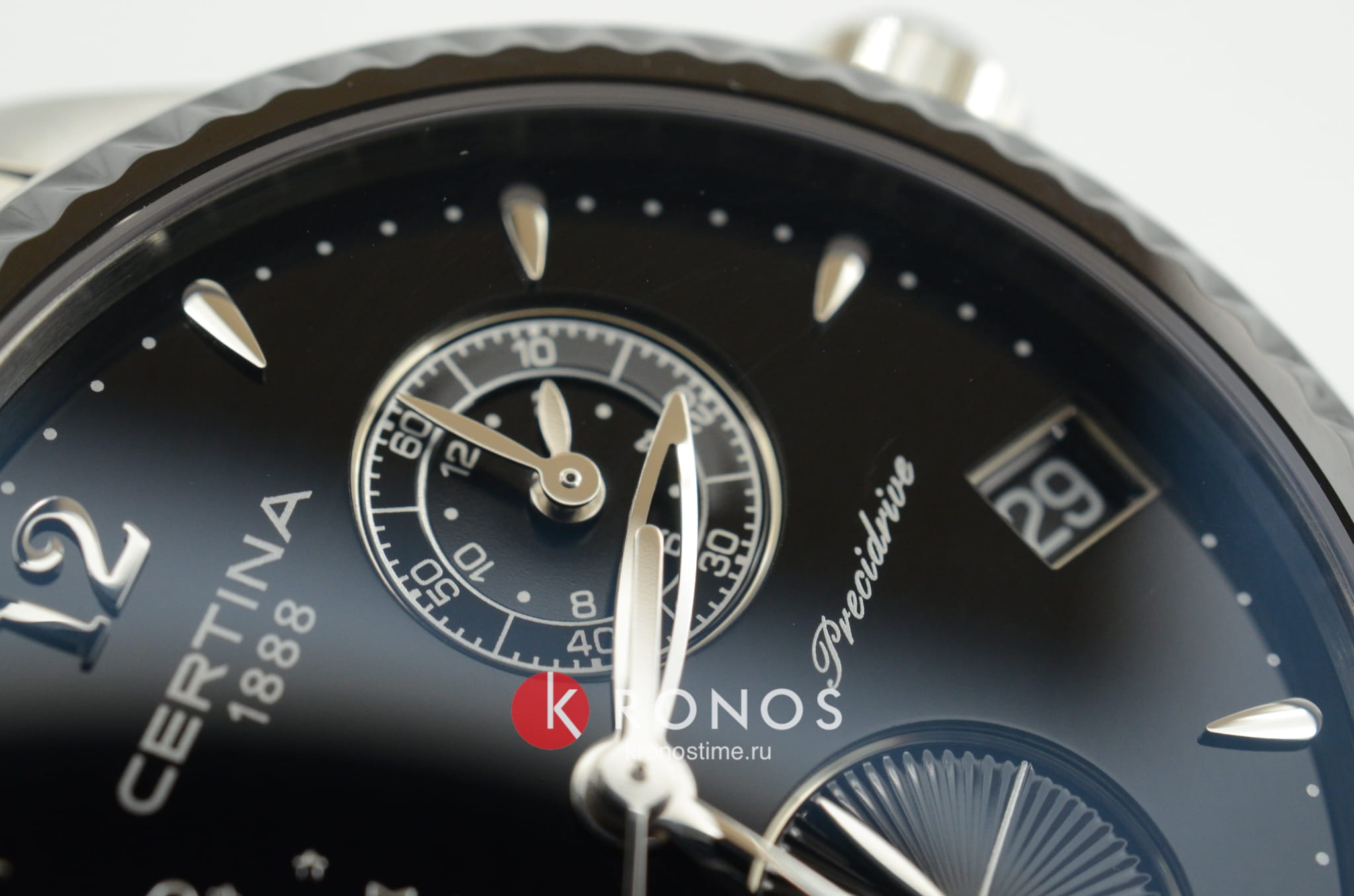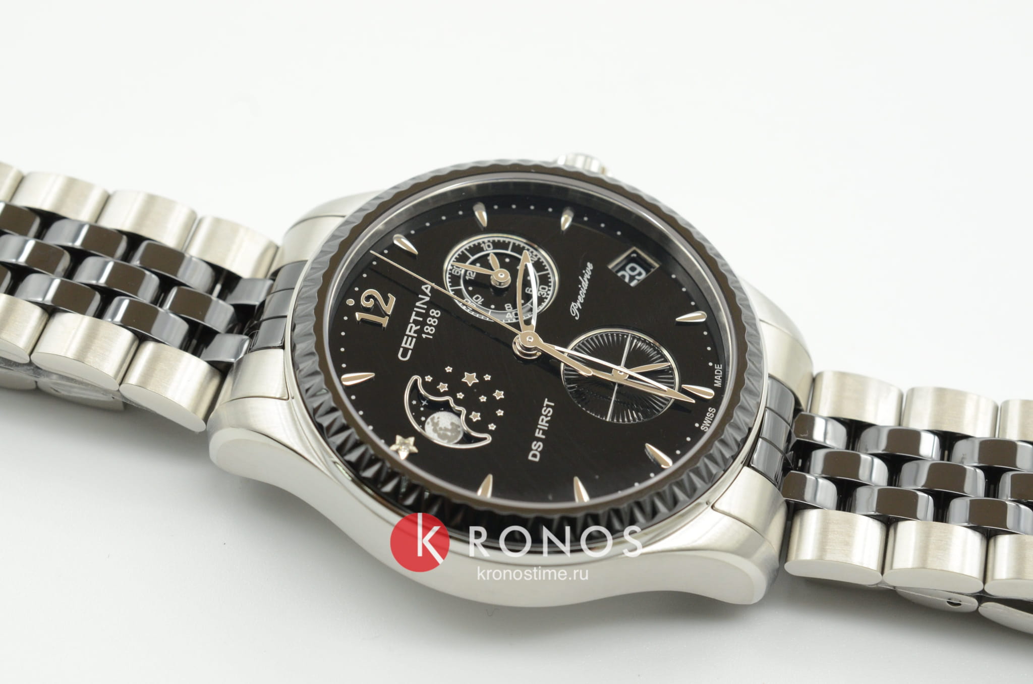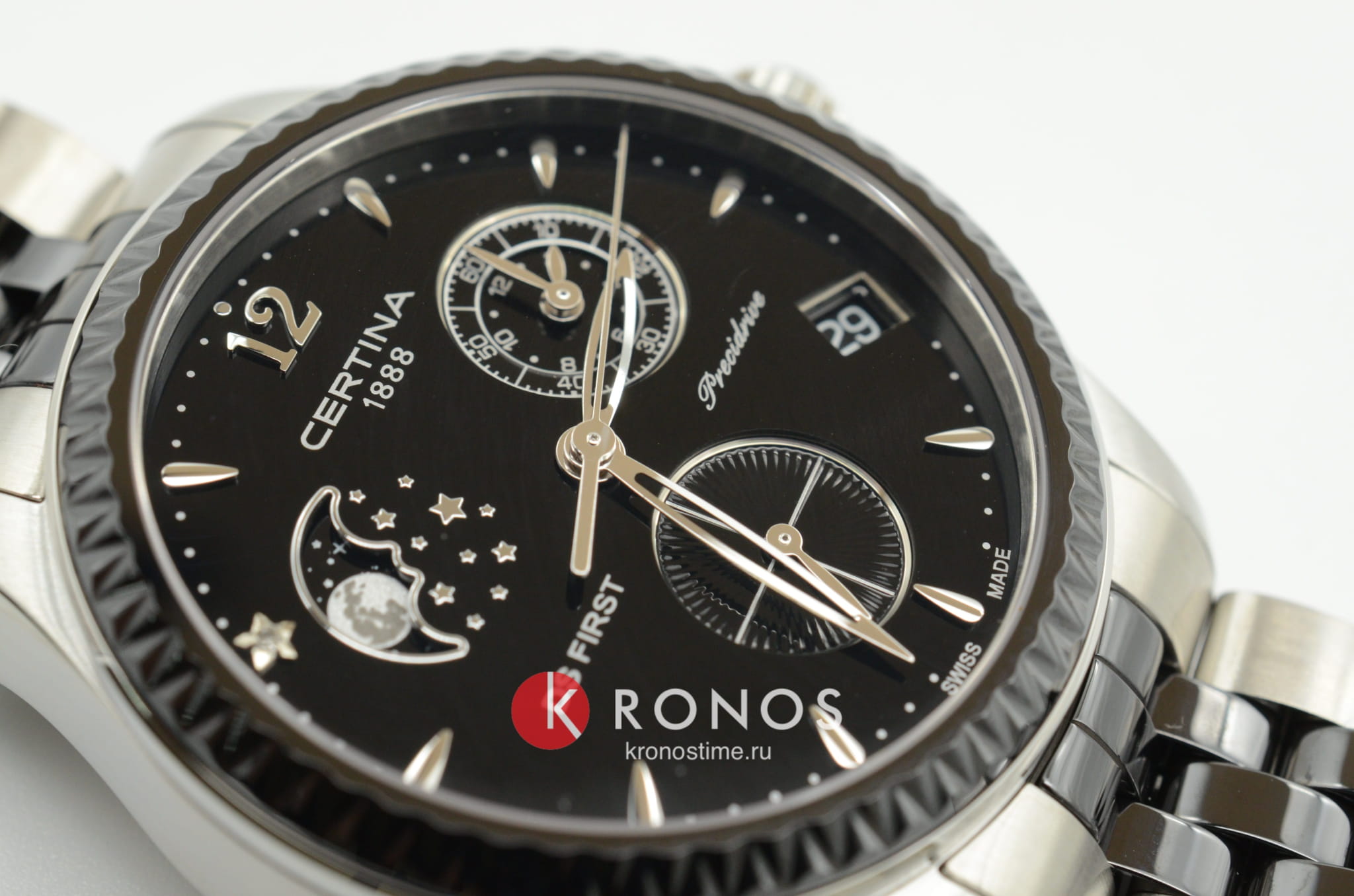 Окошко на позиции 10 часов отображает лунные фазы, стильно смотрится бриллиантовая звезда. Кварцевый швейцарский механизм G10.962 Precidrive™Precidrive™Инновационный кварцевый механизм Certina. Часы, оснащённые этим швейцарским калибром, приравниваются к точности к сертифицированным хронометрам, точность хода составляет +/-10 секунд в год.. БезельБезельВнешний ободок, закрепляющий стекло. В спортивных часах так называется поворотное кольцо с делениями на циферблате, выполняет роль таймера – замеряет отрезки времени на шкале. Неподвижный безель – элемент декора. Однонаправленно вращающийся безель на дайверских часах позволяет фиксировать моменты погружения и выныривания на поверхность. и вставки для браслета из керамики. EOLEOLПредставляет собой систему, уведомляющую владельца часов о необходимости замены элемента питания. За 2 недели до полного разряда батарейки секундная стрелка перестаёт ходить чётко и начинает перепрыгивать на 3-4 деления., календарь, хронографХронографФункция позволяет измерять отрезки времени с особой точностью: часы, минуты, секунды. Верным признаком хронографа является наличие на циферблате 3 дополнительных окошек-счётчиков..
