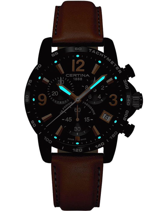 Аксессуар станет неотъемлемым атрибутом образа, наполнит его стильной динамичностью. Швейцарский кварцевый калибр ETA G10.212 Precidrive™Precidrive™Инновационный кварцевый механизм Certina. Часы, оснащённые этим швейцарским калибром, приравниваются к точности к сертифицированным хронометрам, точность хода составляет +/-10 секунд в год. измеряет время с абсолютной точностью, позволяя всегда находиться в центре событий. Концепция Двойной Надёжности DS ConceptDS ConceptDouble Security Concept, обозначает двойную надёжность и безупречную точность часов Certina. Двойная система защиты подразумевает обеспечение максимальной устойчивости к ударам и высоких показателей водонепроницаемости.. Антибликовая поверхность стекла из сапфира. Люминесцентная подсветкаЛюминесцентное покрытиеПозволяет считывать показания времени в темноте. Производители наносят на стрелки, часовые индексы, безель или поверхность циферблата светонакопительный состав, дающий холодное свечение. стрелок. БезельБезельВнешний ободок, закрепляющий стекло. В спортивных часах так называется поворотное кольцо с делениями на циферблате, выполняет роль таймера – замеряет отрезки времени на шкале. Неподвижный безель – элемент декора. Однонаправленно вращающийся безель на дайверских часах позволяет фиксировать моменты погружения и выныривания на поверхность. со шкалой тахиметраТахиметрРазмеченная шкала, располагается на ободке или безеле часов. Тахиметр позволяет рассчитать скорость на определённом участке пути, расстояние измеряется в километрах или милях.. Заводная головка с системой защиты. Ударопрочный корпусУдаропрочный корпусМеханизм заключён в корпус, выполненный из современных материалов, устойчивых к ударам, механическим повреждениям и падению с высоты: инновационный пластик, карбон, нержавеющая сталь, титан. из нержавеющей стали с чёрным PVD-покрытиемPVDУльтратонкое покрытие наносится в технике вакуумного напыления, сочетает в себе нитрид титана особой прочности со слоем золота или оксида хрома. Несёт в себе декоративную или защитную функцию.. Ремешок из натуральной кожи. Безопасная . Окошко даты, секундомер, измеряющий десятые доли секунды, индикатор EOLEOLПредставляет собой систему, уведомляющую владельца часов о необходимости замены элемента питания. За 2 недели до полного разряда батарейки секундная стрелка перестаёт ходить чётко и начинает перепрыгивать на 3-4 деления.. Диаметр корпуса: 41 мм.