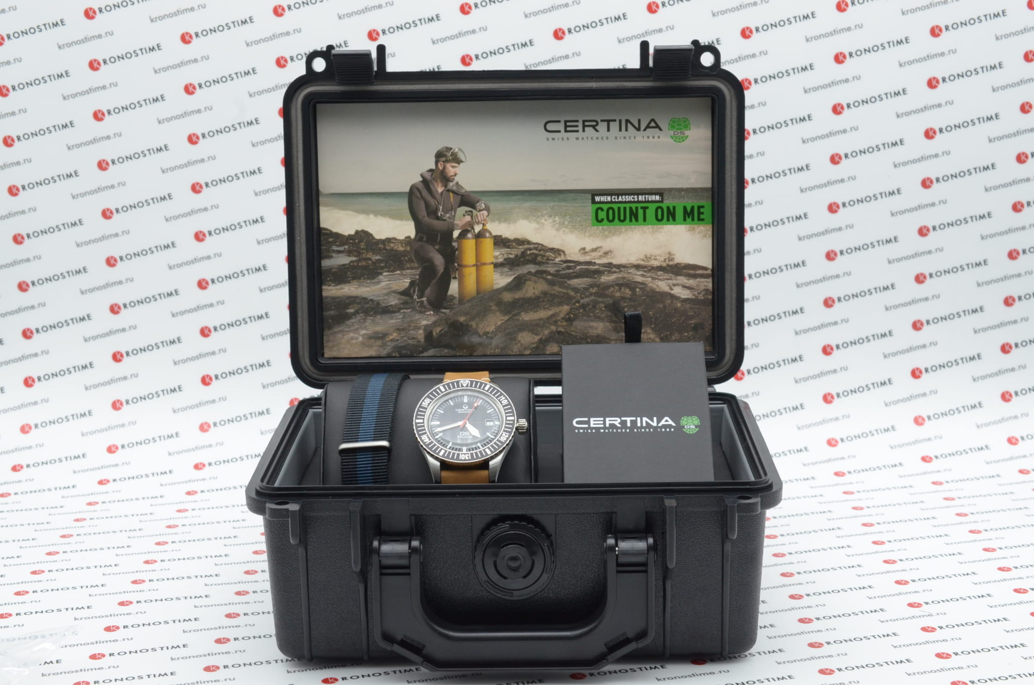 Оригинальный чёрный циферблат понравится ценителям ретро-дизайна. В комплекте с тканевым полосатым ремешком вы получаете дополнительный вариант из натуральной кожи. Меняя их, вы можете экспериментировать с разными стилями. Уникальностью обладает не только аксессуар, но и упаковка, сделанная в виде бокса для дайвинга. Часы комплектуются автоматическим механизмом ETA Powermatic 80Powermatic 80Эксклюзивный калибр от швейцарской компании ETA с увеличенным запасом хода до 80 часов за счёт удлинённой заводной пружины. Характеризуется улучшенной системой спуска со сниженным трением. с 80-часовым запасом хода. Технология DS ConceptDS ConceptDouble Security Concept, обозначает двойную надёжность и безупречную точность часов Certina. Двойная система защиты подразумевает обеспечение максимальной устойчивости к ударам и высоких показателей водонепроницаемости.. Стекло с покрытием Nex scratchguard, устойчивым к царапинам. Вращающийся безельБезельВнешний ободок, закрепляющий стекло. В спортивных часах так называется поворотное кольцо с делениями на циферблате, выполняет роль таймера – замеряет отрезки времени на шкале. Неподвижный безель – элемент декора. Однонаправленно вращающийся безель на дайверских часах позволяет фиксировать моменты погружения и выныривания на поверхность.. Диаметр корпуса: 42,8 мм.