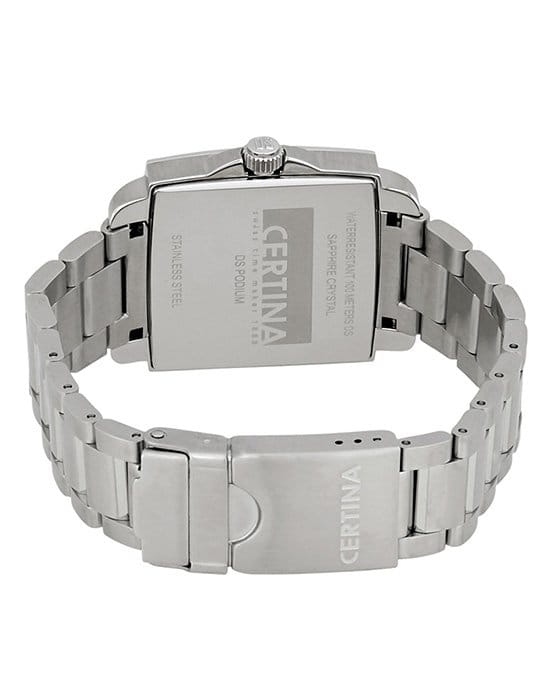 Стильным решением стал квадратный корпус из антикоррозионной стали 316L. Швейцарский кварцевый калибр ETA F06.161 обеспечивает высокую точность хода. Технология DS Concept DS ConceptDouble Security Concept, обозначает двойную надёжность и безупречную точность часов Certina. Двойная система защиты подразумевает обеспечение максимальной устойчивости к ударам и высоких показателей водонепроницаемости. реализует ударопрочность аксессуара. Антибликовое покрытие сапфирового стекла.