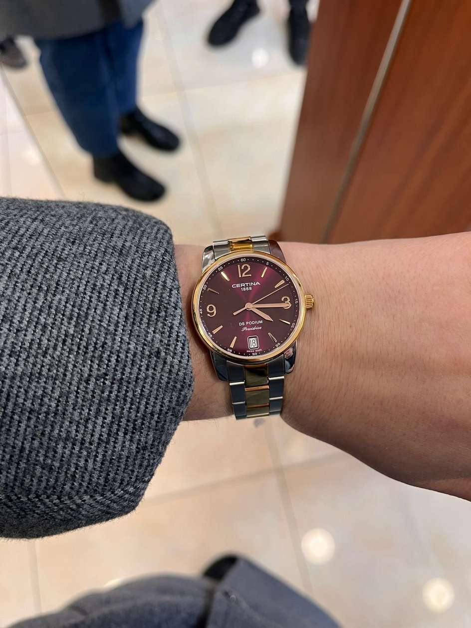 Модель с изысканной формой корпуса умело комбинирует элегантность и спортивный стиль, претворяя в жизнь универсальные часы для делового, повседневного или вечернего наряда. Они оснащены кварцевым швейцарским калибром ETA F03.411 Precidrive™Precidrive™Инновационный кварцевый механизм Certina. Часы, оснащённые этим швейцарским калибром, приравниваются к точности к сертифицированным хронометрам, точность хода составляет +/-10 секунд в год., обеспечивающим абсолютную точность показателей. Сапфировое стекло с односторонним антибликовым покрытием защищает яркий циферблат. Водостойкость 100 метров. Концепция DS ConceptDS ConceptDouble Security Concept, обозначает двойную надёжность и безупречную точность часов Certina. Двойная система защиты подразумевает обеспечение максимальной устойчивости к ударам и высоких показателей водонепроницаемости.. Нержавеющая сталь с частичным PVD-покрытиемPVDУльтратонкое покрытие наносится в технике вакуумного напыления, сочетает в себе нитрид титана особой прочности со слоем золота или оксида хрома. Несёт в себе декоративную или защитную функцию. цвета розового золота. . Апертура даты, функция EOLEOLПредставляет собой систему, уведомляющую владельца часов о необходимости замены элемента питания. За 2 недели до полного разряда батарейки секундная стрелка перестаёт ходить чётко и начинает перепрыгивать на 3-4 деления.. Диаметр корпуса: 33 мм.