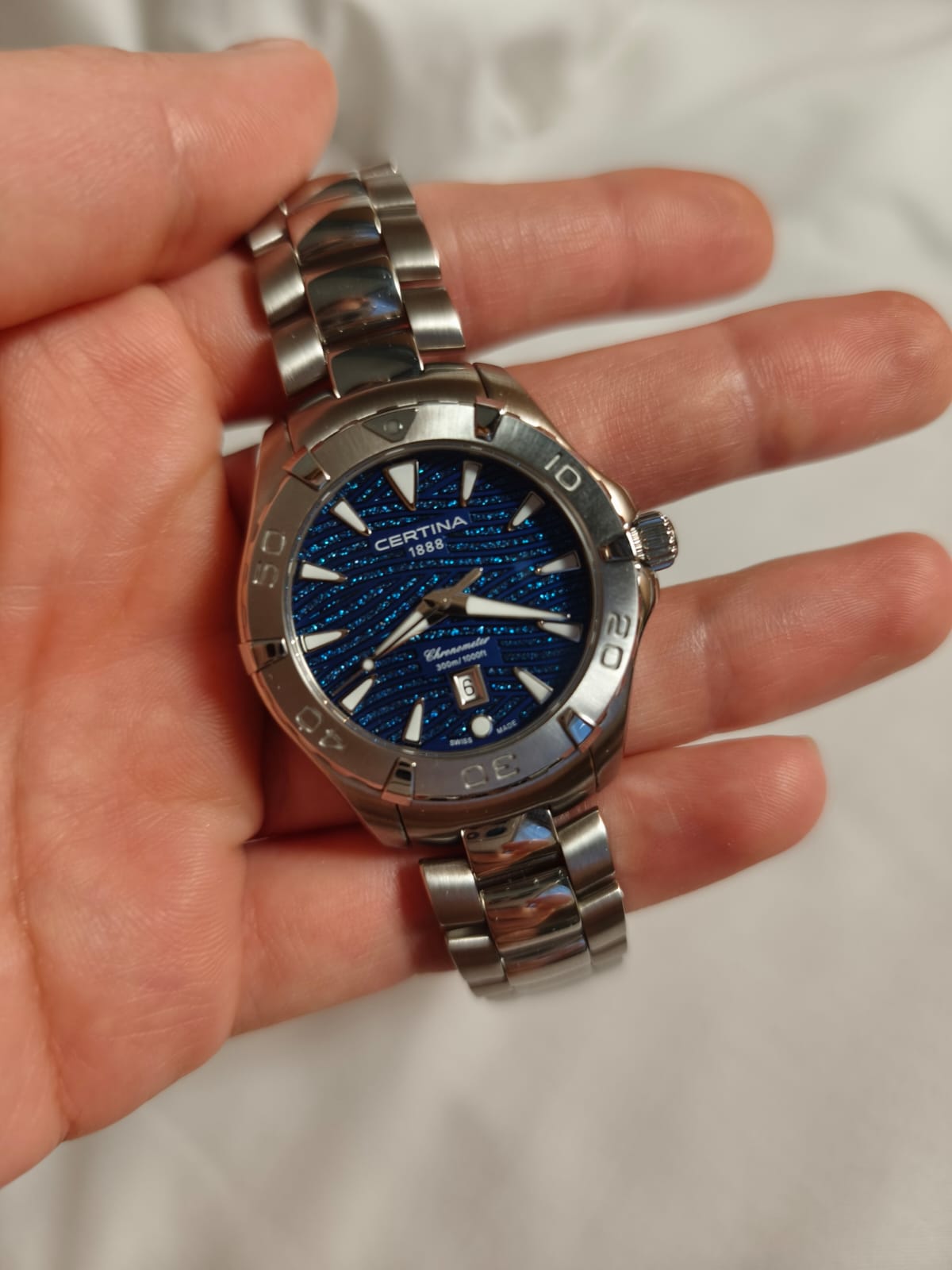 Компактный циферблат дополнен необычным узором в виде волн с блестящими акцентами, что стало выражением любви бренда Certina к морской стихии. Изящный аксессуар внутри просто «кремень», чему способствует система DS ConceptDS ConceptDouble Security Concept, обозначает двойную надёжность и безупречную точность часов Certina. Двойная система защиты подразумевает обеспечение максимальной устойчивости к ударам и высоких показателей водонепроницаемости.: водонепроницаемость 300 метров, завинчивающаяся задняя крышка и заводная головка с системой блокировки, сапфировое стекло, хирургическая сталь 316L. Швейцарский кварцевый механизм ETA F04.411 Precidrive™Precidrive™Инновационный кварцевый механизм Certina. Часы, оснащённые этим швейцарским калибром, приравниваются к точности к сертифицированным хронометрам, точность хода составляет +/-10 секунд в год. отмечен сертификатом хронометра COSCСертификат COSCОфициальный сертификат, подтверждающий то, что часы ходят с особо высокой точностью. Для получения документа часы подвергаются тестовым испытаниям, разработанным швейцарским институтом тестирования хронометров COSC. Допустимая норма для механических часов -4/+6 секунд в день, для кварцевых моделей +/- 0,07 секунд в день. за безупречную точность хода. Вращающийся безельБезельВнешний ободок, закрепляющий стекло. В спортивных часах так называется поворотное кольцо с делениями на циферблате, выполняет роль таймера – замеряет отрезки времени на шкале. Неподвижный безель – элемент декора. Однонаправленно вращающийся безель на дайверских часах позволяет фиксировать моменты погружения и выныривания на поверхность.. Яркая люминесцентная подсветкаЛюминесцентное покрытиеПозволяет считывать показания времени в темноте. Производители наносят на стрелки, часовые индексы, безель или поверхность циферблата светонакопительный состав, дающий холодное свечение.. Апертура даты, функция EOLEOLПредставляет собой систему, уведомляющую владельца часов о необходимости замены элемента питания. За 2 недели до полного разряда батарейки секундная стрелка перестаёт ходить чётко и начинает перепрыгивать на 3-4 деления.. Диаметр корпуса: 34 мм.