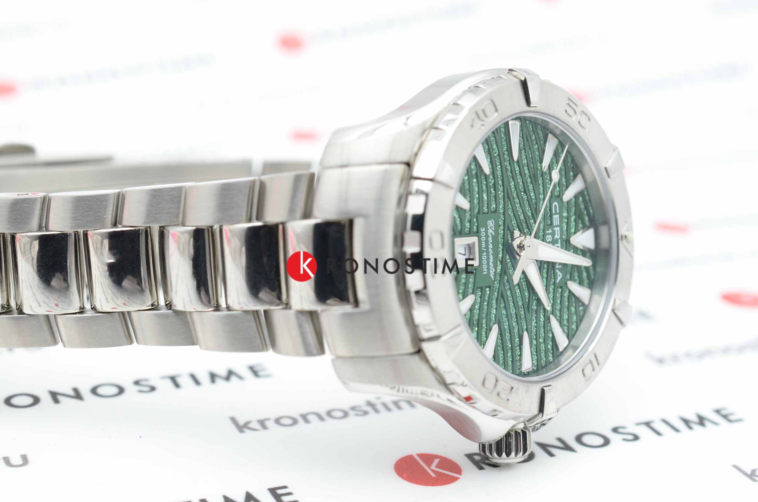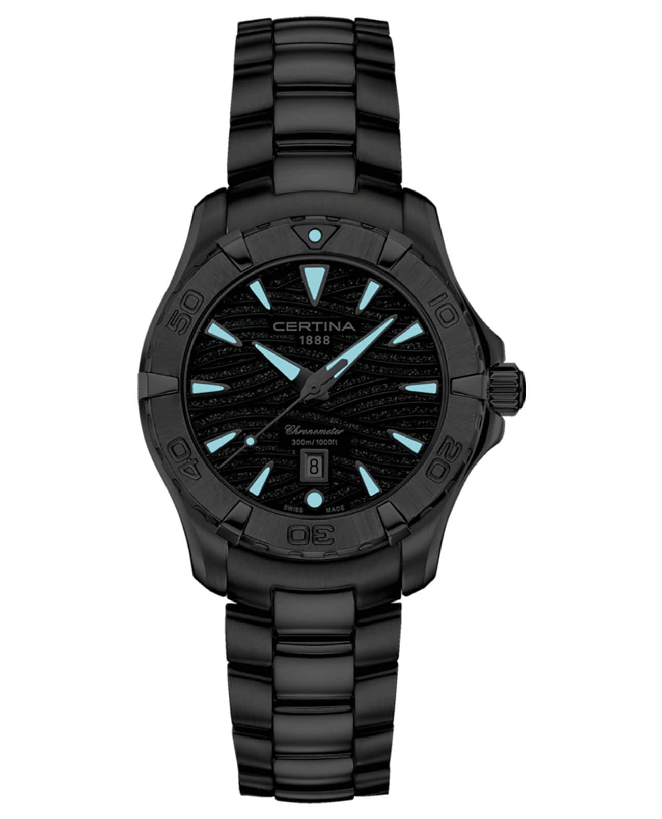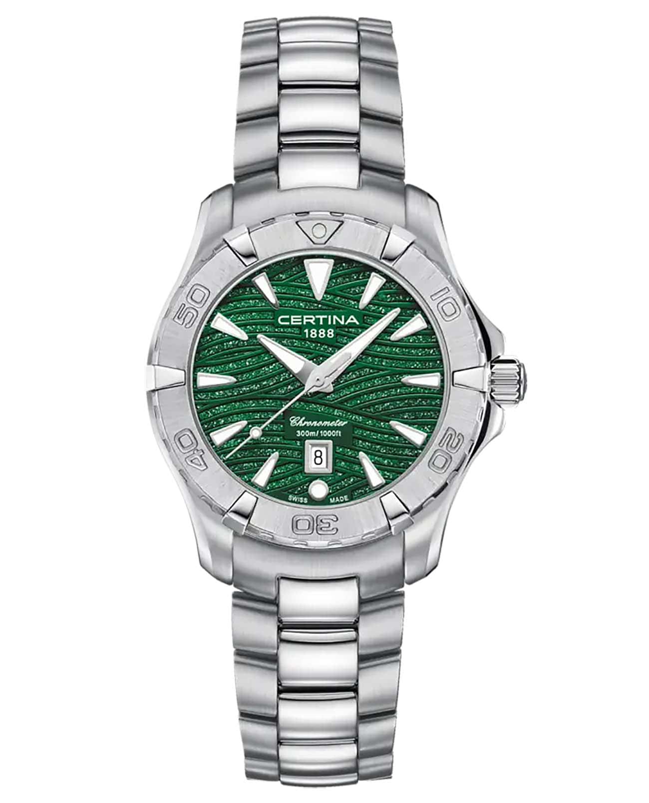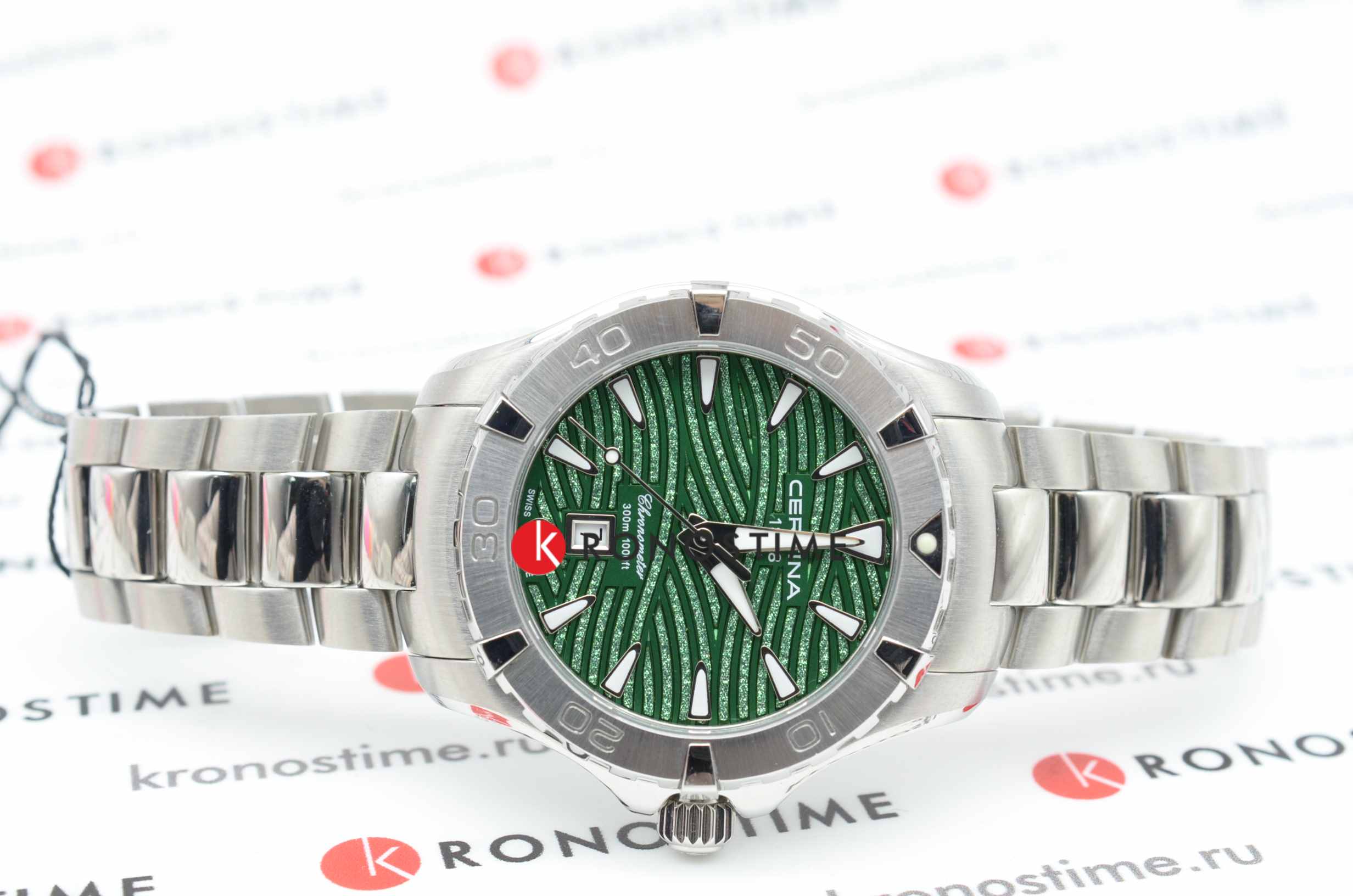 Компактный циферблат дополнен необычным узором в виде волн с блестящими акцентами, что стало выражением любви бренда Certina к морской стихии. Изящный аксессуар внутри просто «кремень», чему способствует система DS ConceptDS ConceptDouble Security Concept, обозначает двойную надёжность и безупречную точность часов Certina. Двойная система защиты подразумевает обеспечение максимальной устойчивости к ударам и высоких показателей водонепроницаемости.: водонепроницаемость 300 метров, завинчивающаяся задняя крышка и заводная головка с системой блокировки, сапфировое стекло, хирургическая сталь 316L. Швейцарский кварцевый механизм ETA F04.411 Precidrive™Precidrive™Инновационный кварцевый механизм Certina. Часы, оснащённые этим швейцарским калибром, приравниваются к точности к сертифицированным хронометрам, точность хода составляет +/-10 секунд в год. отмечен сертификатом хронометра COSCСертификат COSCОфициальный сертификат, подтверждающий то, что часы ходят с особо высокой точностью. Для получения документа часы подвергаются тестовым испытаниям, разработанным швейцарским институтом тестирования хронометров COSC. Допустимая норма для механических часов -4/+6 секунд в день, для кварцевых моделей +/- 0,07 секунд в день. за безупречную точность хода. Вращающийся безельБезельВнешний ободок, закрепляющий стекло. В спортивных часах так называется поворотное кольцо с делениями на циферблате, выполняет роль таймера – замеряет отрезки времени на шкале. Неподвижный безель – элемент декора. Однонаправленно вращающийся безель на дайверских часах позволяет фиксировать моменты погружения и выныривания на поверхность.. Яркая люминесцентная подсветкаЛюминесцентное покрытиеПозволяет считывать показания времени в темноте. Производители наносят на стрелки, часовые индексы, безель или поверхность циферблата светонакопительный состав, дающий холодное свечение.. Апертура даты, функция EOLEOLПредставляет собой систему, уведомляющую владельца часов о необходимости замены элемента питания. За 2 недели до полного разряда батарейки секундная стрелка перестаёт ходить чётко и начинает перепрыгивать на 3-4 деления.. Диаметр корпуса: 34 мм.