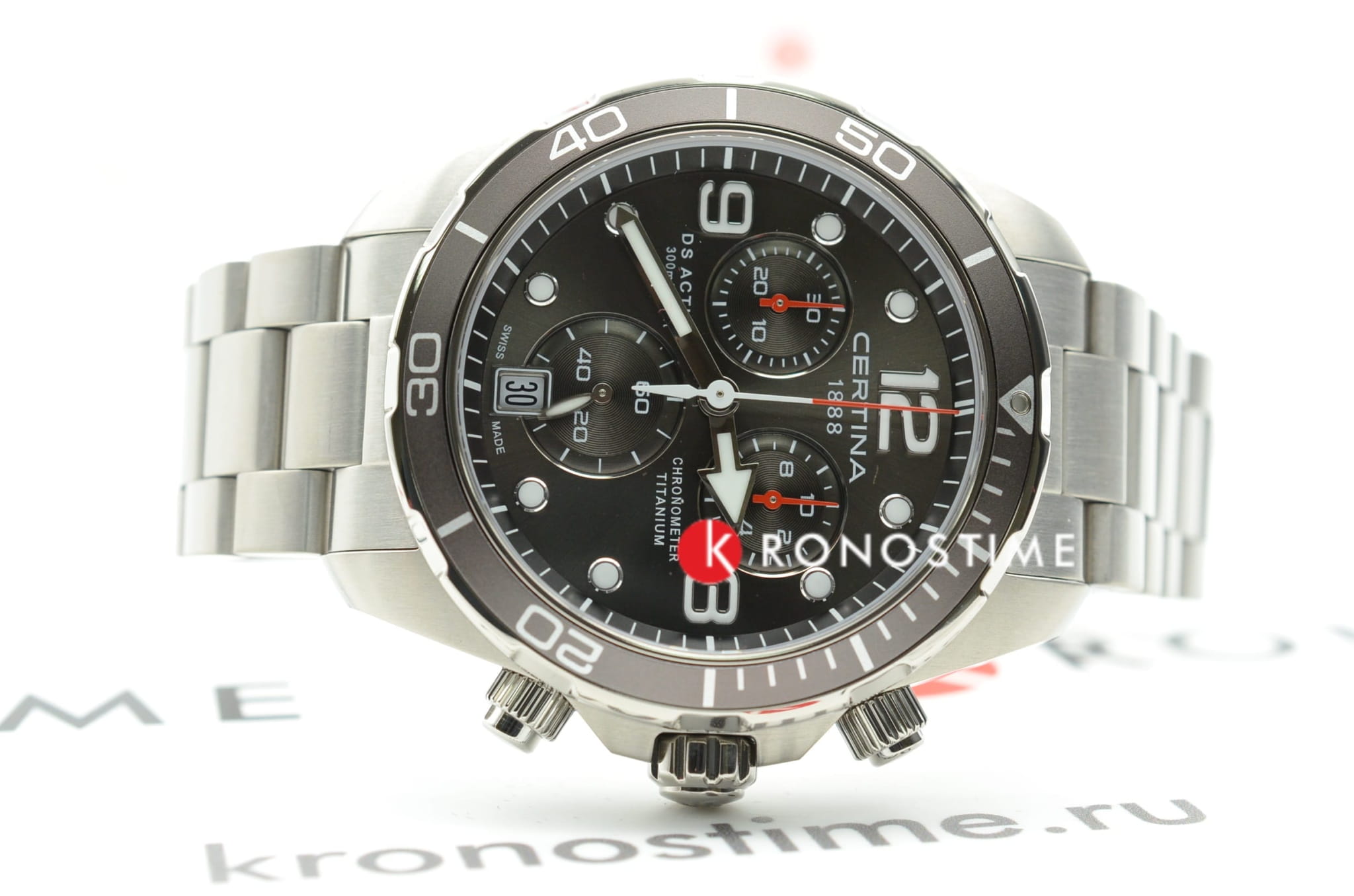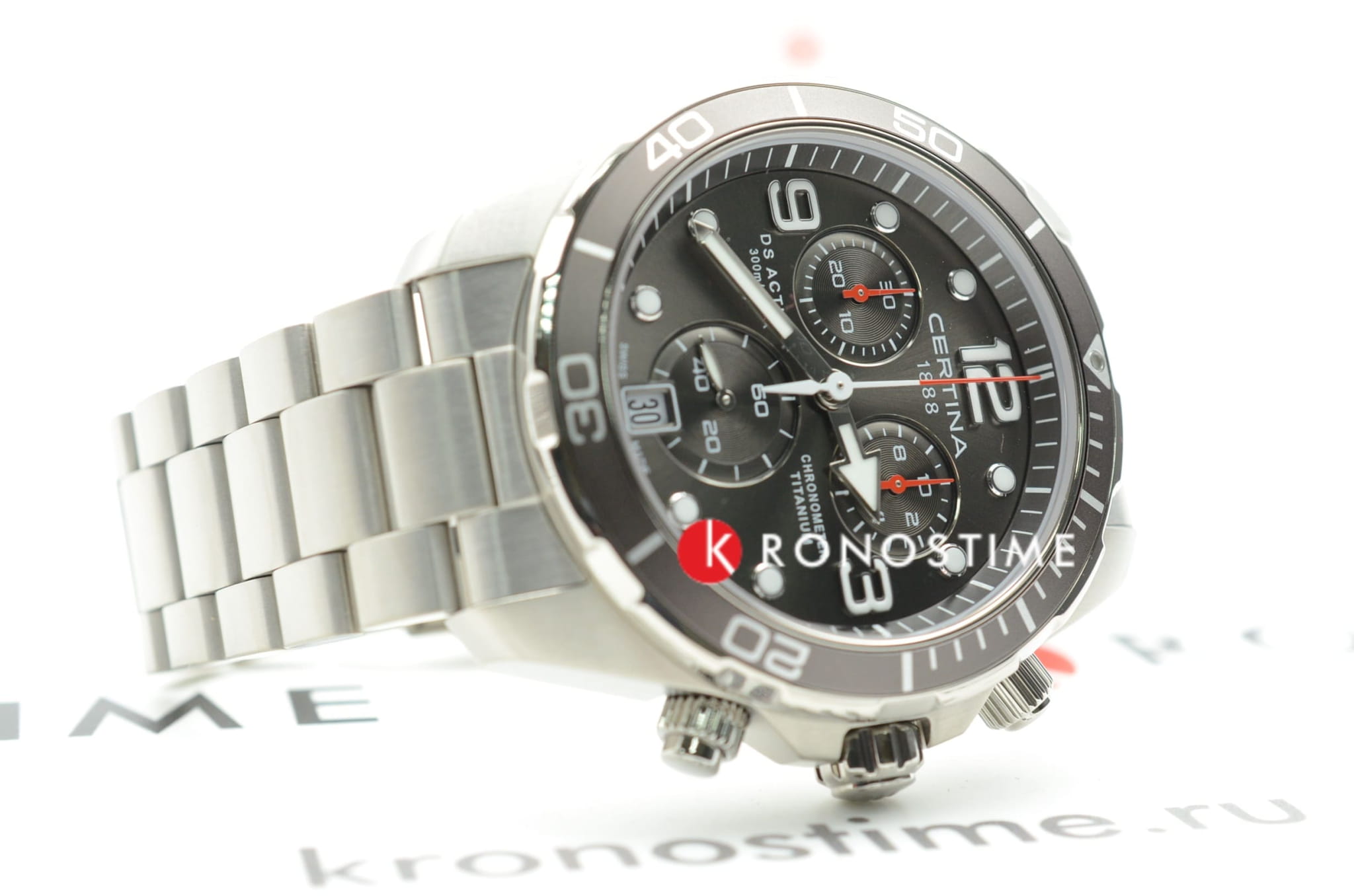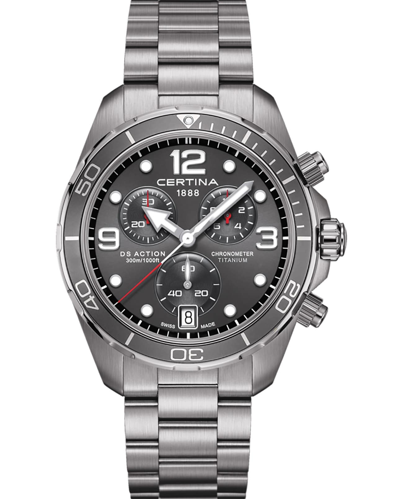 Дайверский хронографХронографФункция позволяет измерять отрезки времени с особой точностью: часы, минуты, секунды. Верным признаком хронографа является наличие на циферблате 3 дополнительных окошек-счётчиков. станет идеальным завершением делового, повседневного образа. Модель сделана из гипоаллергенного титана, востребованного благодаря прочности и антимагнетизму. Точность хода швейцарского автоматического механизма G10.212 AA PRECIDRIVE приравнивается к хронометрической, что подтверждено сертификатом COSCСертификат COSCОфициальный сертификат, подтверждающий то, что часы ходят с особо высокой точностью. Для получения документа часы подвергаются тестовым испытаниям, разработанным швейцарским институтом тестирования хронометров COSC. Допустимая норма для механических часов -4/+6 секунд в день, для кварцевых моделей +/- 0,07 секунд в день.. Улучшению читаемости показателей в солнечные дни способствует антибликовое покрытие сапфирового стекла. Максимальная водостойкость 300 метров. Концепция DSDS ConceptDouble Security Concept, обозначает двойную надёжность и безупречную точность часов Certina. Двойная система защиты подразумевает обеспечение максимальной устойчивости к ударам и высоких показателей водонепроницаемости.. Люминесцентная подсветкаЛюминесцентное покрытиеПозволяет считывать показания времени в темноте. Производители наносят на стрелки, часовые индексы, безель или поверхность циферблата светонакопительный состав, дающий холодное свечение.. Секундомер, отображение даты. Диаметр корпуса: 43 мм.