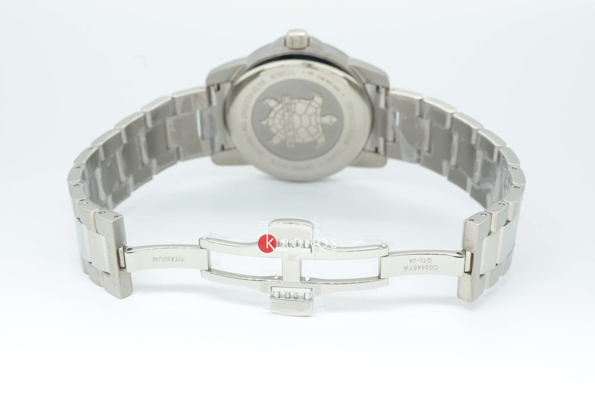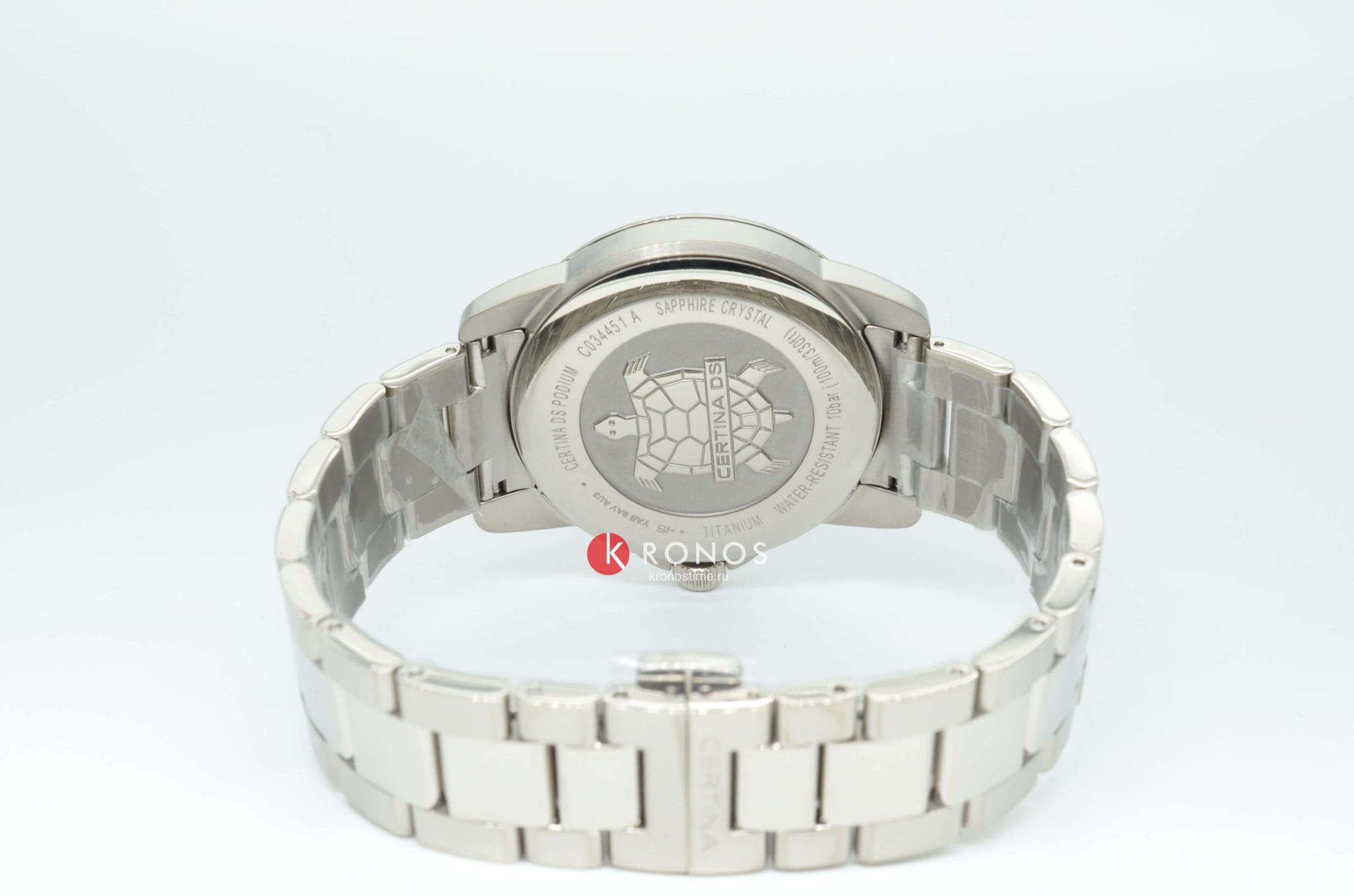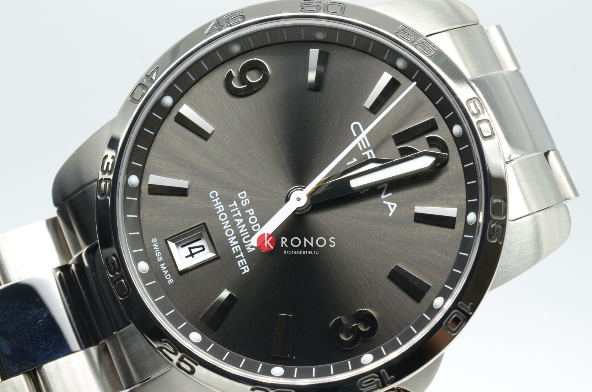 Наручные часы в спортивном стиле дополнены классическими элементами, имеют спокойную расцветку. Антрацитовый циферблат представлен в минималистичном оформлении, арабские цифры, индексы имеют контрастный оттенок. Модель оснащена швейцарским кварцевым механизмом ETA F07.412 Precidrive™Precidrive™Инновационный кварцевый механизм Certina. Часы, оснащённые этим швейцарским калибром, приравниваются к точности к сертифицированным хронометрам, точность хода составляет +/-10 секунд в год.. Безупречная точность калибра отмечена официальным сертификатом хронометра COSCСертификат COSCОфициальный сертификат, подтверждающий то, что часы ходят с особо высокой точностью. Для получения документа часы подвергаются тестовым испытаниям, разработанным швейцарским институтом тестирования хронометров COSC. Допустимая норма для механических часов -4/+6 секунд в день, для кварцевых моделей +/- 0,07 секунд в день.. Аксессуар удобен в эксплуатации, сохраняет ударопрочность и водонепроницаемость 100 метров благодаря концепции Double SecurityDS ConceptDouble Security Concept, обозначает двойную надёжность и безупречную точность часов Certina. Двойная система защиты подразумевает обеспечение максимальной устойчивости к ударам и высоких показателей водонепроницаемости.. Корпус и браслет выполнены из гипоаллергенного титана. Заводная головка с системой блокировки. Яркая люминесцентная подсветкаЛюминесцентное покрытиеПозволяет считывать показания времени в темноте. Производители наносят на стрелки, часовые индексы, безель или поверхность циферблата светонакопительный состав, дающий холодное свечение.. Индикатор EOLEOLПредставляет собой систему, уведомляющую владельца часов о необходимости замены элемента питания. За 2 недели до полного разряда батарейки секундная стрелка перестаёт ходить чётко и начинает перепрыгивать на 3-4 деления., апертура даты. Диаметр корпуса: 40 мм.