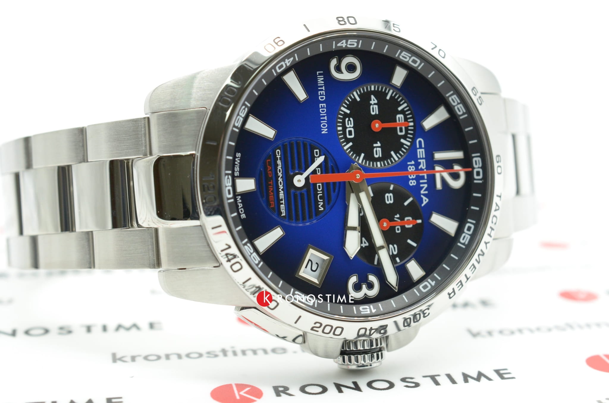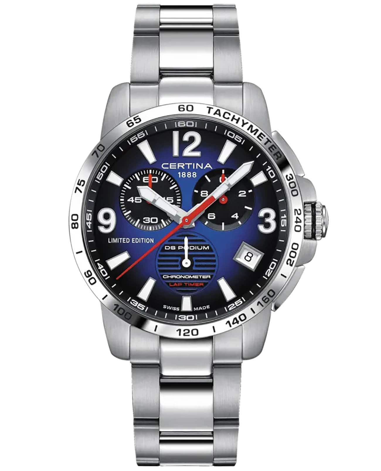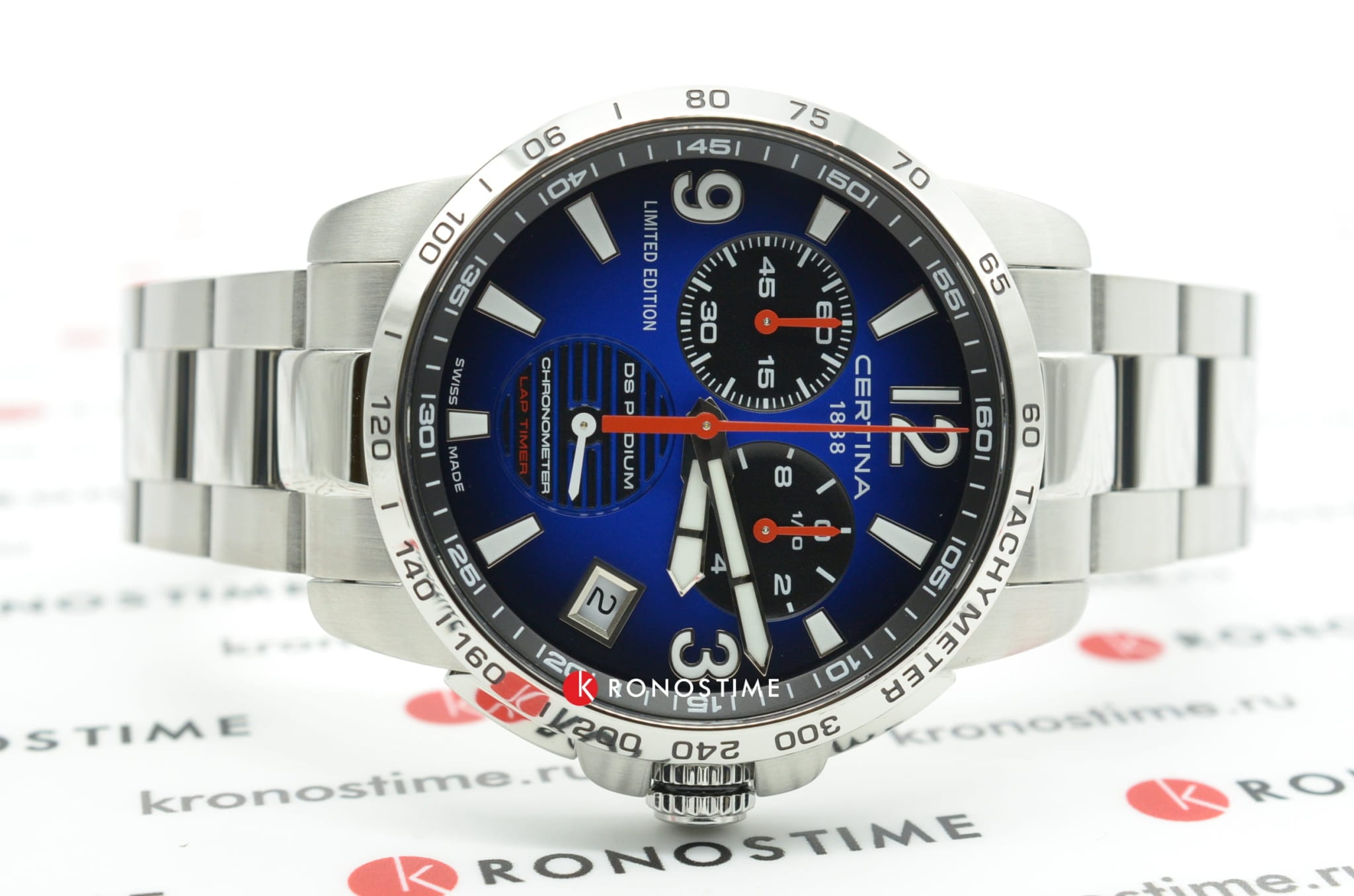 Наручные часы в спортивном стиле привлекают внимание синими деталями, что символизирует скоростное напряжение на гоночной трассе. Отличным дополнением стал браслет из нержавеющей стали. Кварцевый швейцарский механизм ETA G10.212 Precidrive™Precidrive™Инновационный кварцевый механизм Certina. Часы, оснащённые этим швейцарским калибром, приравниваются к точности к сертифицированным хронометрам, точность хода составляет +/-10 секунд в год. с повышенной точностью хода, подтверждённой сертификатом COSCСертификат COSCОфициальный сертификат, подтверждающий то, что часы ходят с особо высокой точностью. Для получения документа часы подвергаются тестовым испытаниям, разработанным швейцарским институтом тестирования хронометров COSC. Допустимая норма для механических часов -4/+6 секунд в день, для кварцевых моделей +/- 0,07 секунд в день.. Система DS ConceptDS ConceptDouble Security Concept, обозначает двойную надёжность и безупречную точность часов Certina. Двойная система защиты подразумевает обеспечение максимальной устойчивости к ударам и высоких показателей водонепроницаемости.. Двухстороннее антибликовое покрытие для стекла из сапфира. Стрелки и индексы с составом SuperLumiNovaЛюминесцентное покрытиеПозволяет считывать показания времени в темноте. Производители наносят на стрелки, часовые индексы, безель или поверхность циферблата светонакопительный состав, дающий холодное свечение.. Заводная головка с защитой. ХронографХронографФункция позволяет измерять отрезки времени с особой точностью: часы, минуты, секунды. Верным признаком хронографа является наличие на циферблате 3 дополнительных окошек-счётчиков., шкала тахиметраТахиметрРазмеченная шкала, располагается на ободке или безеле часов. Тахиметр позволяет рассчитать скорость на определённом участке пути, расстояние измеряется в километрах или милях., календарь, секундомер, индикатор EOLEOLПредставляет собой систему, уведомляющую владельца часов о необходимости замены элемента питания. За 2 недели до полного разряда батарейки секундная стрелка перестаёт ходить чётко и начинает перепрыгивать на 3-4 деления., Lap-функция измерения промежуточного времени (круга). Диаметр корпуса: 42 мм.