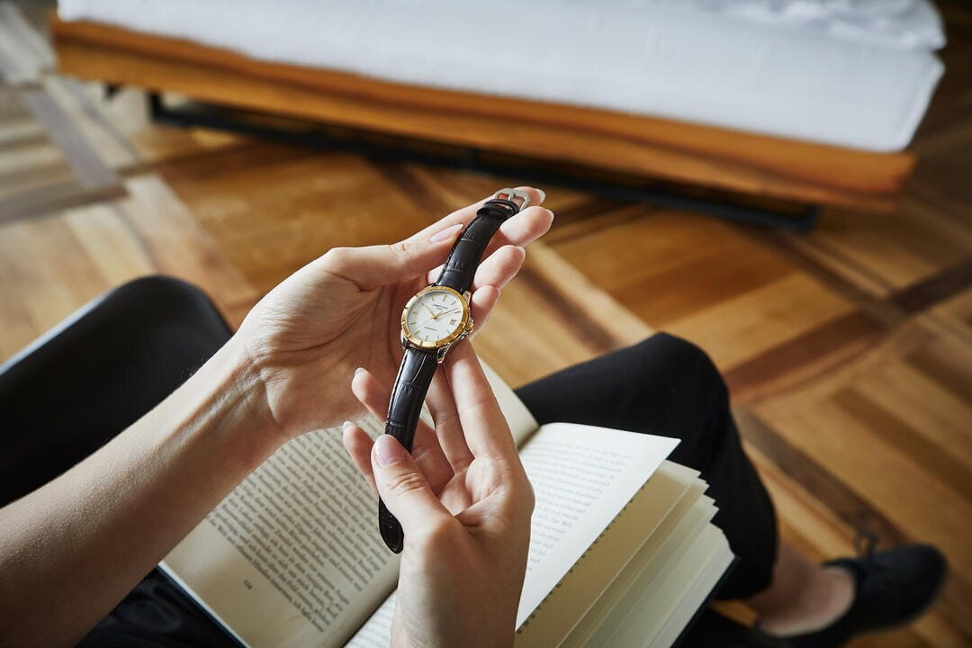 Стильный аксессуар для делового образа оснащён фигурным безелемБезельВнешний ободок, закрепляющий стекло. В спортивных часах так называется поворотное кольцо с делениями на циферблате, выполняет роль таймера – замеряет отрезки времени на шкале. Неподвижный безель – элемент декора. Однонаправленно вращающийся безель на дайверских часах позволяет фиксировать моменты погружения и выныривания на поверхность., выполненным из 18-ти каратного жёлтого золота18-каратное золотоОбозначение по каратной системе пробирования, оно показывает, сколько драгоценного металла содержится в изделии. 18 карат - в составе 75% чистого золота, соответствует 750 пробе.