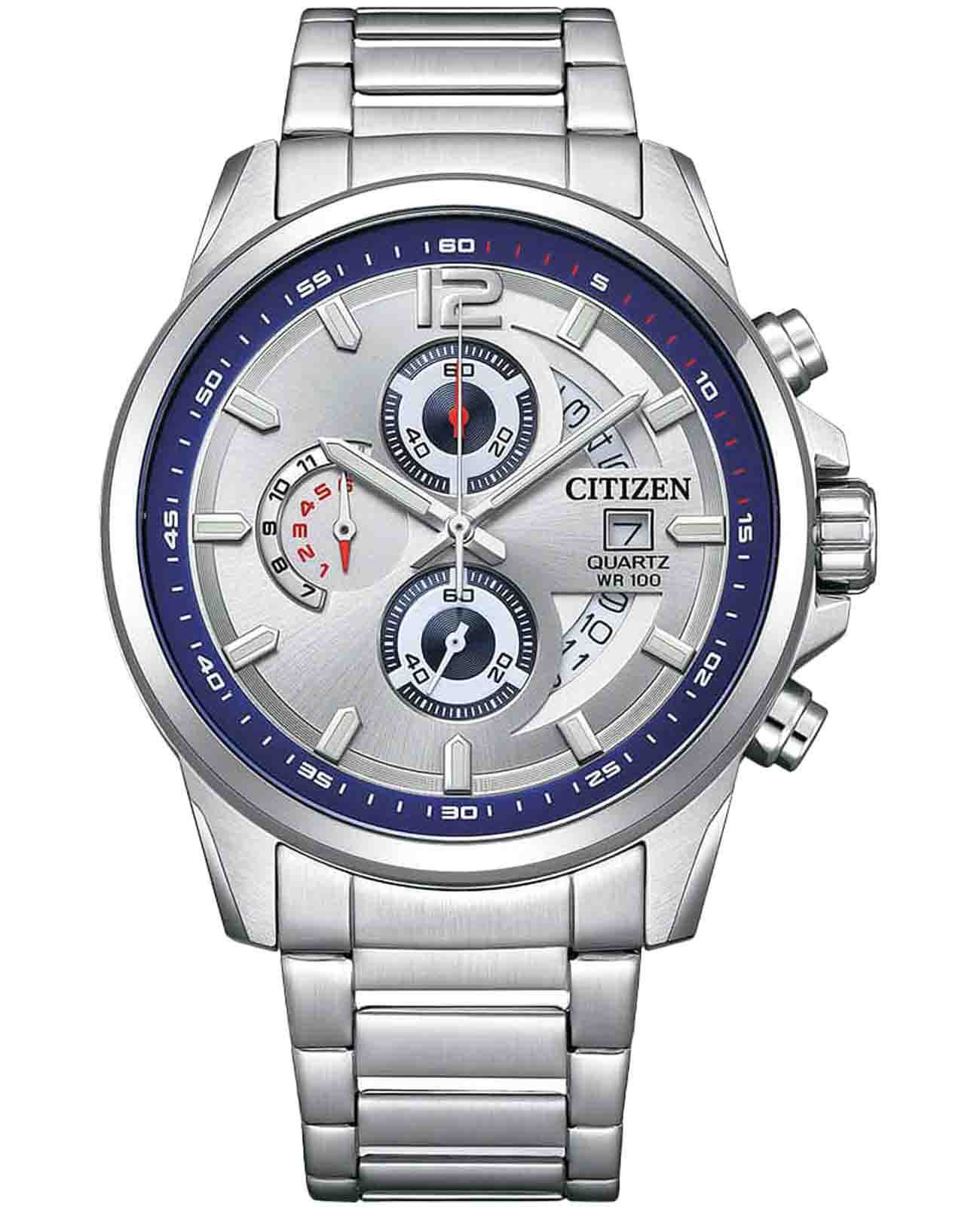 Citizen Chronograph AN3690-56B часы-хронографХронографФункция позволяет измерять отрезки времени с особой точностью: часы, минуты, секунды. Верным признаком хронографа является наличие на циферблате 3 дополнительных окошек-счётчиков. с секундомеромСекундомерСекундоме́р — прибор, способный измерять интервалы времени с точностью до долей секунды. спортивного дизайна с высоким уровнем водозащиты. Корпус из нержавеющей стали диаметром 44 мм идеально сбалансирован. Минеральное стеклоМинеральное стеклоМинеральное стекло представляет собой искусственно выращенный минерал кварца. Такое стекло отличается особой устойчивостью к повреждениям и царапинам. Уступает по некоторым качествам сапфировому стеклу. обеспечивает отличную защиту циферблата от царапин. Часы работают на основе кварцевого механизма. Стальной браслет на раскладной застёжкеРаскладная застёжкаТакой тип застёжки используется только на браслетах из металла. Она никогда не раскрывается полностью, происходит разделение на 2 и более частей. Раскладывающая застёжка снизит вероятность потери часов к минимуму. идеально дополняют дизайн часов, обеспечивая комфортное ношение. Секундомер с точностью 1с и временем измерения 12ч отображается центральной стрелкой. Циферблат с метками в виде штрихов выполнен по технологии Sunray (солнечные лучи). Окошко даты находится в положении 3 часа. Заводная головка с защитой. Часы обладают впечатляющей водонепроницаемостью до 100WR, что делает их идеальными для повседневной носки.