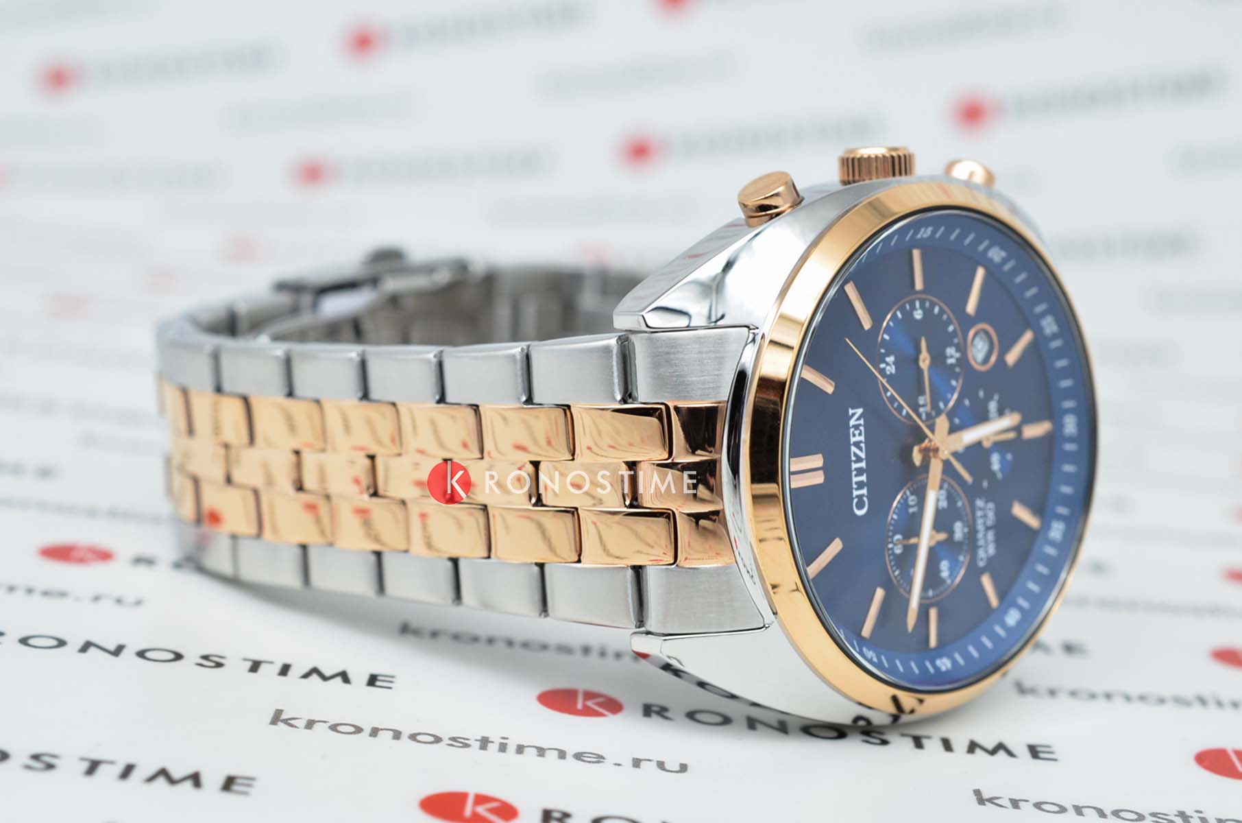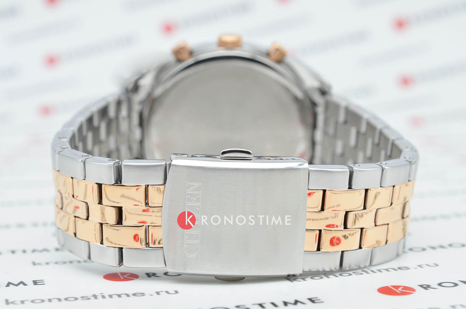 Citizen Chronograph AN8216-50L часы-хронографХронографФункция позволяет измерять отрезки времени с особой точностью: часы, минуты, секунды. Верным признаком хронографа является наличие на циферблате 3 дополнительных окошек-счётчиков. с секундомеромСекундомерСекундоме́р — прибор, способный измерять интервалы времени с точностью до долей секунды.. Корпус из нержавеющей стали диаметром 42 мм идеально сбалансирован. Минеральное стеклоМинеральное стеклоМинеральное стекло представляет собой искусственно выращенный минерал кварца. Такое стекло отличается особой устойчивостью к повреждениям и царапинам. Уступает по некоторым качествам сапфировому стеклу. обеспечивает отличную защиту циферблата от царапин. Часы работают на основе кварцевого механизма. Стальной браслет на раскладной застёжкеРаскладная застёжкаТакой тип застёжки используется только на браслетах из металла. Она никогда не раскрывается полностью, происходит разделение на 2 и более частей. Раскладывающая застёжка снизит вероятность потери часов к минимуму. идеально дополняют дизайн часов, обеспечивая комфортное ношение. БезельБезельВнешний ободок, закрепляющий стекло. В спортивных часах так называется поворотное кольцо с делениями на циферблате, выполняет роль таймера – замеряет отрезки времени на шкале. Неподвижный безель – элемент декора. Однонаправленно вращающийся безель на дайверских часах позволяет фиксировать моменты погружения и выныривания на поверхность. с IP-покрытиемIP-покрытиеМетод ионного напыления. Демонстрирует повышенную устойчивость к истиранию, окислению и химическим веществам. Под воздействием высокого давления и температуры около 1500°C молекулы металла надёжно соединяются с частицами корпуса часов.. Секундомер с точностью показаний 1c и временем измерения 60мин. Окошко даты находится между часовыми отметками 4 и 5. 12-ти и 24-х часовой формат времени отображается на отдельном циферблате. Циферблат с метками в виде штрихов выполнен по технологии Sunray (солнечные лучи). Заводная головка с защитой. Часы обладают водонепроницаемостью до 50WR, что делает их идеальными для повседневной носки.