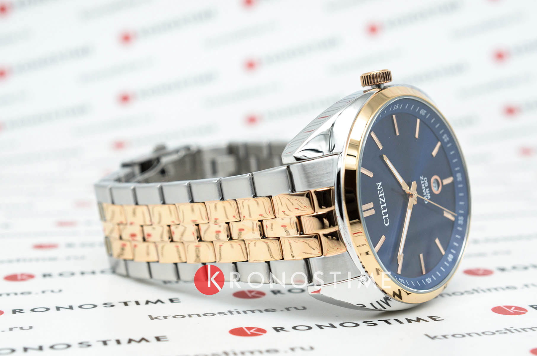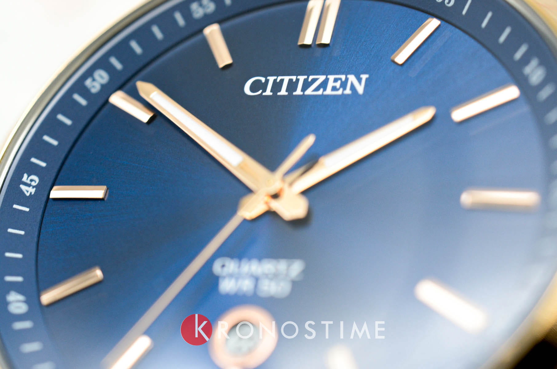 Часы Citizen BI5096-53L — это стильная и надежная модель японского производства, оснащённая высокоточным кварцевым механизмом Citizen G111. Круглый корпус диаметром 42 мм выполнен из нержавеющей стали, что придаёт изделию элегантный и современный вид, а также защищает от внешних воздействий. БезельБезельВнешний ободок, закрепляющий стекло. В спортивных часах так называется поворотное кольцо с делениями на циферблате, выполняет роль таймера – замеряет отрезки времени на шкале. Неподвижный безель – элемент декора. Однонаправленно вращающийся безель на дайверских часах позволяет фиксировать моменты погружения и выныривания на поверхность. с элегантным золотистым IP-покрытиемIP-покрытиеМетод ионного напыления. Демонстрирует повышенную устойчивость к истиранию, окислению и химическим веществам. Под воздействием высокого давления и температуры около 1500°C молекулы металла надёжно соединяются с частицами корпуса часов.. Синий циферблат оформлен минималистично, с метками в виде аккуратных штрихов и заострёнными прямоугольными стрелками в стиле Baton с люминесцентным покрытиемЛюминесцентное покрытиеПозволяет считывать показания времени в темноте. Производители наносят на стрелки, часовые индексы, безель или поверхность циферблата светонакопительный состав, дающий холодное свечение. для удобного считывания времени даже в темноте. Минеральное стеклоМинеральное стеклоМинеральное стекло представляет собой искусственно выращенный минерал кварца. Такое стекло отличается особой устойчивостью к повреждениям и царапинам. Уступает по некоторым качествам сапфировому стеклу. гарантирует защиту от царапин и сохраняет презентабельный внешний вид на долгое время. Окошко календаря с отображением числа расположено в позиции 6 часов, что добавляет функциональности и подчеркивает современный стиль модели. Рифленая заводная головка обеспечивает лёгкость настройки, а стальной браслет с частичным золотистым IP-покрытиемIP-покрытиеМетод ионного напыления. Демонстрирует повышенную устойчивость к истиранию, окислению и химическим веществам. Под воздействием высокого давления и температуры около 1500°C молекулы металла надёжно соединяются с частицами корпуса часов. и раскладывающейся застёжкой надёжно фиксирует часы на запястье. Водозащита до 50 метров позволяет не опасаться случайного контакта с водой в повседневной жизни.