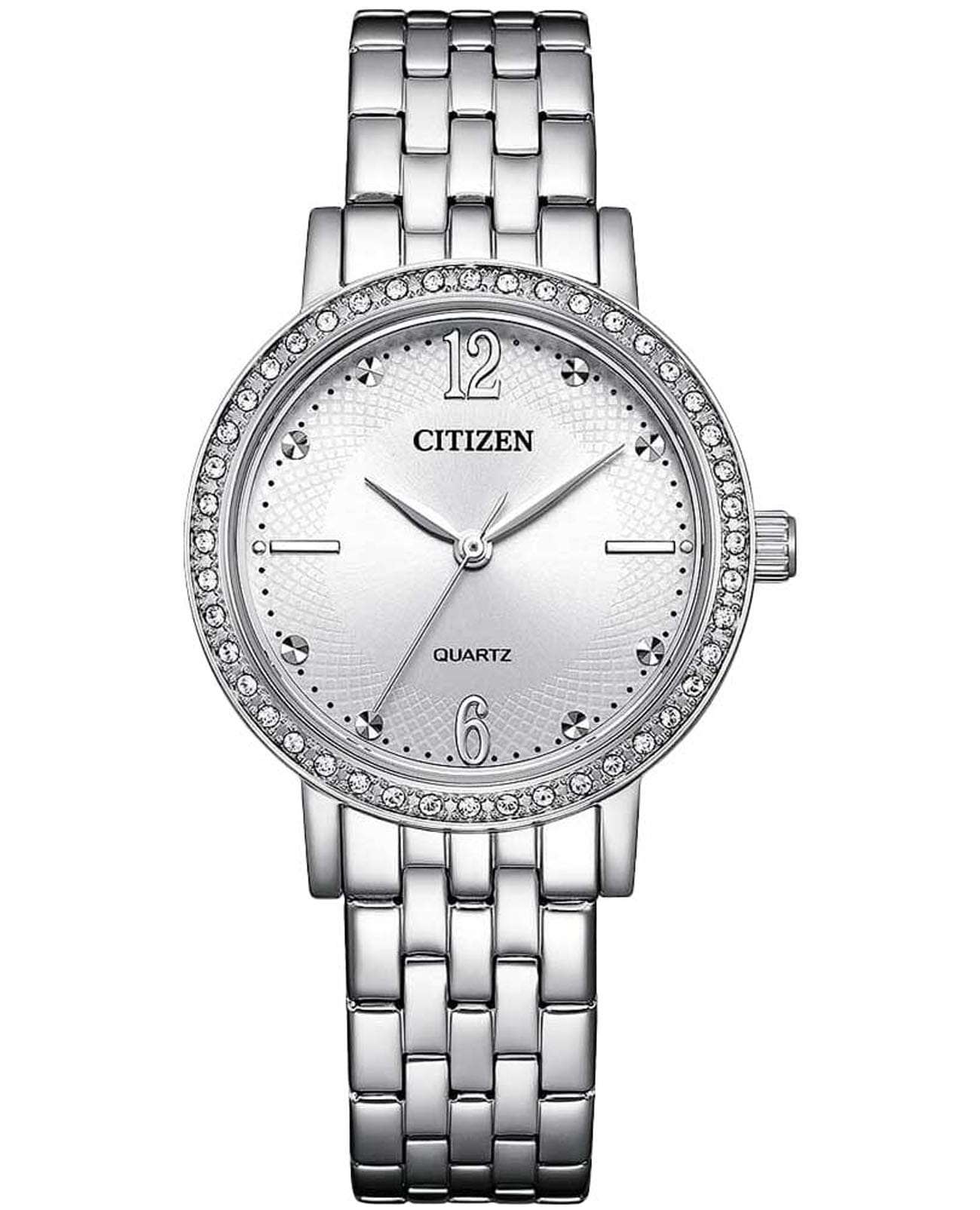 Часы Citizen EL3100-55A представляют собой элегантную модель, выполненную в Японии, сочетающую в себе современные технологии и утончённый дизайн. Корпус и браслет изготовлены из прочной нержавеющей стали, что обеспечивает долговечность и привлекательный внешний вид. Диаметр корпуса составляет 31 мм, а толщина — всего 7 мм, что делает часы изящными и аккуратными на запястье. Особое внимание привлекает безельБезельВнешний ободок, закрепляющий стекло. В спортивных часах так называется поворотное кольцо с делениями на циферблате, выполняет роль таймера – замеряет отрезки времени на шкале. Неподвижный безель – элемент декора. Однонаправленно вращающийся безель на дайверских часах позволяет фиксировать моменты погружения и выныривания на поверхность., украшенный мерцающими кристаллами, которые придают часам особый шарм и изысканность. Надёжный кварцевый механизм гарантирует точность хода, а водозащита уровня WR 50 позволяет не снимать часы при мытье рук или во время дождя. Циферблат украшен часовыми индексами в виде точек и цифр, а также оснащён центральными стрелками часов, минут и секунд для удобного считывания времени и кристаллами. Минеральное стеклоМинеральное стеклоМинеральное стекло представляет собой искусственно выращенный минерал кварца. Такое стекло отличается особой устойчивостью к повреждениям и царапинам. Уступает по некоторым качествам сапфировому стеклу. устойчиво к появлению мелких царапин, сохраняя прозрачность и презентабельный вид. Стальной браслет с раскладной застёжкойРаскладная застёжкаТакой тип застёжки используется только на браслетах из металла. Она никогда не раскрывается полностью, происходит разделение на 2 и более частей. Раскладывающая застёжка снизит вероятность потери часов к минимуму. надежно фиксирует часы на запястье, обеспечивая комфорт при ежедневном ношении.
