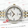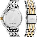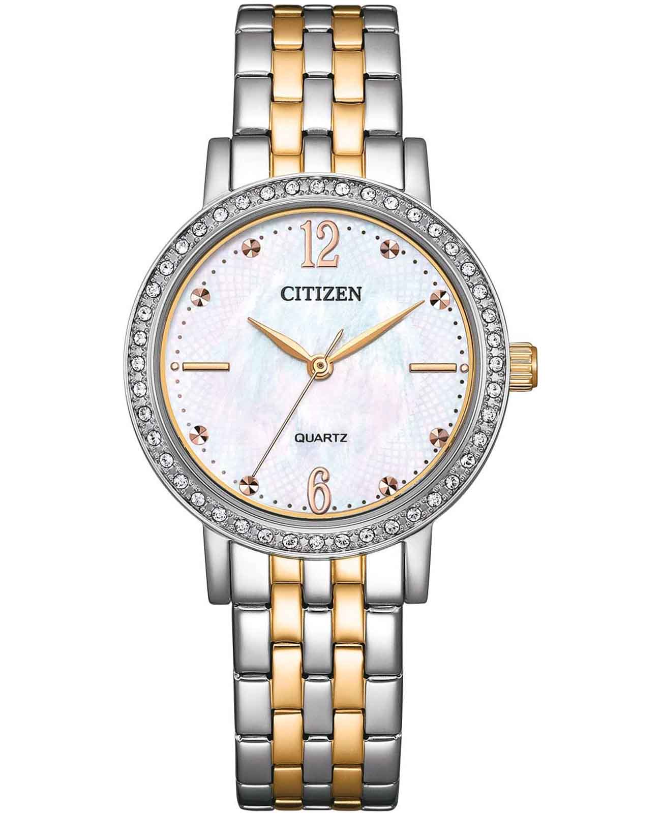Часы Citizen EL3106-59D представляют собой элегантную модель, выполненную в Японии, сочетающую в себе современные технологии и утончённый дизайн. Корпус изготовлен из прочной нержавеющей стали, что обеспечивает долговечность и привлекательный внешний вид. Диаметр корпуса составляет 31 мм, а толщина — всего 7 мм, что делает часы изящными и аккуратными на запястье. Особое внимание привлекает безельБезельВнешний ободок, закрепляющий стекло. В спортивных часах так называется поворотное кольцо с делениями на циферблате, выполняет роль таймера – замеряет отрезки времени на шкале. Неподвижный безель – элемент декора. Однонаправленно вращающийся безель на дайверских часах позволяет фиксировать моменты погружения и выныривания на поверхность., украшенный мерцающими кристаллами, которые придают часам особый шарм и изысканность. Надёжный кварцевый механизм гарантирует точность хода, а водозащита уровня WR 50 позволяет не снимать часы при мытье рук или во время дождя. Перламутровый циферблат украшен часовыми индексами в виде точек и цифр, а также оснащён центральными стрелками часов, минут и секунд для удобного считывания времени и кристаллами. Минеральное стеклоМинеральное стеклоМинеральное стекло представляет собой искусственно выращенный минерал кварца. Такое стекло отличается особой устойчивостью к повреждениям и царапинам. Уступает по некоторым качествам сапфировому стеклу. устойчиво к появлению мелких царапин, сохраняя прозрачность и презентабельный вид. Стальной браслет с частичным золотистым IP-покрытиемIP-покрытиеМетод ионного напыления. Демонстрирует повышенную устойчивость к истиранию, окислению и химическим веществам. Под воздействием высокого давления и температуры около 1500°C молекулы металла надёжно соединяются с частицами корпуса часов. и раскладной застёжкойРаскладная застёжкаТакой тип застёжки используется только на браслетах из металла. Она никогда не раскрывается полностью, происходит разделение на 2 и более частей. Раскладывающая застёжка снизит вероятность потери часов к минимуму. надежно фиксирует часы на запястье, обеспечивая комфорт при ежедневном ношении.