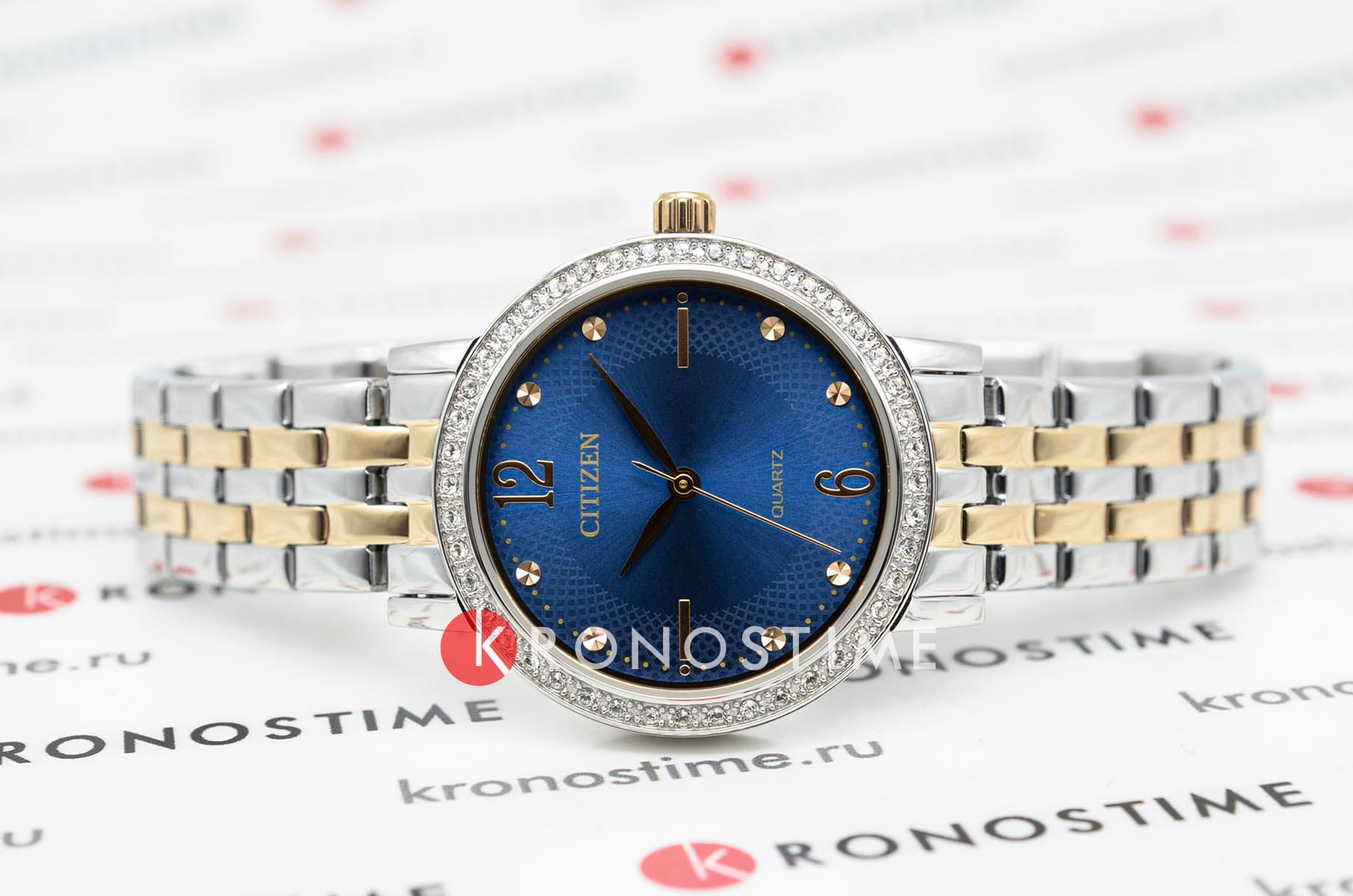 Часы Citizen EL3106-59L представляют собой элегантную модель, выполненную в Японии, сочетающую в себе современные технологии и утончённый дизайн. Корпус  изготовлен из прочной нержавеющей стали, что обеспечивает долговечность и привлекательный внешний вид. Диаметр корпуса составляет 31 мм, а толщина — всего 7 мм, что делает часы изящными и аккуратными на запястье. Особое внимание привлекает безельБезельВнешний ободок, закрепляющий стекло. В спортивных часах так называется поворотное кольцо с делениями на циферблате, выполняет роль таймера – замеряет отрезки времени на шкале. Неподвижный безель – элемент декора. Однонаправленно вращающийся безель на дайверских часах позволяет фиксировать моменты погружения и выныривания на поверхность., украшенный мерцающими кристаллами, которые придают часам особый шарм и изысканность. Надёжный кварцевый механизм гарантирует точность хода, а водозащита уровня WR 50 позволяет не снимать часы при мытье рук или во время дождя. Синий циферблат украшен часовыми индексами в виде точек и цифр, а также оснащён центральными стрелками часов, минут и секунд для удобного считывания времени и кристаллами. Минеральное стеклоМинеральное стеклоМинеральное стекло представляет собой искусственно выращенный минерал кварца. Такое стекло отличается особой устойчивостью к повреждениям и царапинам. Уступает по некоторым качествам сапфировому стеклу. устойчиво к появлению мелких царапин, сохраняя прозрачность и презентабельный вид.  Стальной браслет с частичным золотистым IP-покрытиемIP-покрытиеМетод ионного напыления. Демонстрирует повышенную устойчивость к истиранию, окислению и химическим веществам. Под воздействием высокого давления и температуры около 1500°C молекулы металла надёжно соединяются с частицами корпуса часов. и раскладной застёжкойРаскладная застёжкаТакой тип застёжки используется только на браслетах из металла. Она никогда не раскрывается полностью, происходит разделение на 2 и более частей. Раскладывающая застёжка снизит вероятность потери часов к минимуму. надежно фиксирует часы на запястье, обеспечивая комфорт при ежедневном ношении.