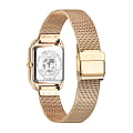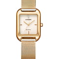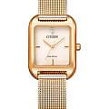 Часы Citizen EM0493-85P созданы для тех, кто ценит элегантность и современные технологии в одном аксессуаре. Корпус выполнен из прочной нержавеющей стали с PVD-покрытиемPVDУльтратонкое покрытие наносится в технике вакуумного напыления, сочетает в себе нитрид титана особой прочности со слоем золота или оксида хрома. Несёт в себе декоративную или защитную функцию. и гармонично сочетается с изысканным стальным золотистым браслетом миланского плетения с раскладным замкомРаскладной замокДанный вариант застежки используется только на часах с металлическим браслетом. Отличительная особенность такого крепления в том, что длина браслета становится универсальной и вы можете самостоятельно отрегулировать нужный вам размер – застежка просто двигается по браслету часов., обеспечивающим комфортную посадку на запястье. Особое внимание привлекает бежевый циферблат, украшенный мерцающими кристаллами, которые придают часам особый шарм и изысканность. Метки выполнены в виде аккуратных штрихов, что обеспечивает лёгкое считывание времени. Часы оснащены надёжным кварцевым механизмом Citizen E031 с инновационной системой Eco-Drive, которая позволяет заряжать устройство от любого источника света и не требует замены батарейки. Запас хода составляет до 180 дней, а функция индикации заряда EOLEOLПредставляет собой систему, уведомляющую владельца часов о необходимости замены элемента питания. За 2 недели до полного разряда батарейки секундная стрелка перестаёт ходить чётко и начинает перепрыгивать на 3-4 деления. своевременно напомнит о необходимости подзарядки. Прочное минеральное стеклоМинеральное стеклоМинеральное стекло представляет собой искусственно выращенный минерал кварца. Такое стекло отличается особой устойчивостью к повреждениям и царапинам. Уступает по некоторым качествам сапфировому стеклу. защищает циферблат от царапин и повреждений, а водозащита до 30 метров позволяет не беспокоиться о случайных брызгах воды. Размер корпуса составляет 24 х 32 мм. Лёгкий вес всего 42 грамма, толщина корпуса 7,7 мм и ширина браслета 14 мм делают эту модель удобной для повседневного ношения и подчёркивают стильный образ.