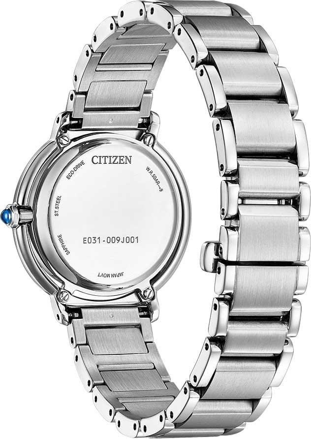Элегантные часы Citizen EM1100-84D произведены в Японии и оснащены современным кварцевым механизмом Citizen E031 с инновационной системой Eco-Drive, которая использует энергию солнечного света и не требует замены батарейки, обеспечивая до 180 дней работы в автономном режиме. Корпус и браслет выполнены из высококачественной нержавеющей стали, что гарантирует долговечность и износостойкость. Перламутровый голубой циферблат с изящными штриховыми метками защищён выпуклым сапфировым стекломСапфировое стеклоПрочный и надёжный материал из кристалла сапфира синтетического происхождения, характеризующийся особой твёрдостью и устойчивостью к царапинам и повреждениям., устойчивым к царапинам. БезельБезельВнешний ободок, закрепляющий стекло. В спортивных часах так называется поворотное кольцо с делениями на циферблате, выполняет роль таймера – замеряет отрезки времени на шкале. Неподвижный безель – элемент декора. Однонаправленно вращающийся безель на дайверских часах позволяет фиксировать моменты погружения и выныривания на поверхность. часов декорирован алмазной гранью, а заводная головка украшена камнем в форме кабошона, что придаёт модели особый шарм. Задняя крышка закреплена на четырёх винтах, что повышает надёжность конструкции. Часы имеют водозащиту до 50 метров, а также функцию индикации заряда и предотвращения перезарядки. Размер корпуса составляет 31,2 мм в диаметре и 8 мм в толщину, вес — 71 грамм. Застежка «бабочка»Застёжка "бабочка"Такой вид застёжки дополняется предохранителями, помогающими избежать случайного раскрытия браслета. Обладают изящным исполнением. у браслета обеспечивает комфортное и надёжное ношение. Эта модель идеально подчеркнёт изысканный стиль и индивидуальность своей обладательницы.