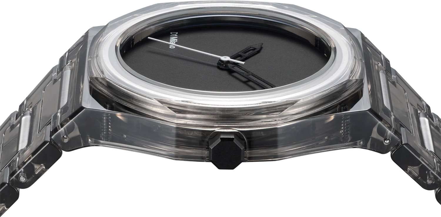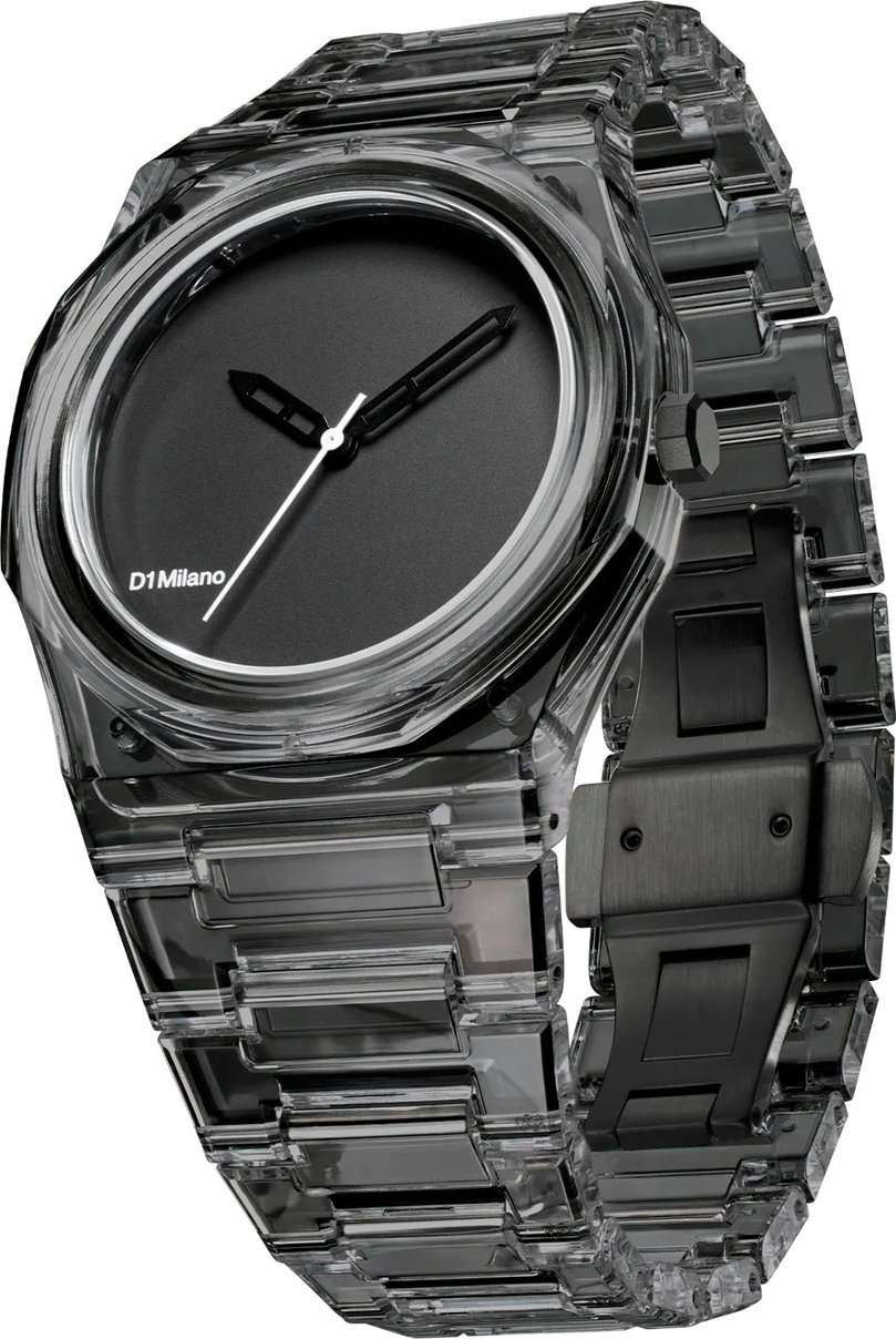 Часы D1 Milano Nylon EXP_Black NYBJ02 – модный и стильный аксессуар-унисекс лаконичного дизайна. Корпус выполнен из прозрачного серого нейлона. Черный матовый циферблат без индексов. Стрелки-скелетон из латуни. Задняя крышка из стали с черным PVD-покрытиемPVDУльтратонкое покрытие наносится в технике вакуумного напыления, сочетает в себе нитрид титана особой прочности со слоем золота или оксида хрома. Несёт в себе декоративную или защитную функцию. закреплена на 4 винтах. Ремешок из прозрачного нейлона имеет застёжку «бабочка» с кнопкамиЗастёжка "бабочка"Такой вид застёжки дополняется предохранителями, помогающими избежать случайного раскрытия браслета. Обладают изящным исполнением. .