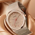 Часы D1 Milano Polycarbon PCBJ36 – молодежные часы в стиле унисекс для повседневных образов. Модель Taupe Mesh имеет бежевый корпус из поликарбоната с покрытием Софт-Тач и блестящий золотистый безельБезельВнешний ободок, закрепляющий стекло. В спортивных часах так называется поворотное кольцо с делениями на циферблате, выполняет роль таймера – замеряет отрезки времени на шкале. Неподвижный безель – элемент декора. Однонаправленно вращающийся безель на дайверских часах позволяет фиксировать моменты погружения и выныривания на поверхность.. Монохромная цветовая гамма тауп, смешанная с розовым золотым покрытием, придает безелю премиальный и изысканный вид. Циферблат лаконичный с индексами в виде штрихов, защищен минеральным стекломМинеральное стеклоМинеральное стекло представляет собой искусственно выращенный минерал кварца. Такое стекло отличается особой устойчивостью к повреждениям и царапинам. Уступает по некоторым качествам сапфировому стеклу. с антибликовым покрытием. Стальная задняя крышка на 4 винтах. Пластиковый браслет на застёжке «бабочка» с кнопкамиЗастёжка "бабочка"Такой вид застёжки дополняется предохранителями, помогающими избежать случайного раскрытия браслета. Обладают изящным исполнением. .