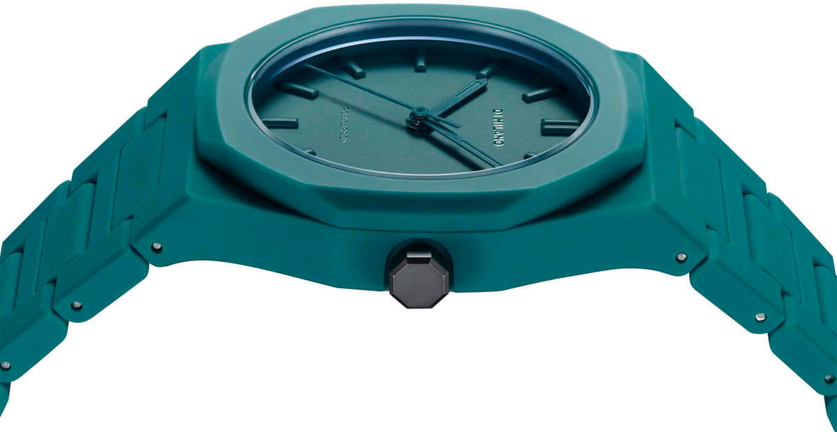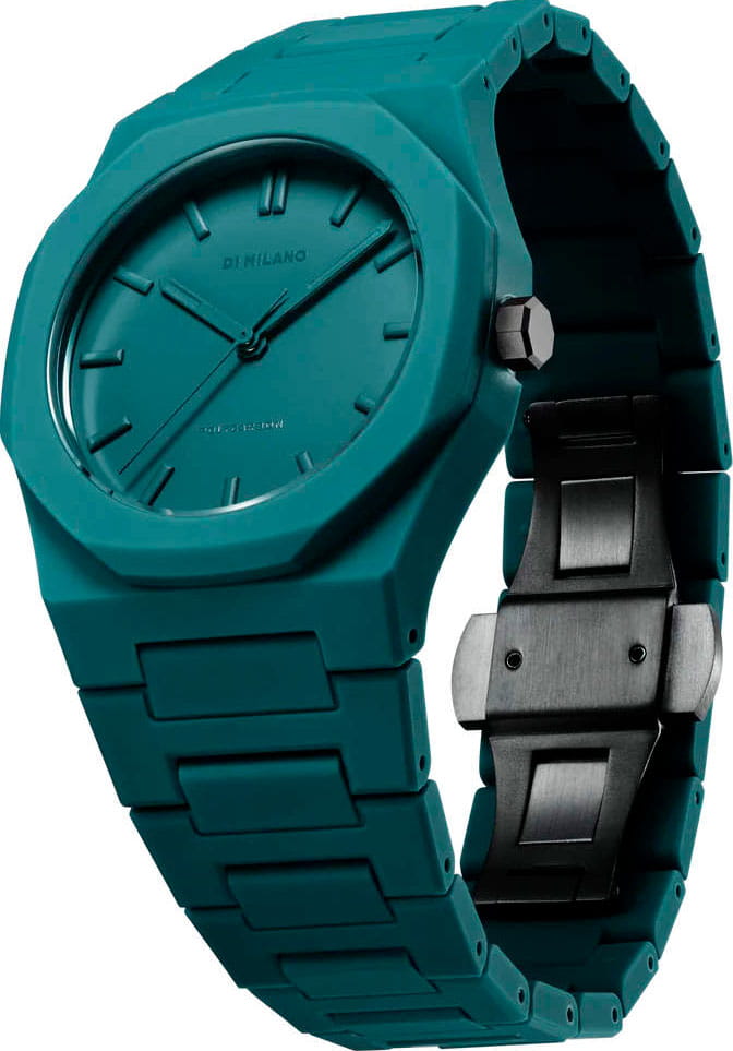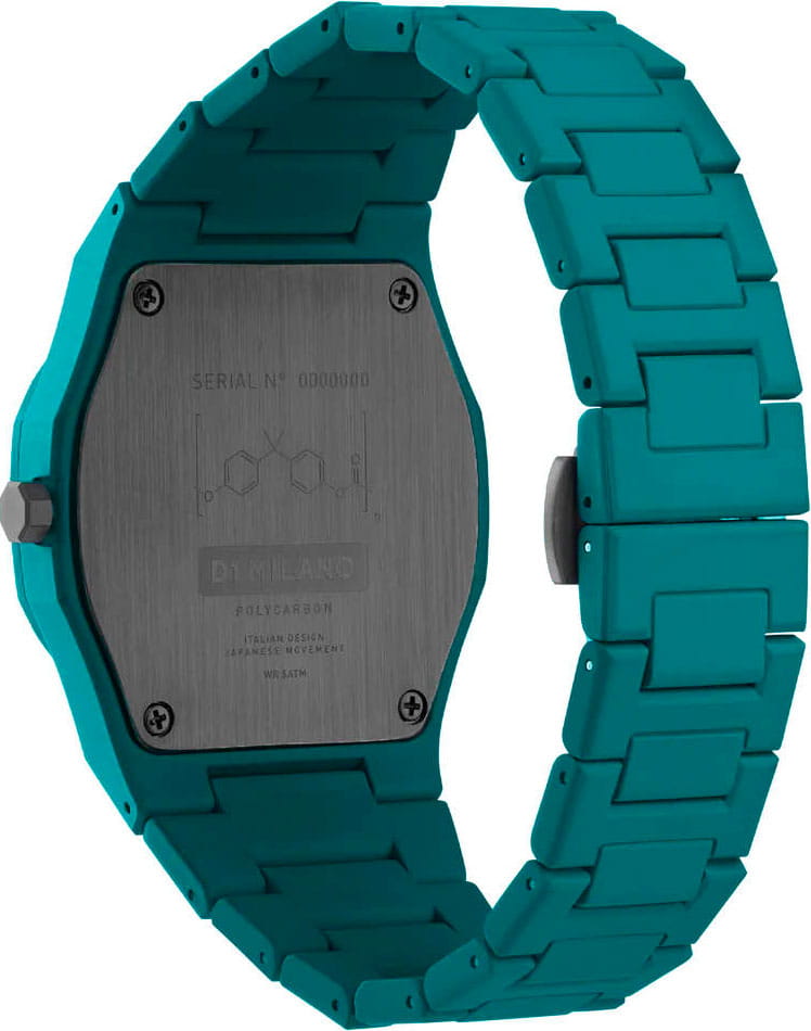 Часы D1 Milano Polycarbon PCBU02 – молодежные часы в стиле унисекс для повседневных образов, стильные и комфортные. Модель Teal имеет зеленый корпус и браслет из поликарбоната с покрытием Софт-Тач. Циферблат лаконичный с индексами в виде штрихов, защищен минеральным стекломМинеральное стеклоМинеральное стекло представляет собой искусственно выращенный минерал кварца. Такое стекло отличается особой устойчивостью к повреждениям и царапинам. Уступает по некоторым качествам сапфировому стеклу. с антибликовым покрытием. Стальная задняя крышка на 4 винтах. Пластиковый браслет на застёжке «бабочка» с кнопкамиЗастёжка "бабочка"Такой вид застёжки дополняется предохранителями, помогающими избежать случайного раскрытия браслета. Обладают изящным исполнением. .